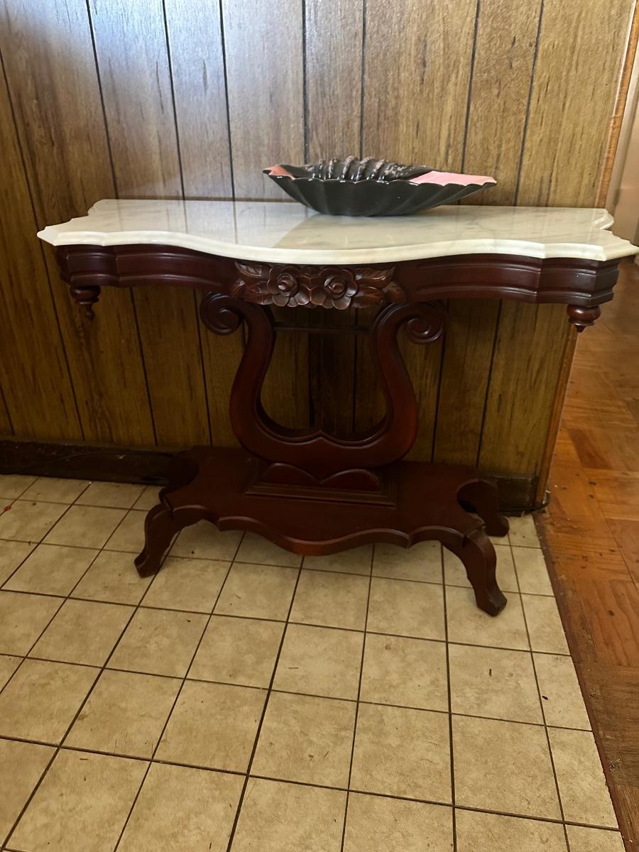 Lovely Victorian marble top table. Measures 28” tall 40” wide