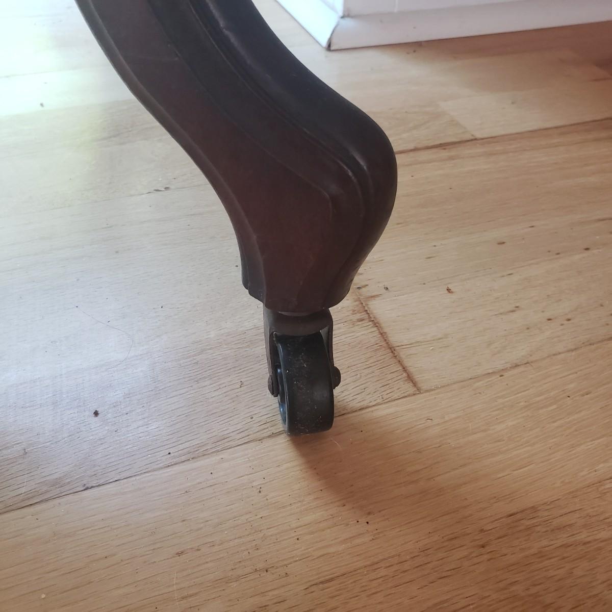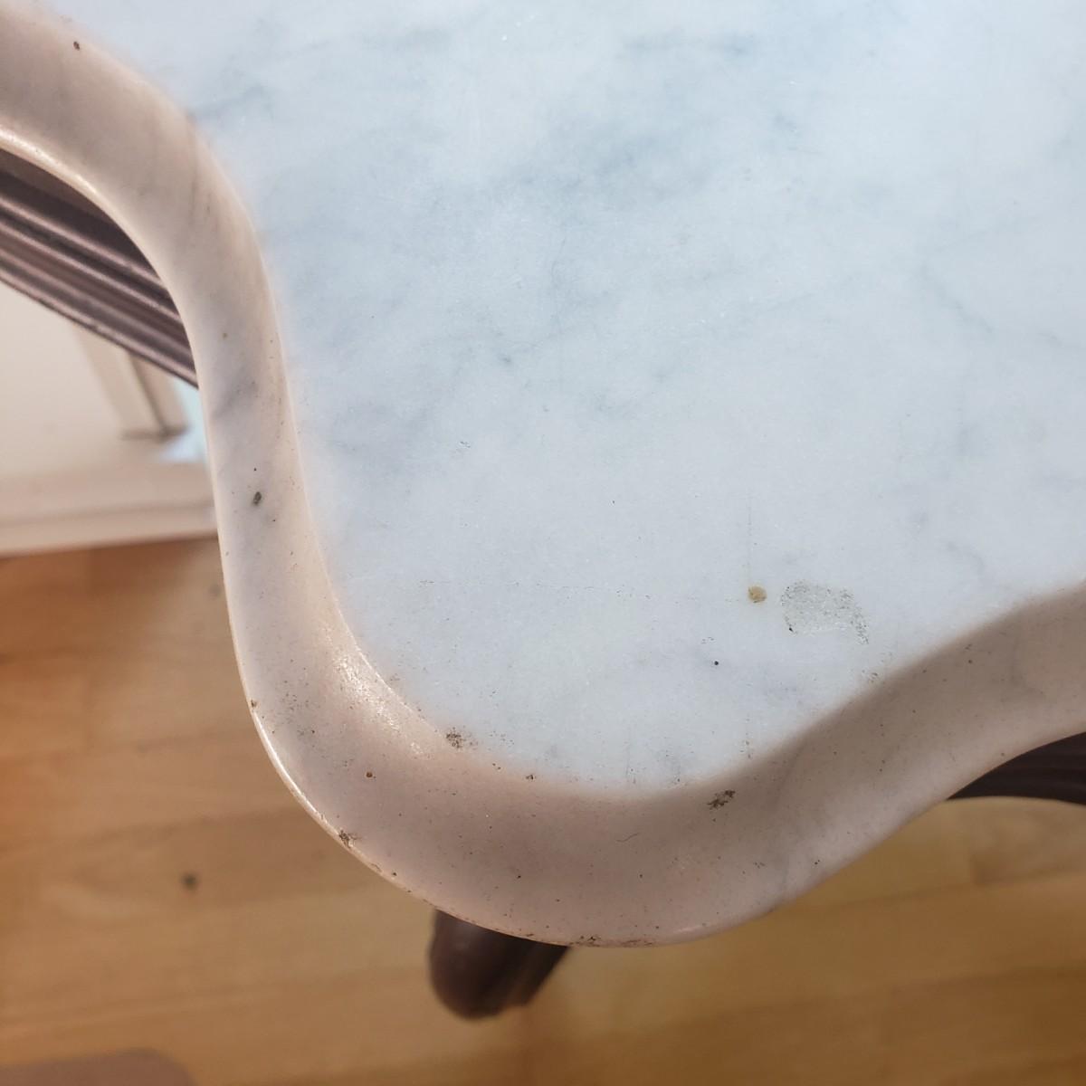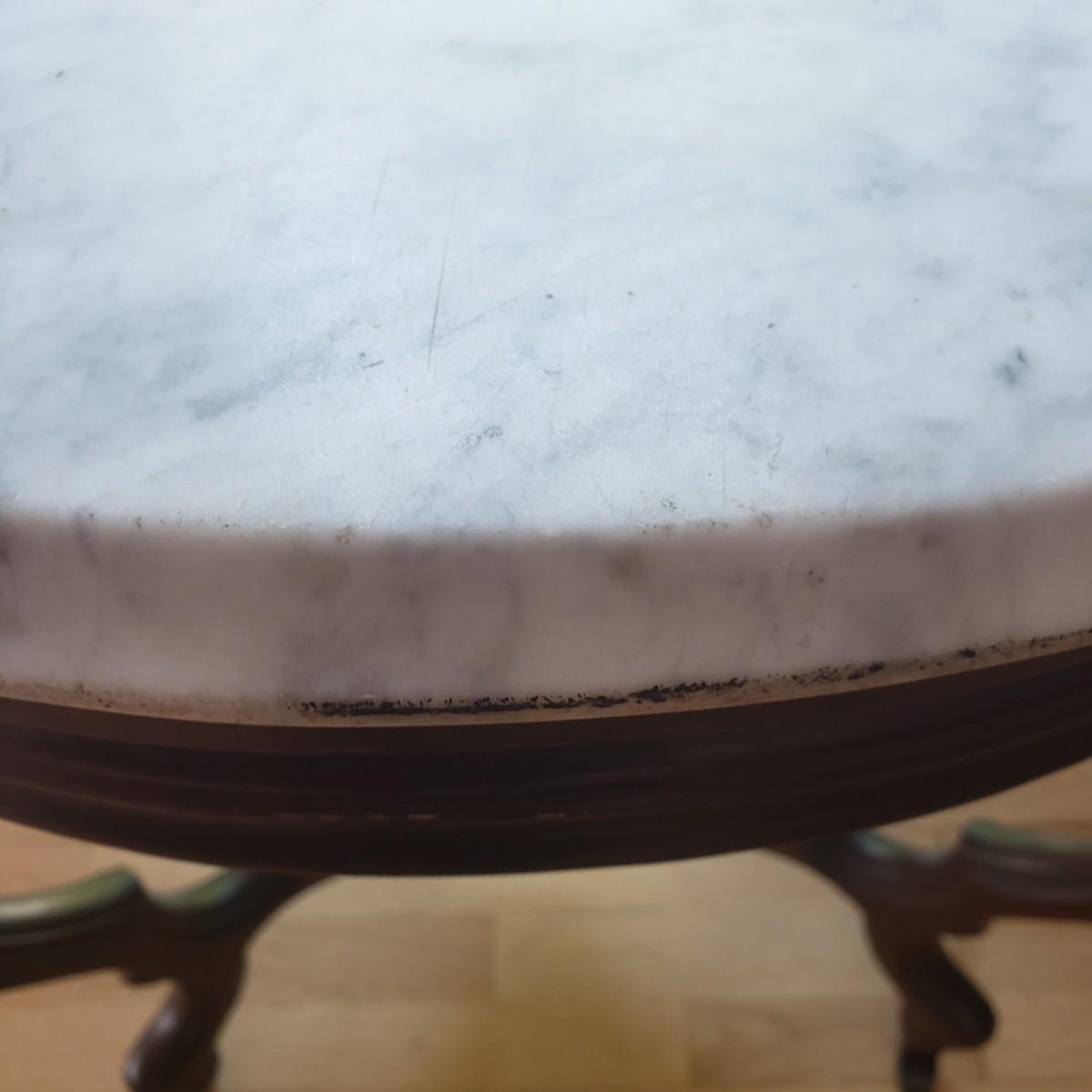 This marble top Victorian-style table measures 36" x 27"x 31" H. The wooden frame sits upon four caster wheels that move with ease. See pictures for details.