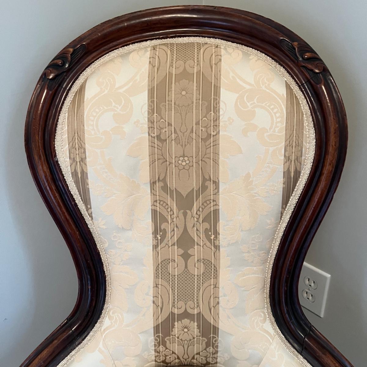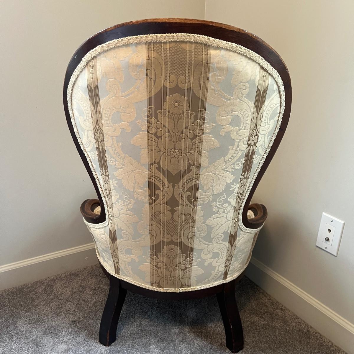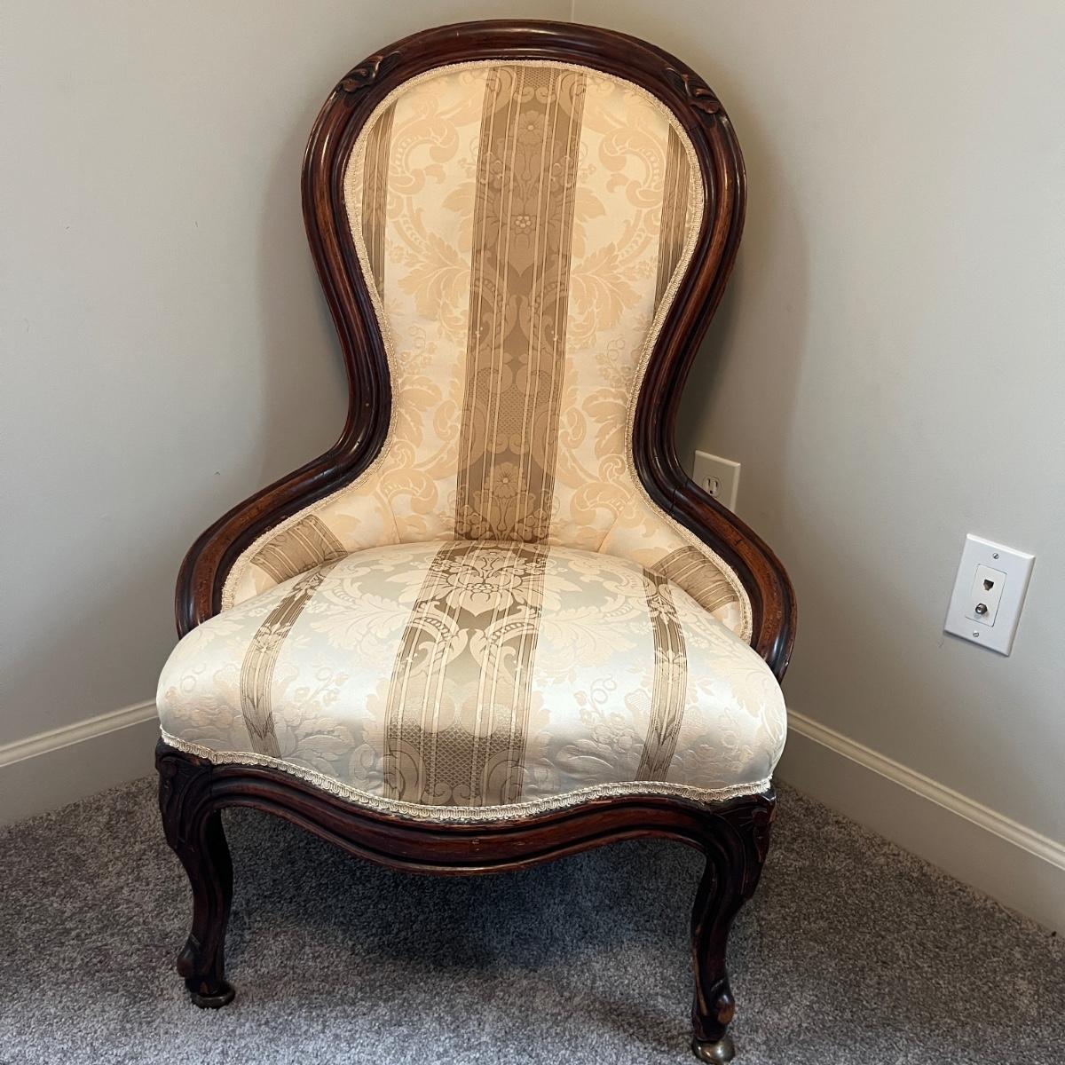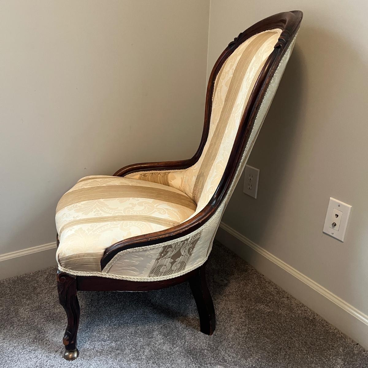 Lot includes a wooden framed Victorian parlor chair with padded and upholstered seat and back. Chair measures 25” x 29” x 38”H with a 16” seat height. Chair has scratches and nicks, see pictures.