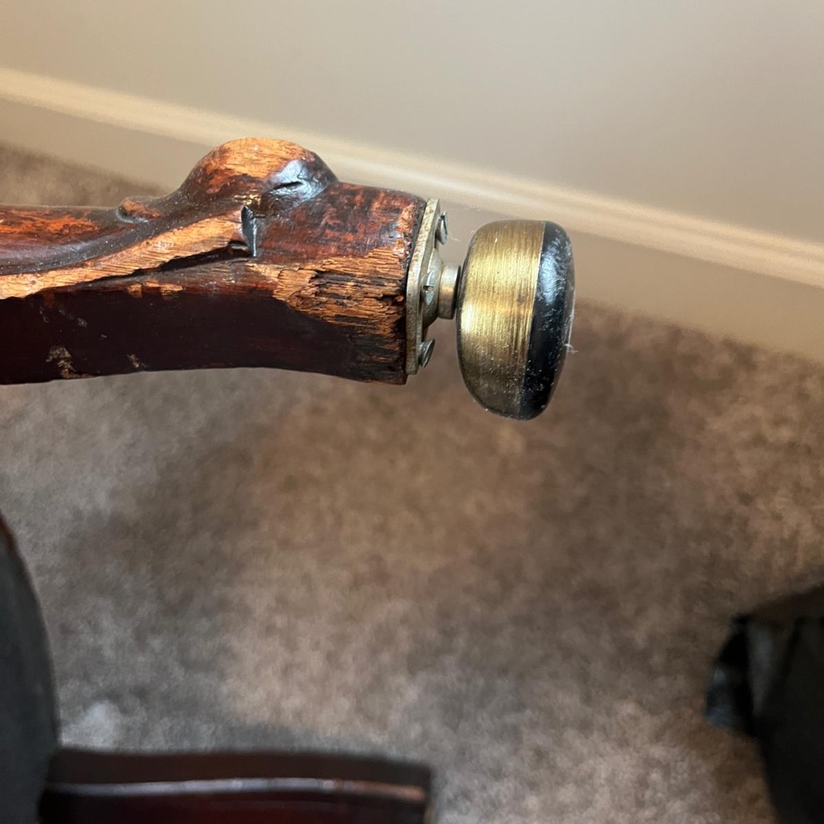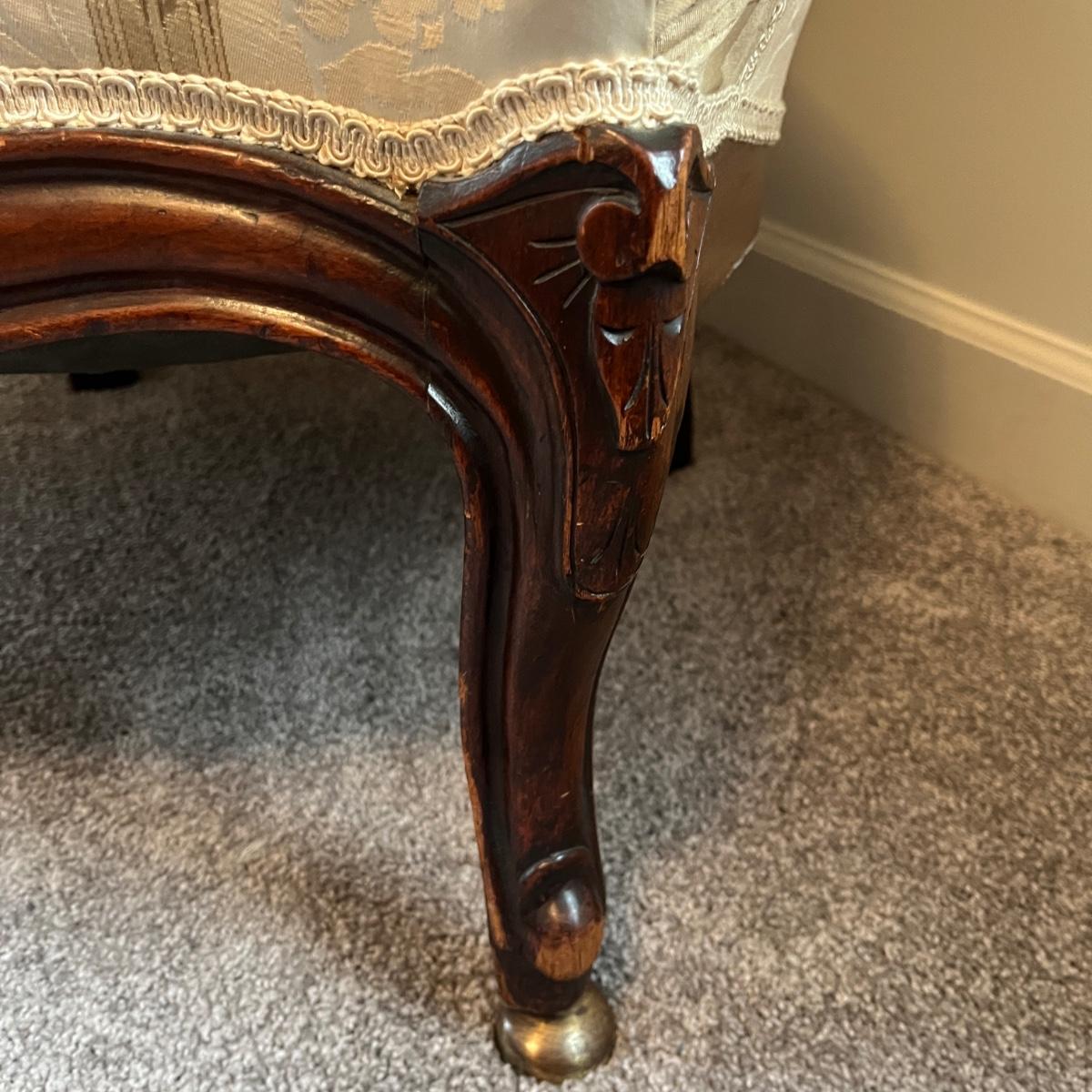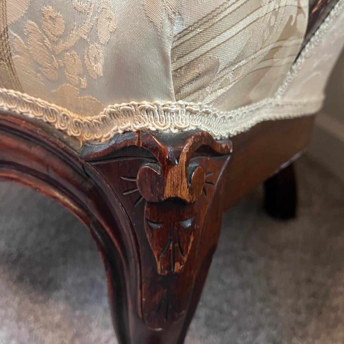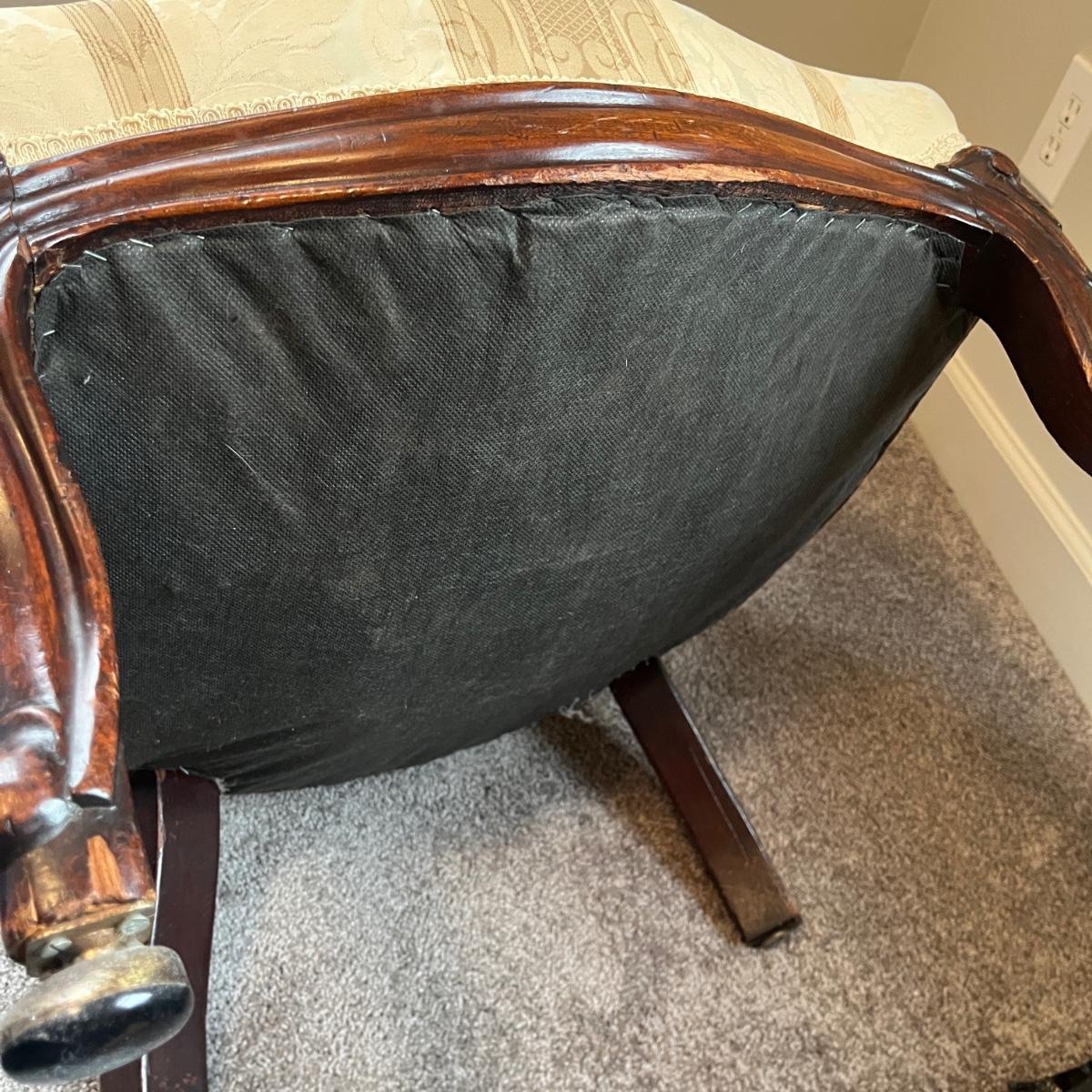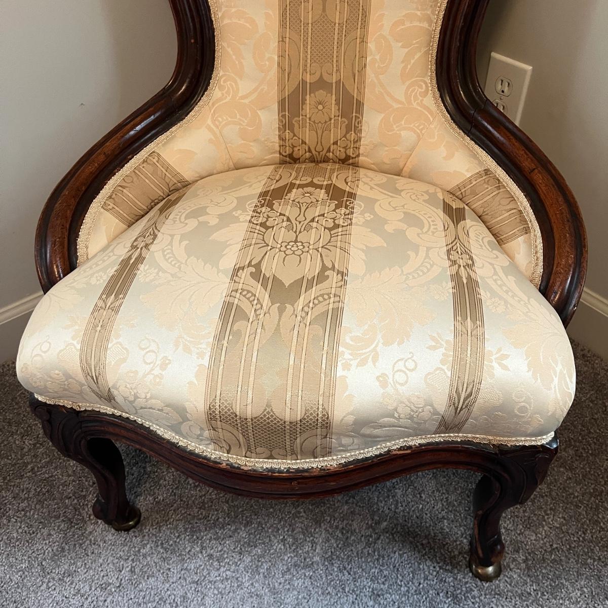 Lot includes a wooden framed Victorian parlor chair with padded and upholstered seat and back. Chair measures 25” x 29” x 38”H with a 16” seat height. Chair has scratches and nicks, see pictures.