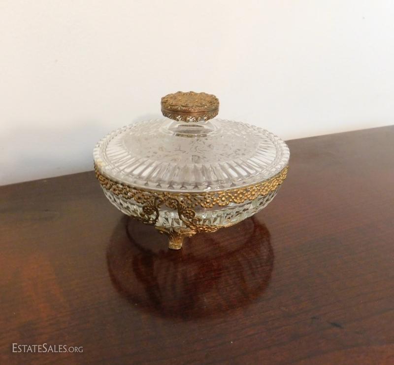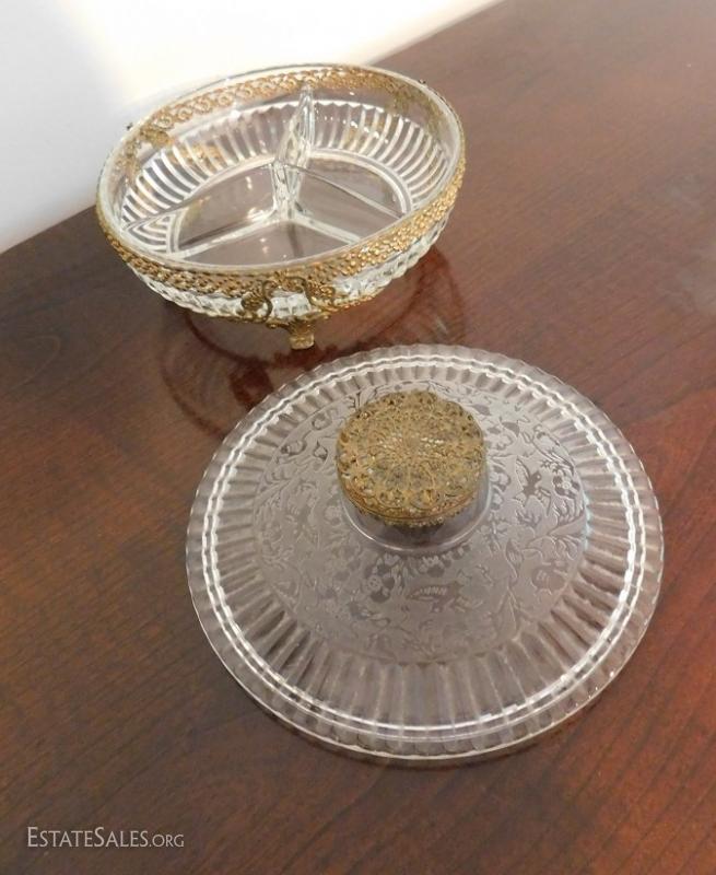 A beautiful antique pressed glass dish with etched lid. Gilded handle and stand. Very nice condition. Shipping available