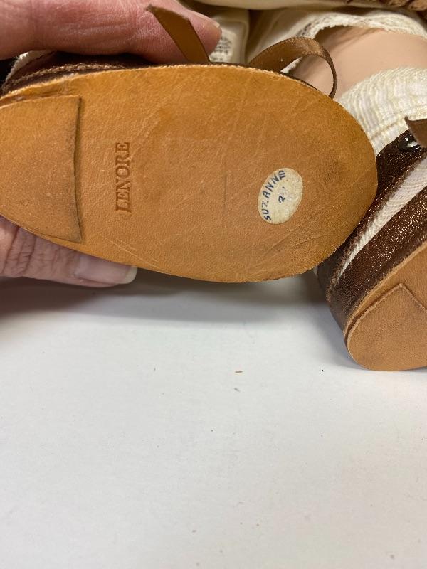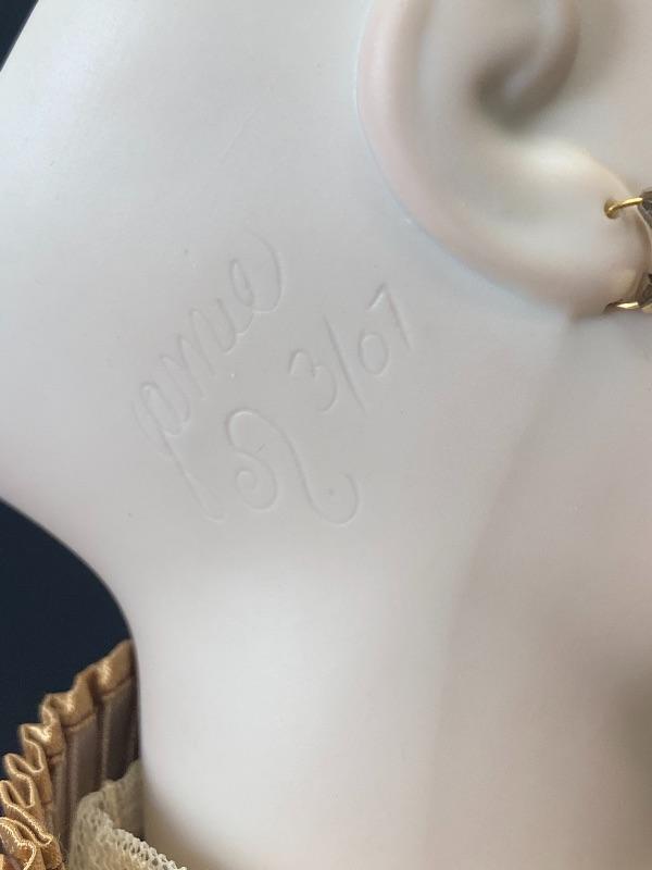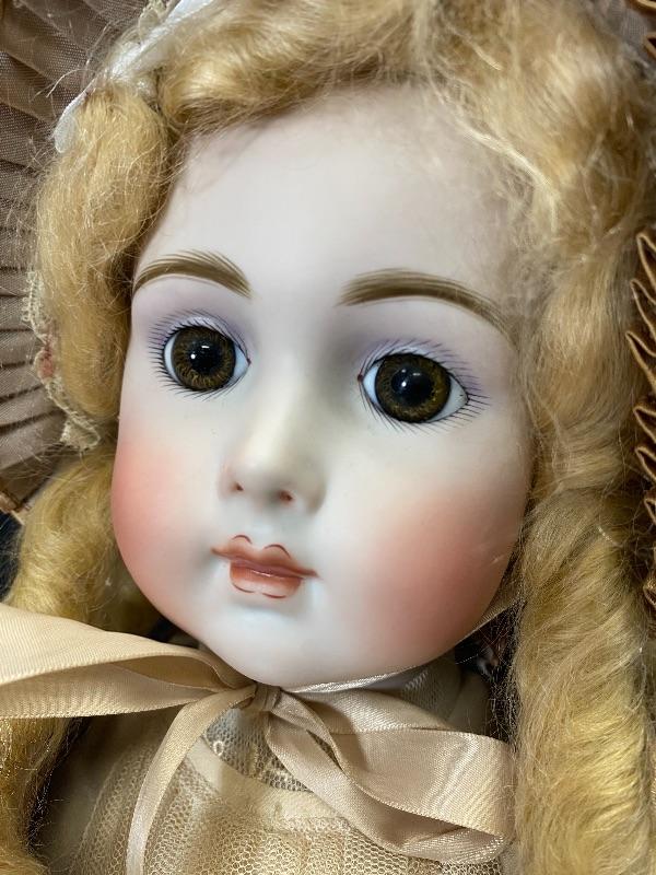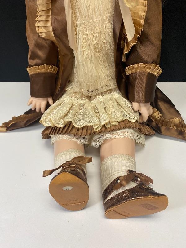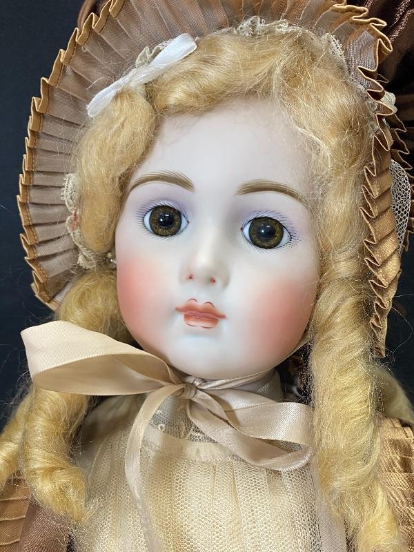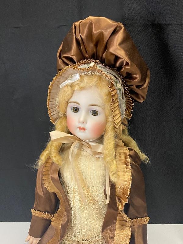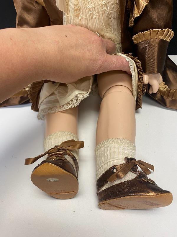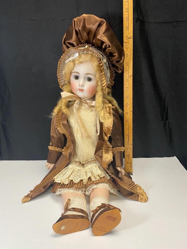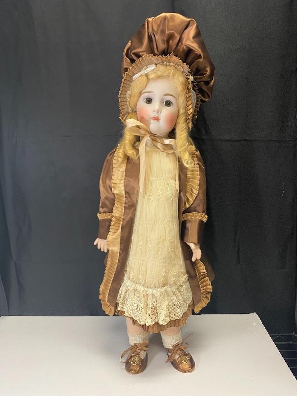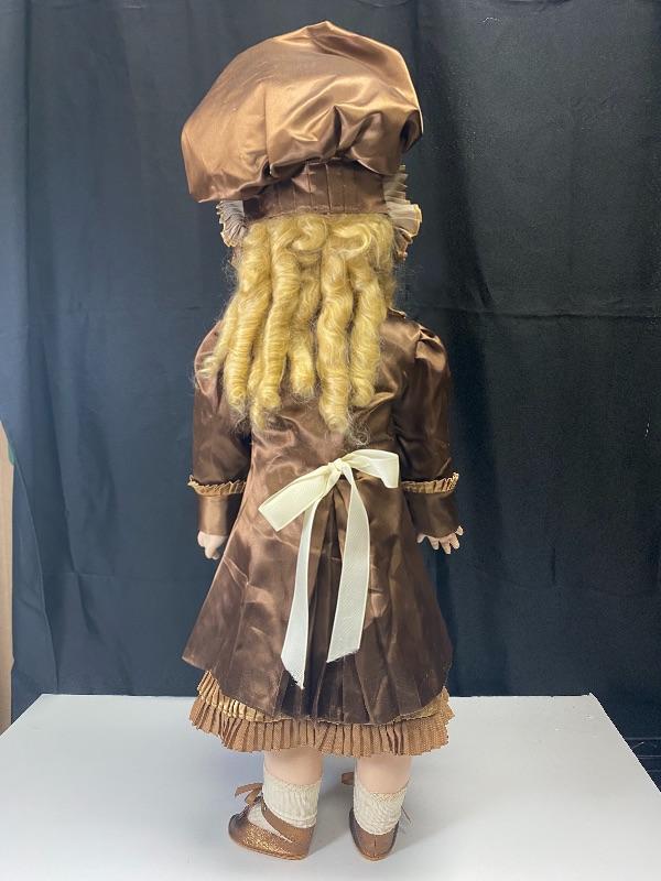 Beautiful Victorian styled doll. Reproduction signed behind the ear. Big brown eyes, blonde mohair wig. Jointed body in good condition. Newer doll parts. Stands about 25". With a little work she does stand on her own, would recommend use with a stand for display.