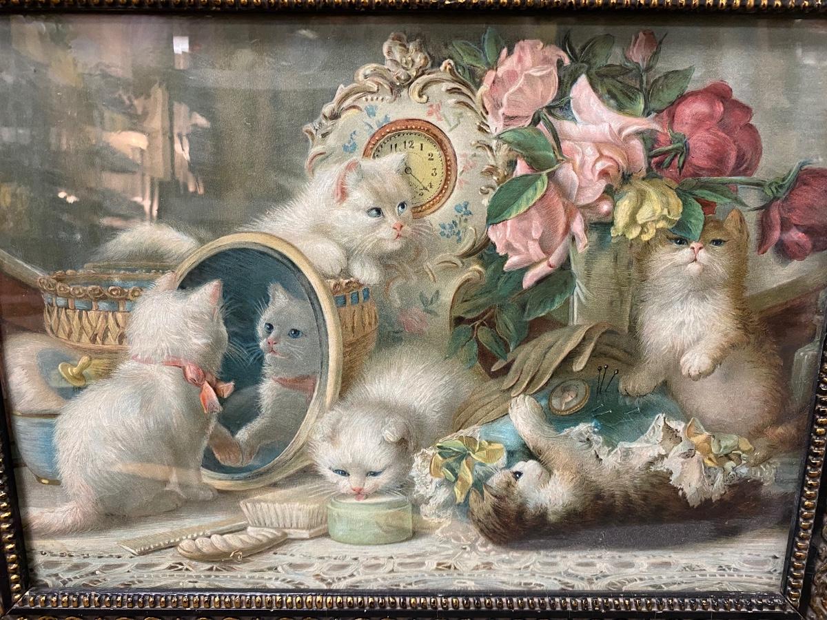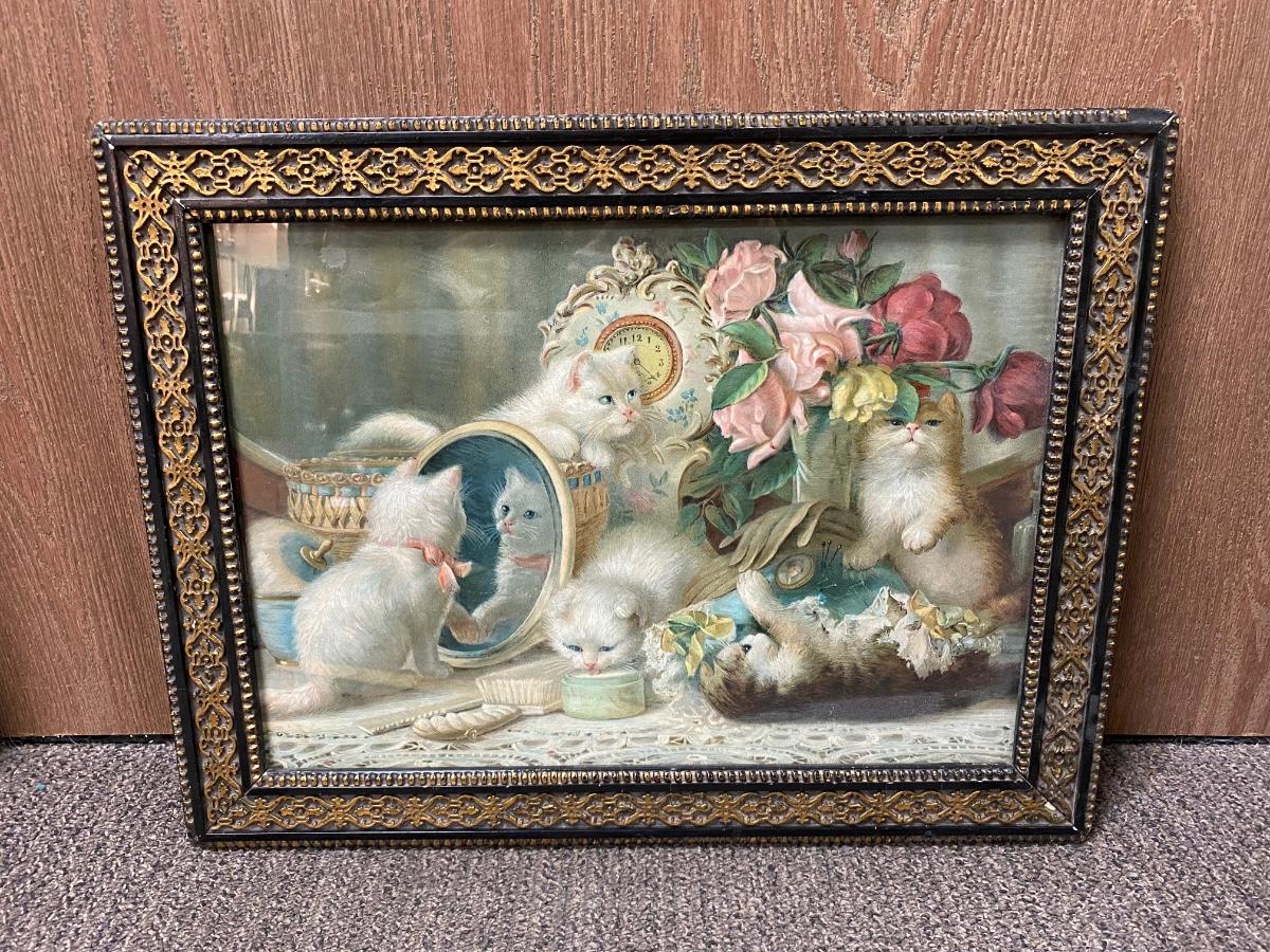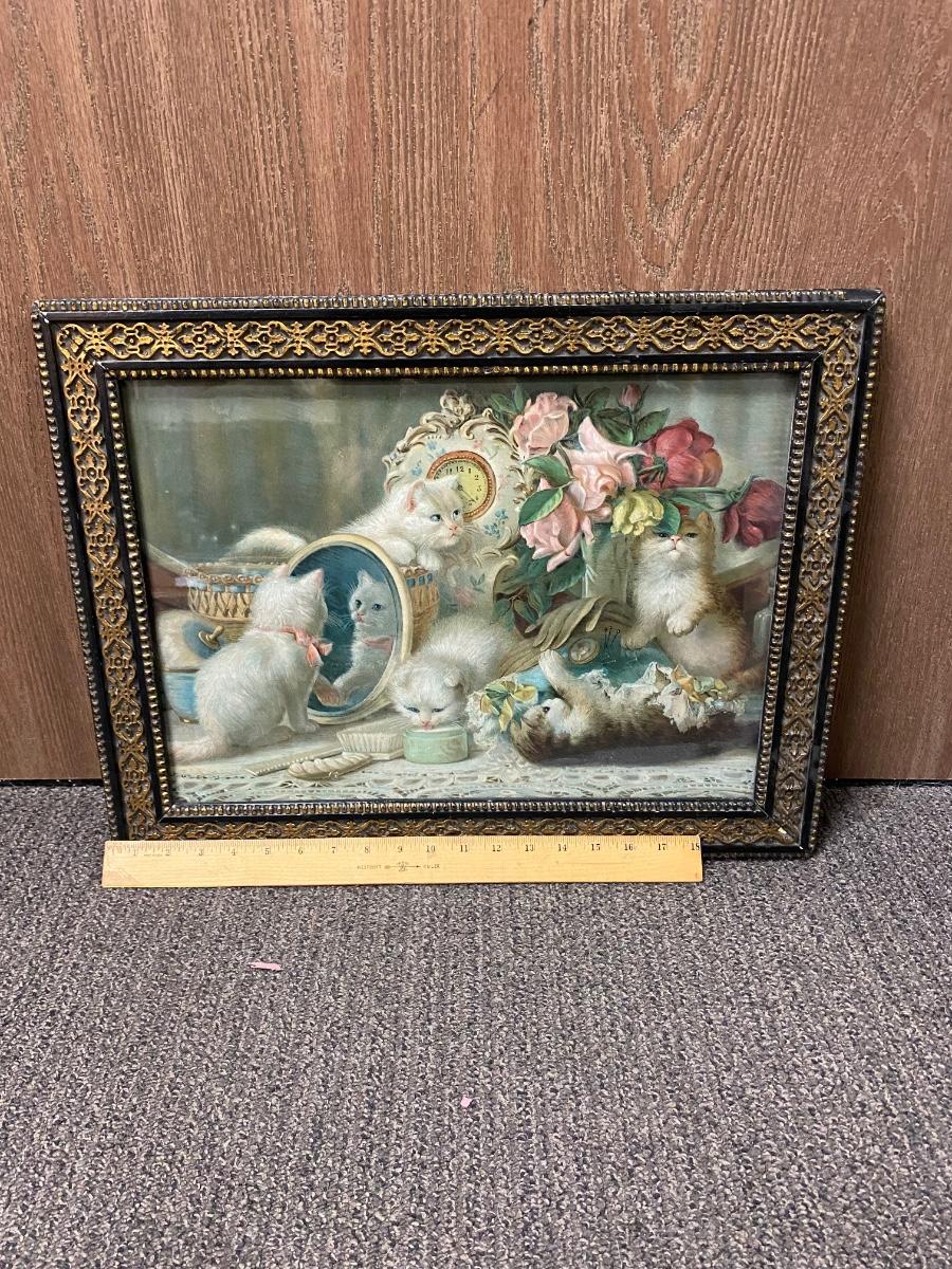 Victorian Romance Kittens on Vanity Table Framed Art Print. Good condition. Nice frame. About 17x21.