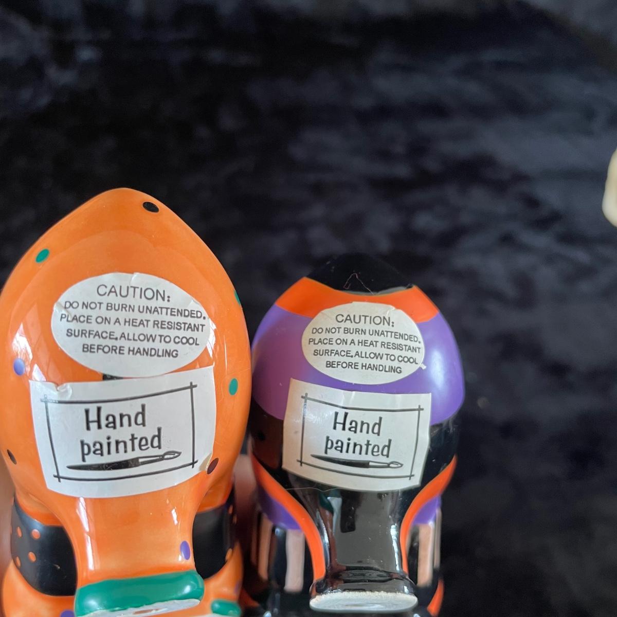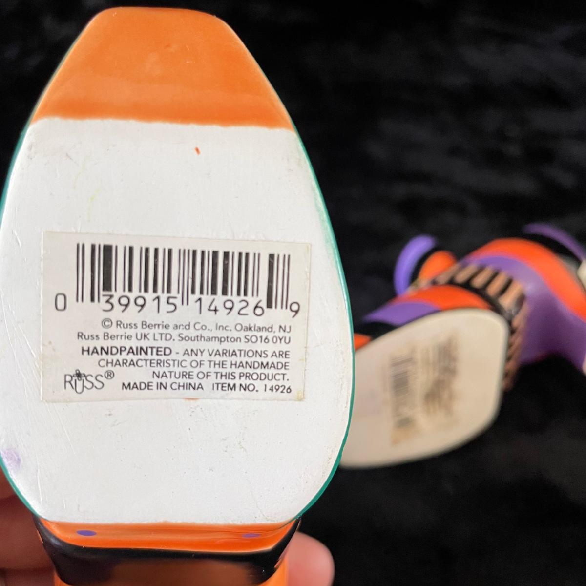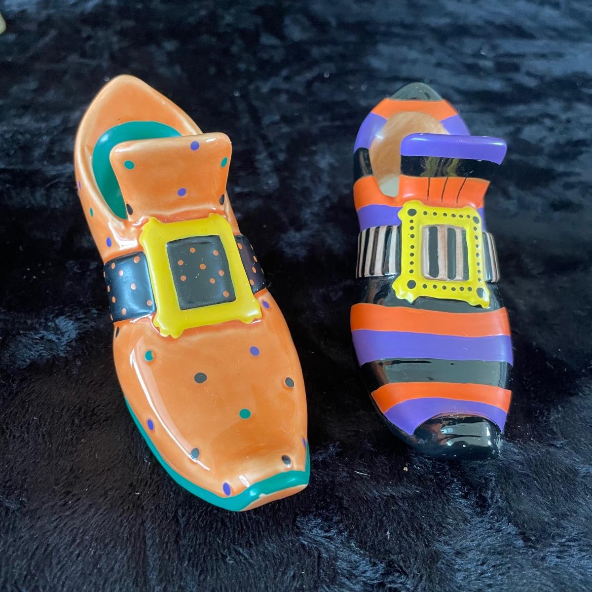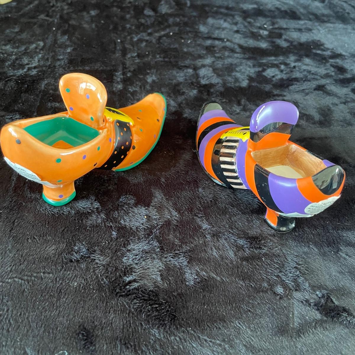 3”H x 4”L x 1 1/2.5”W. (2) Hand painted ceramic witchy shoes 2.5”H x 5”L x 2”W.