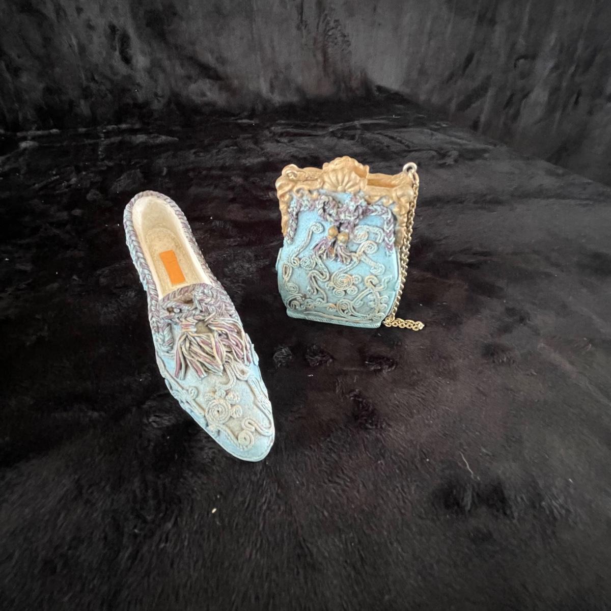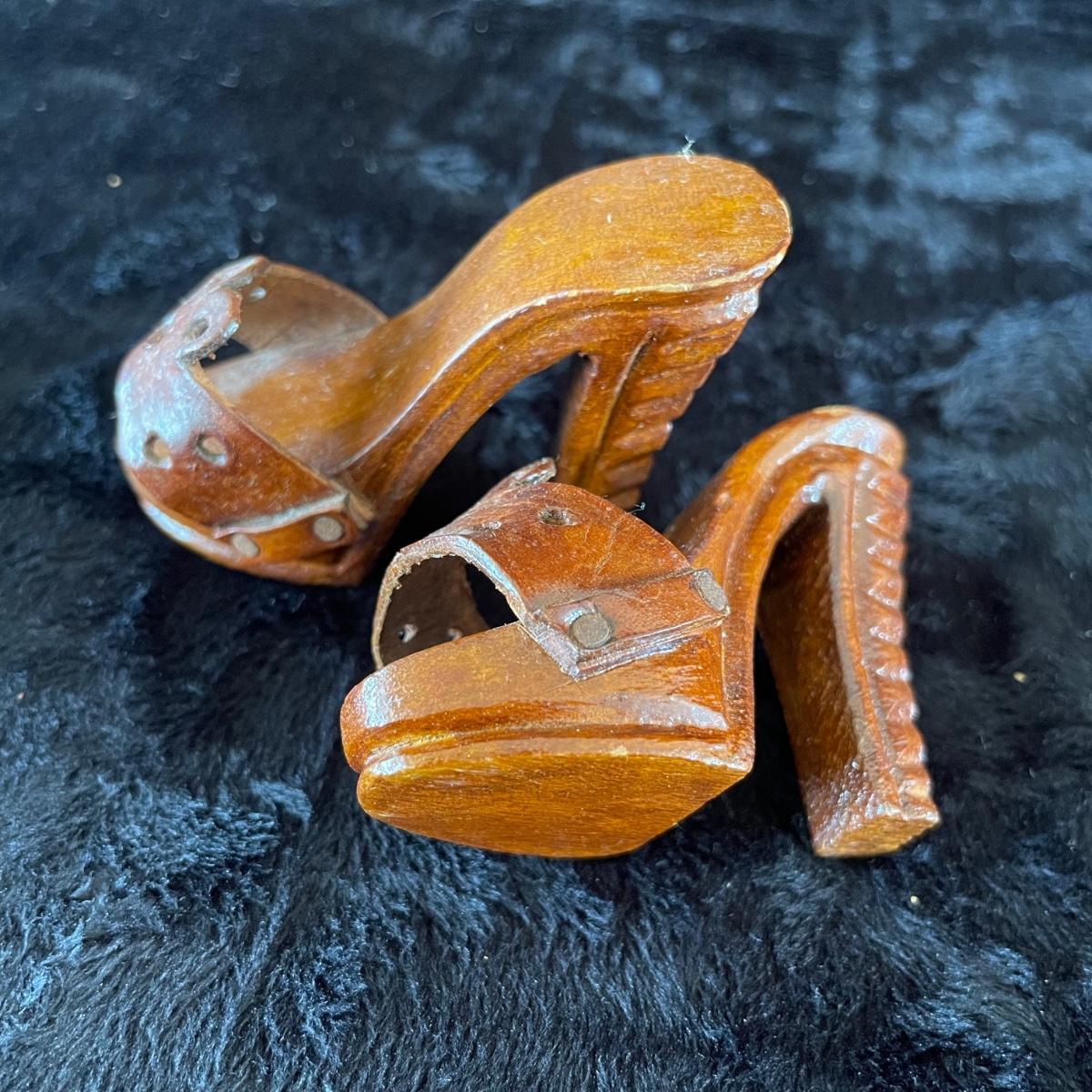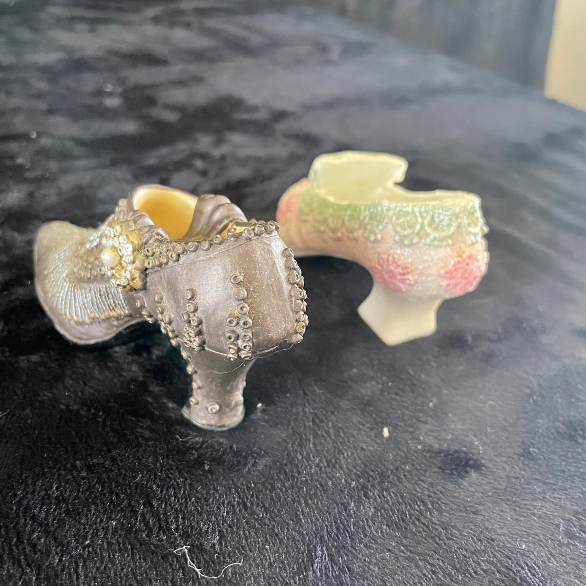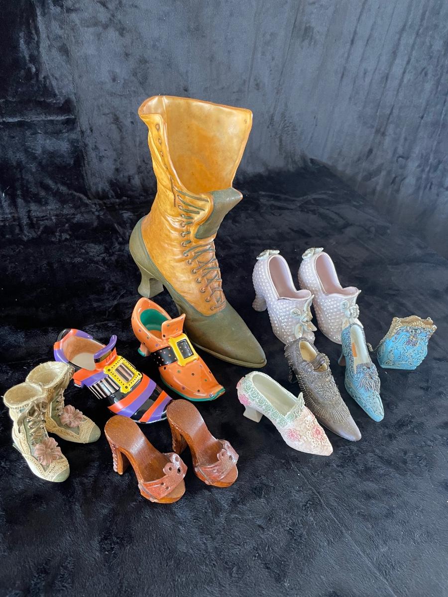(2) wooden platform heals 2”H x 2.5”L x 1W. Resin Victorian boot pair Louis Nichole 1999 3”H x 2”L x 2”W. (3) Resin heals 2”H x 3.5”L x 1.5”W. Resin purse with chain strap 2.5”H x 2”L x 1”W