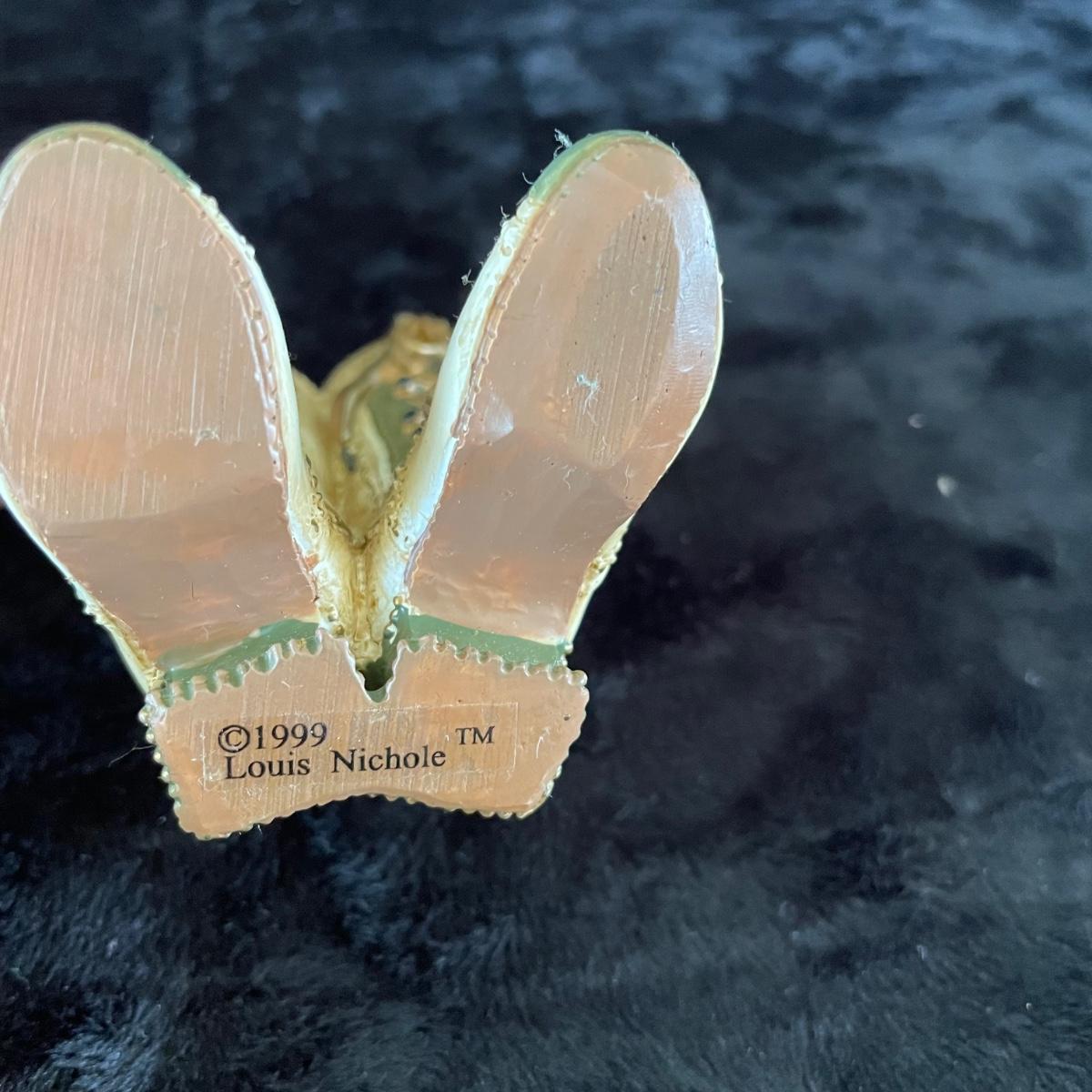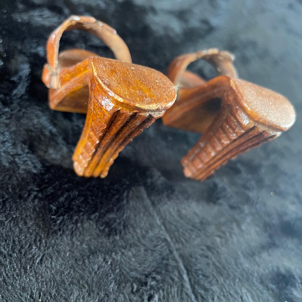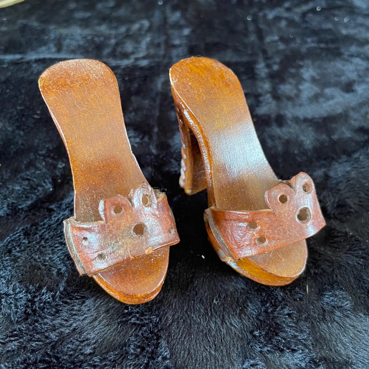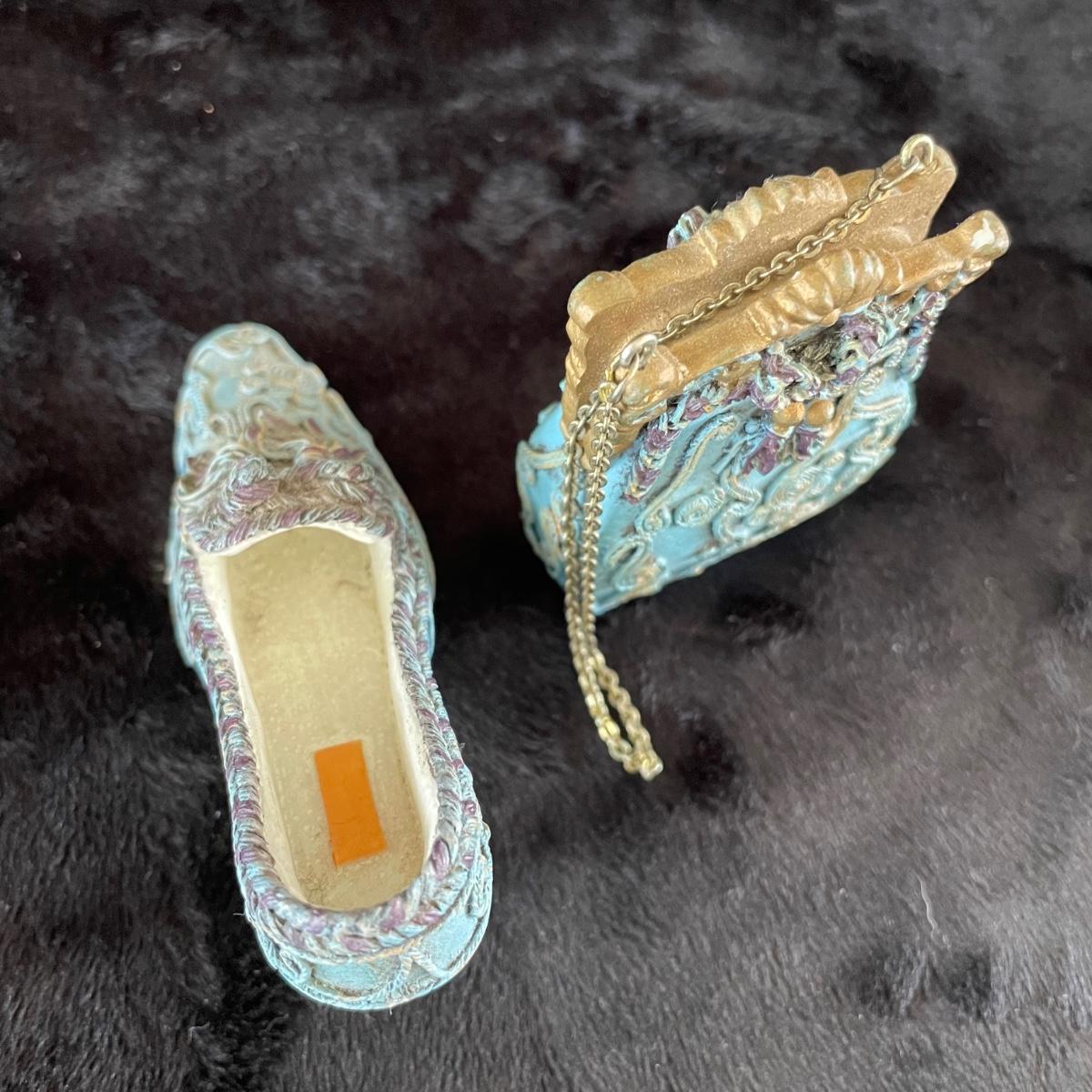 (2) wooden platform heals 2”H x 2.5”L x 1W. Resin Victorian boot pair Louis Nichole 1999 3”H x 2”L x 2”W. (3) Resin heals 2”H x 3.5”L x 1.5”W. Resin purse with chain strap 2.5”H x 2”L x 1”W