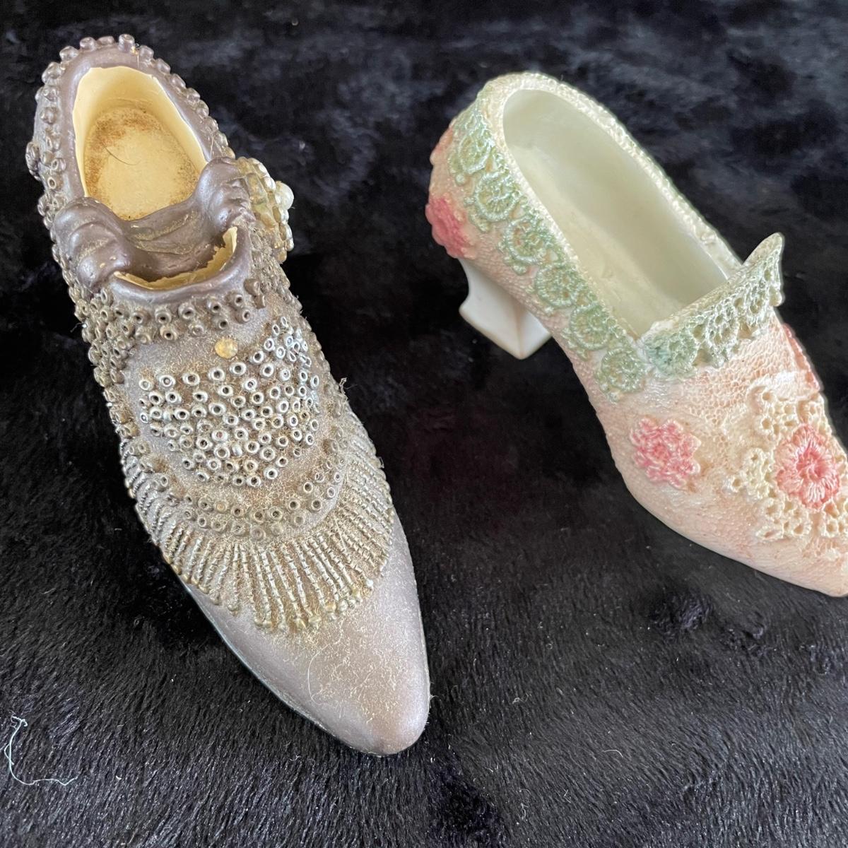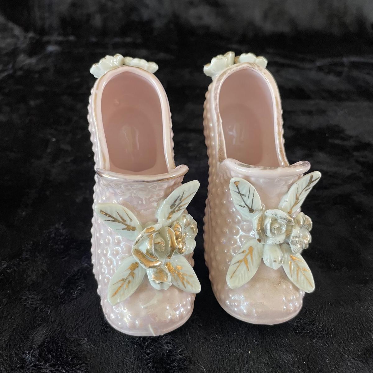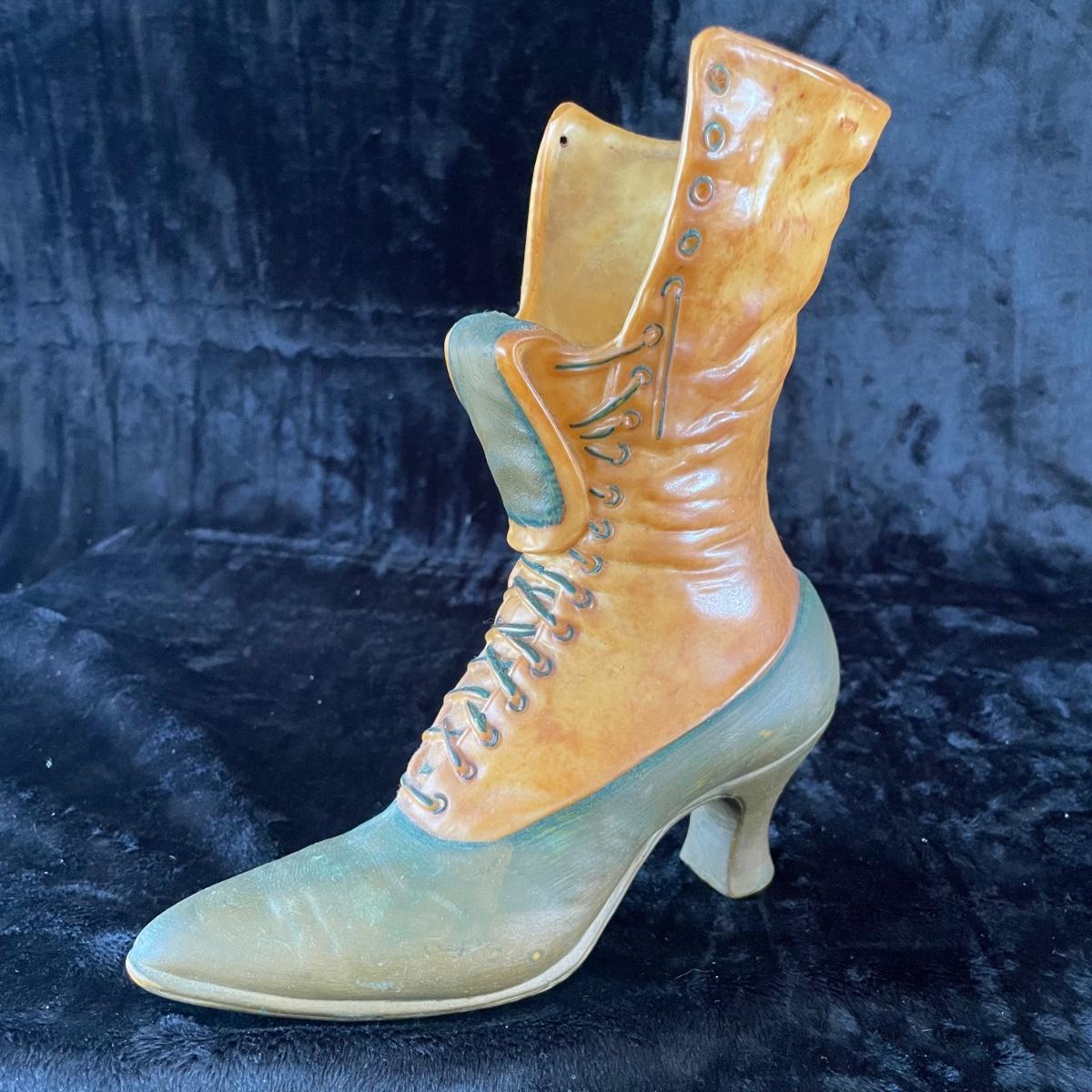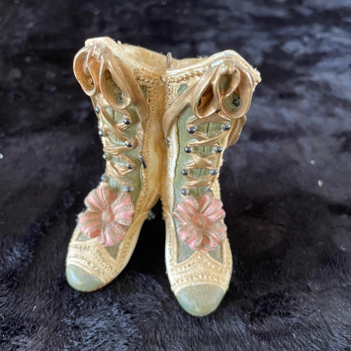 Shoe figurines. Resin Victorian boot 9”Hx8”Lx2”W. (2) Pink opalescent porcelain heals with gold detail numbered 73/6 & 73/7