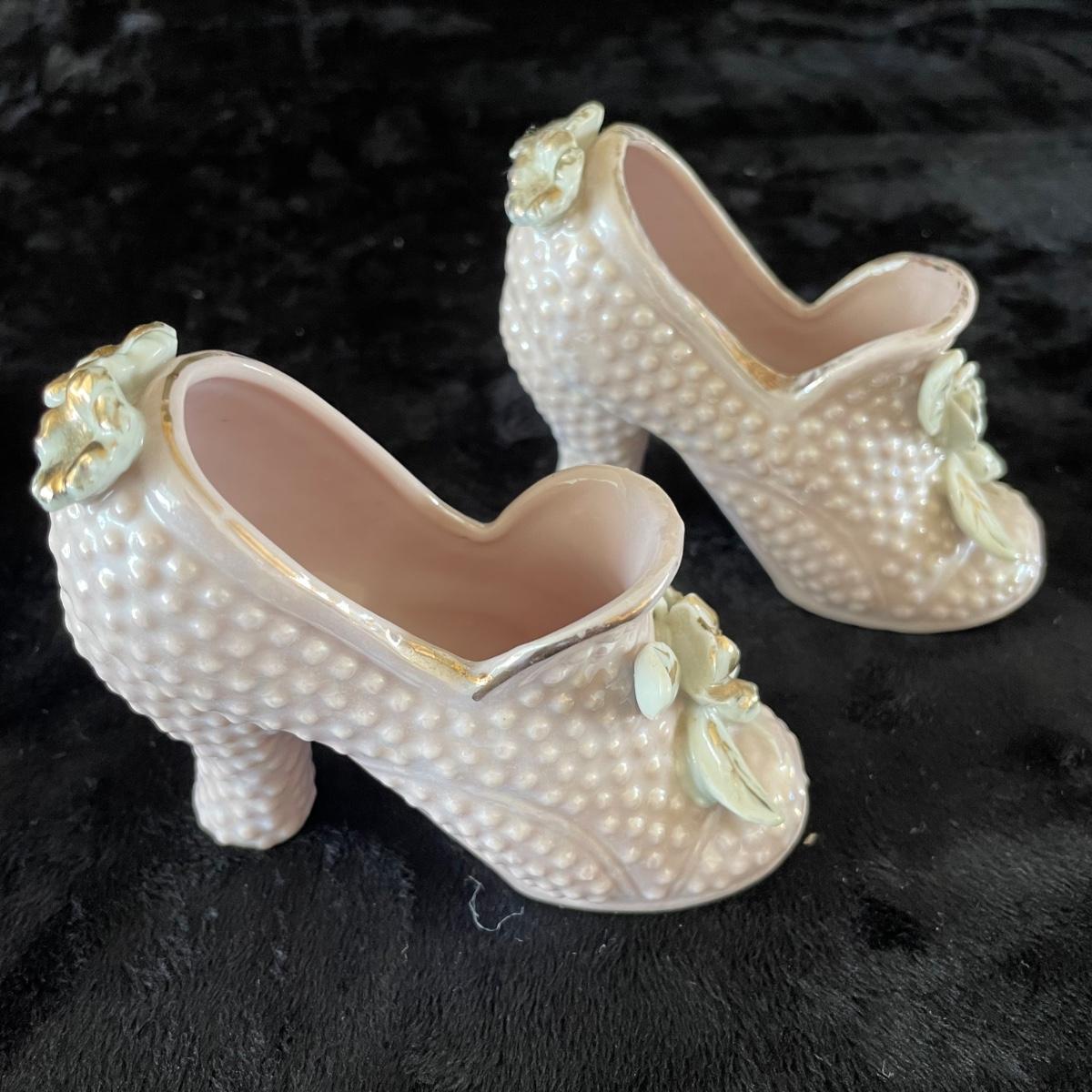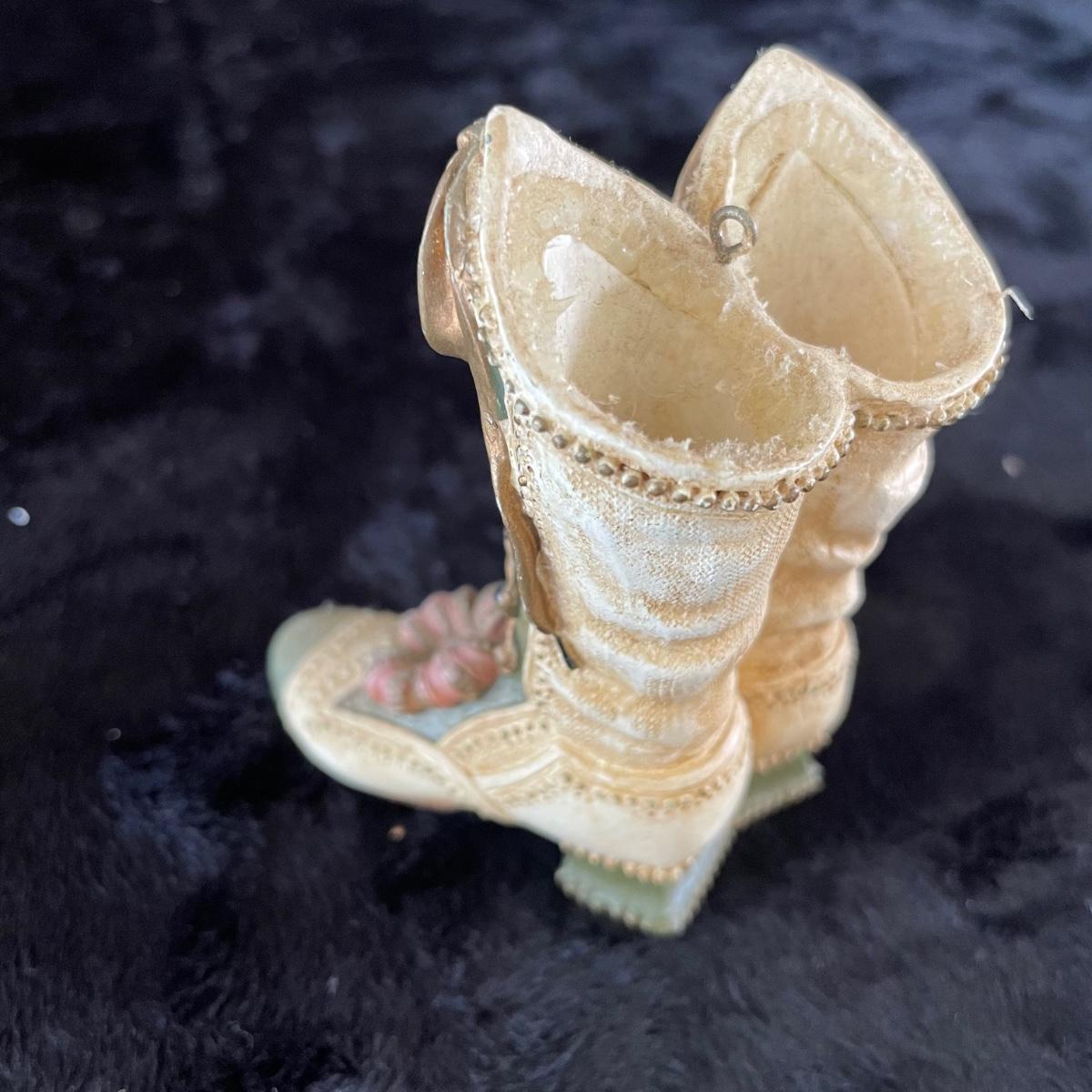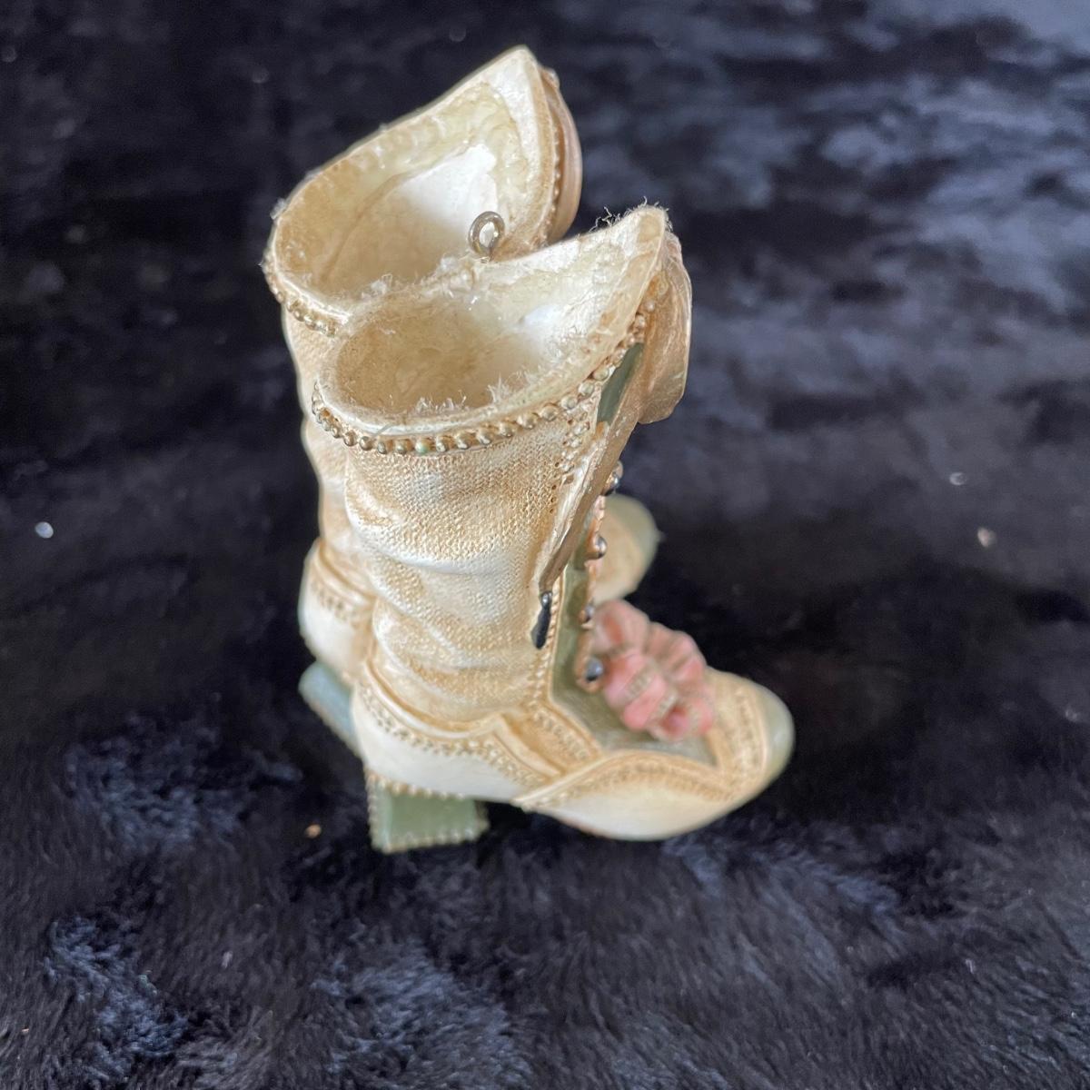 Shoe figurines. Resin Victorian boot 9”Hx8”Lx2”W. (2) Pink opalescent porcelain heals with gold detail numbered 73/6 & 73/7