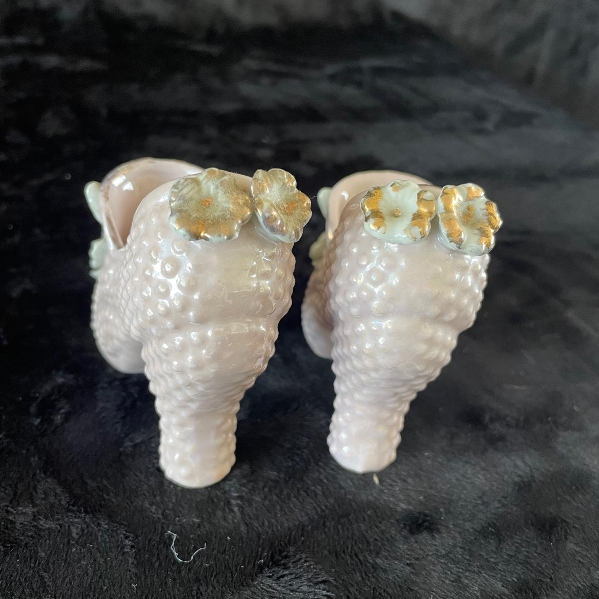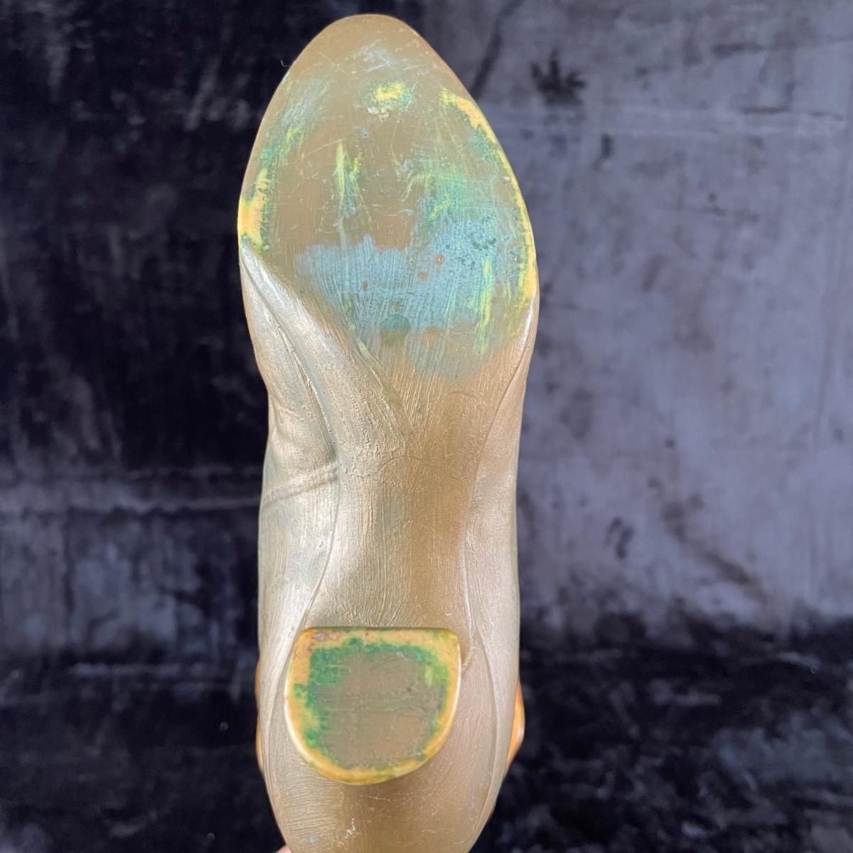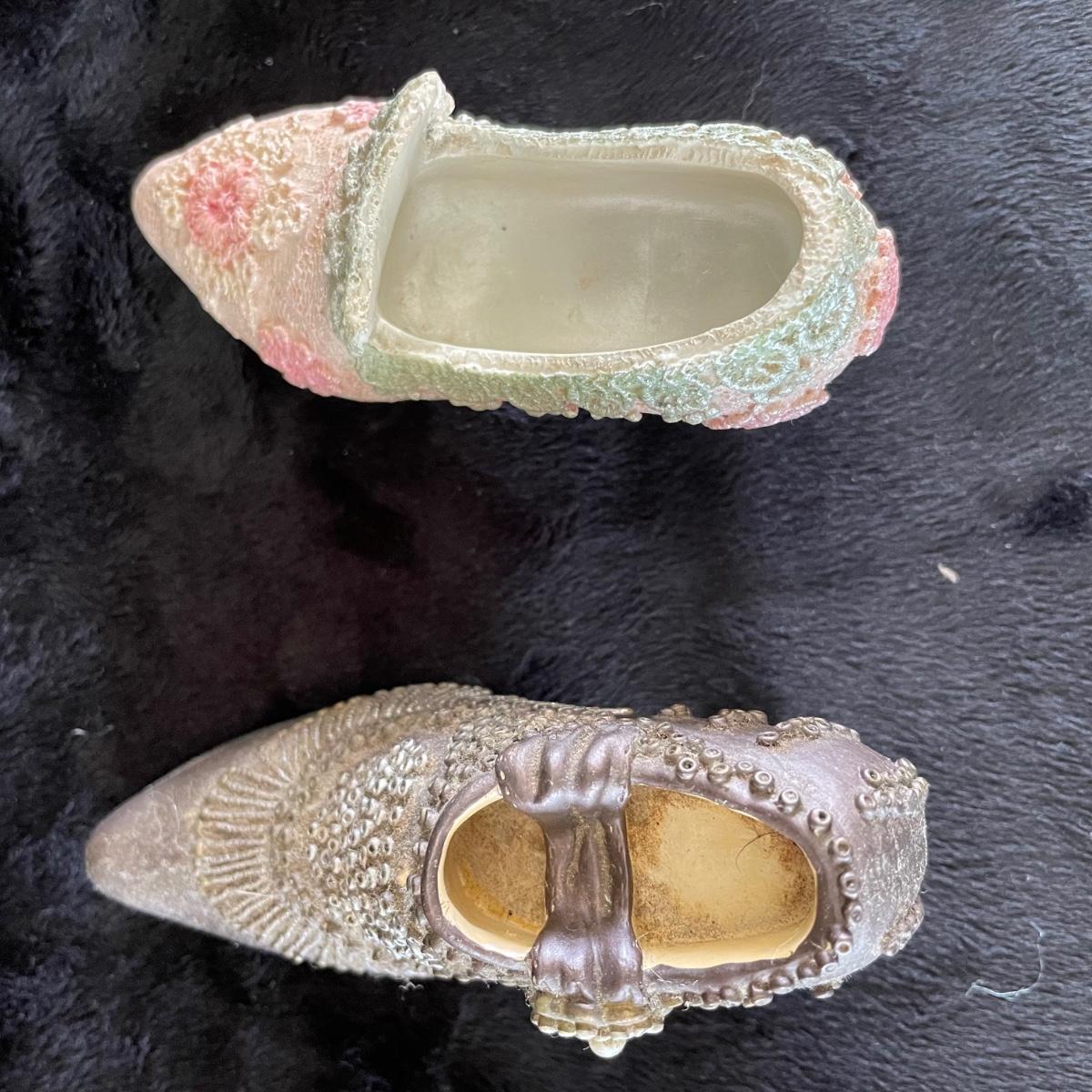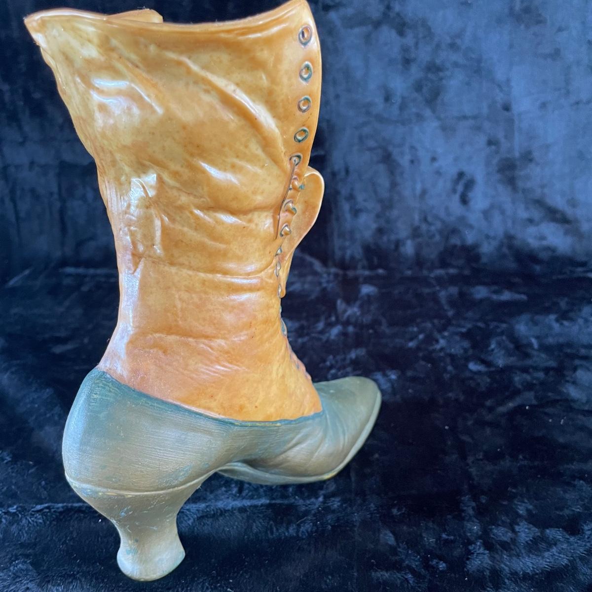Shoe figurines. Resin Victorian boot 9”Hx8”Lx2”W. (2) Pink opalescent porcelain heals with gold detail numbered 73/6 & 73/7