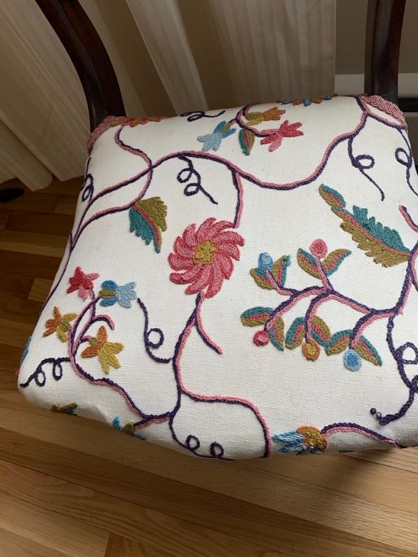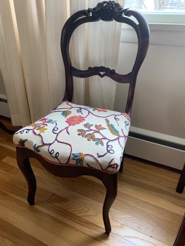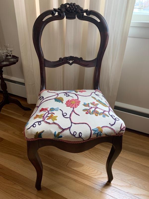 Lovely side chair in walnut with crewel stitch upholstered seat, excellent condition