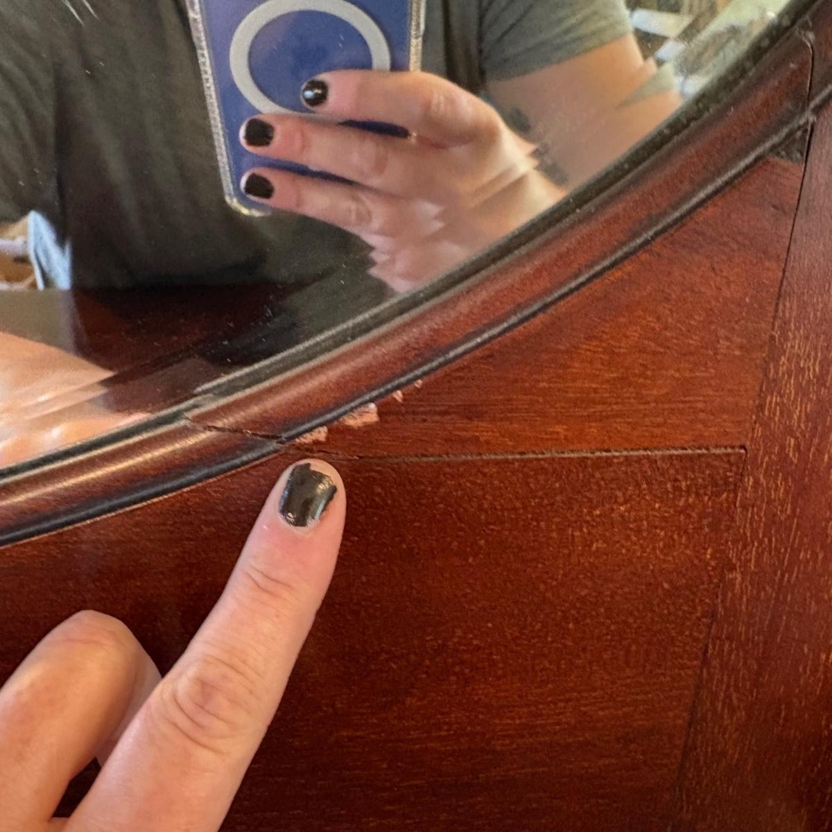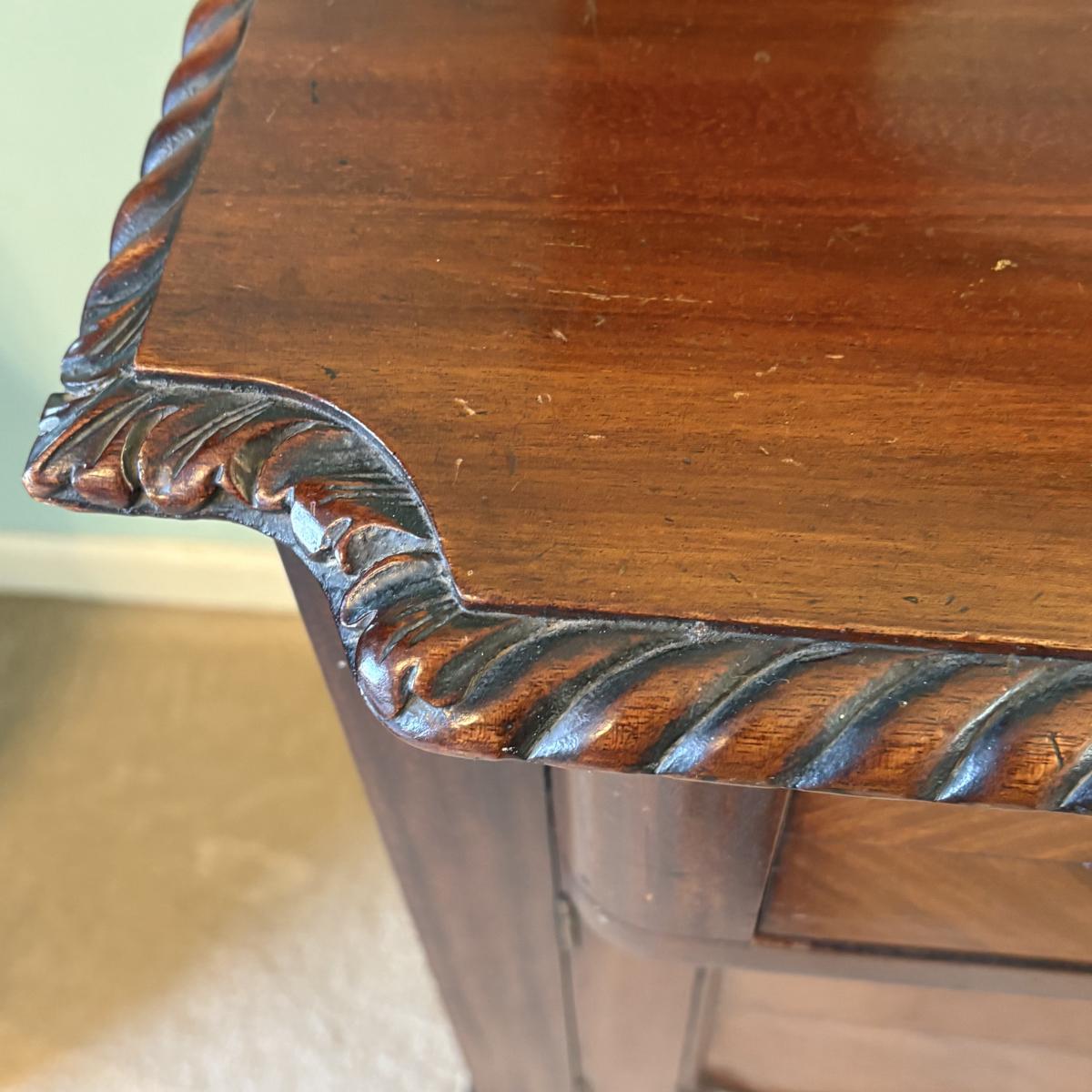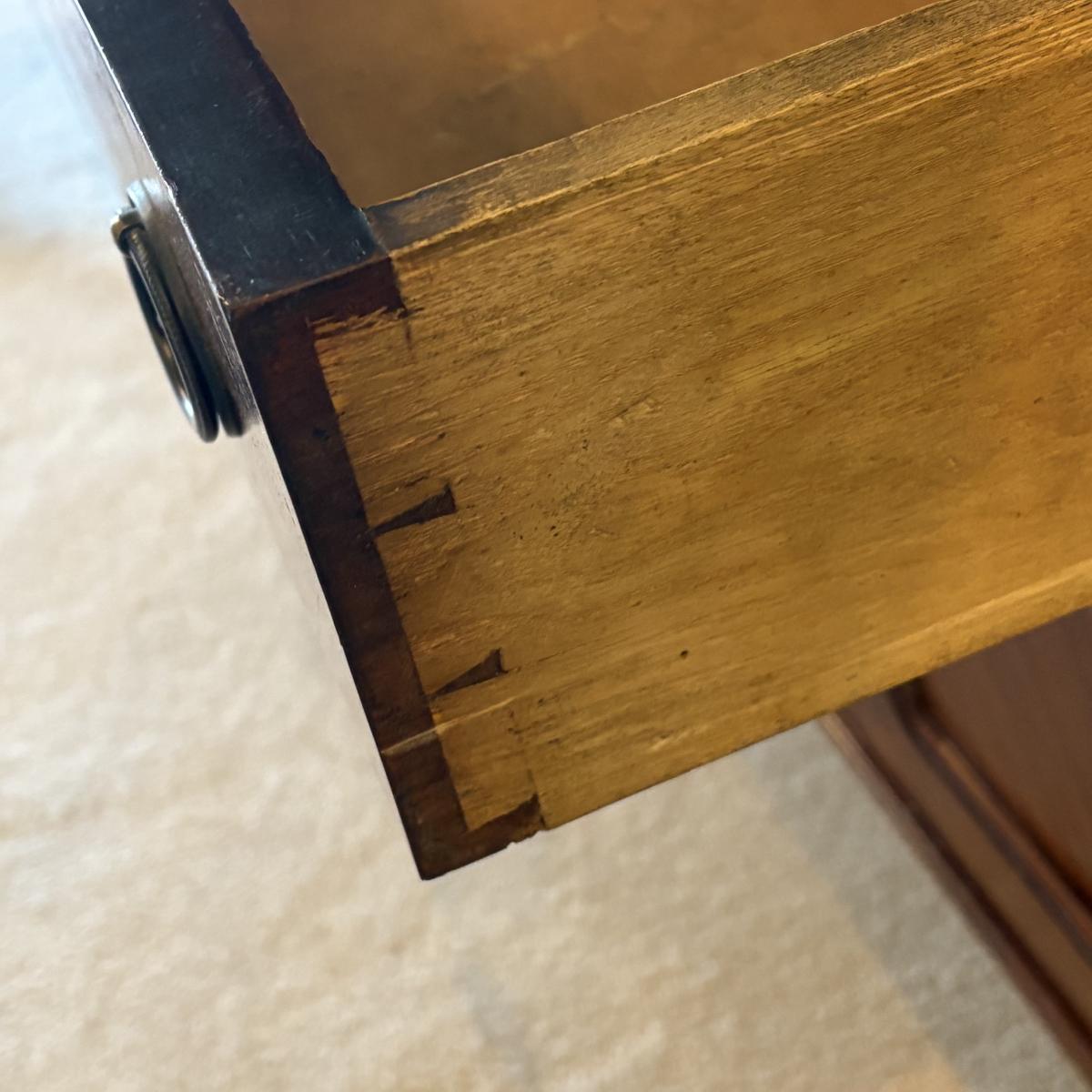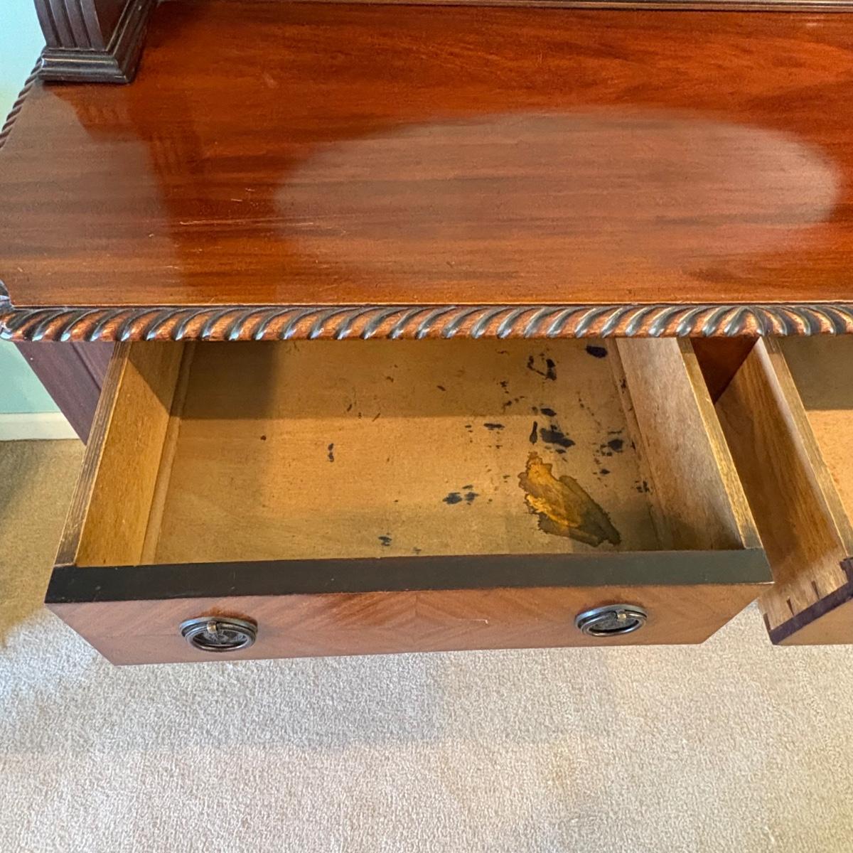 This is an antique Victorian sideboard with a mirror. It features two drawers and a storage cabinet with shelving. The shelves feature dovetail joints. The measurements of the sideboard are approximately 48" x 20" x 57"H. This piece contains blemishes, see pictures for reference.