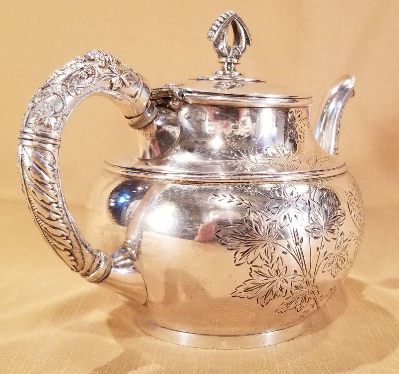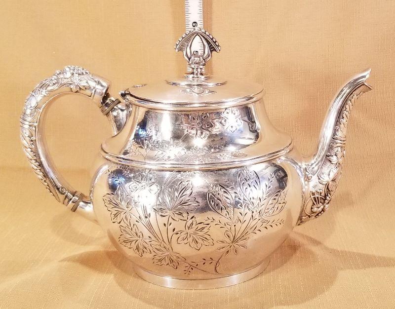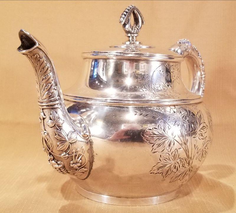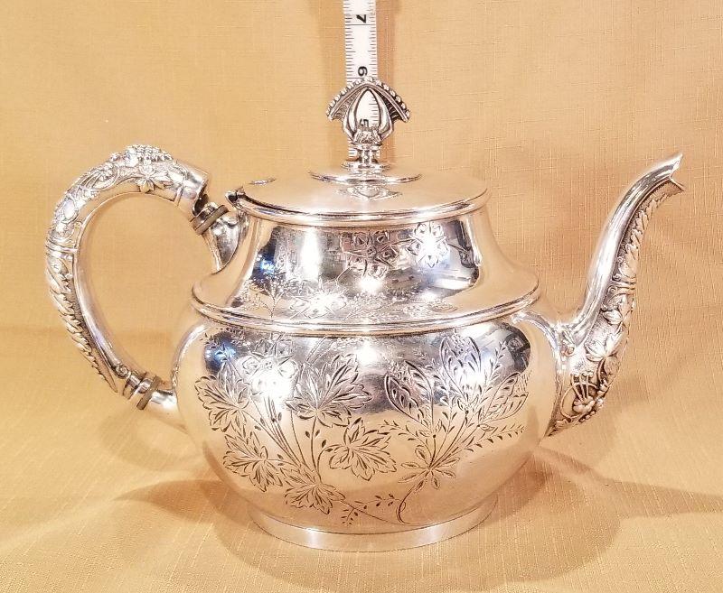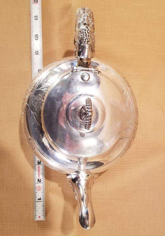 Antique Victorian Silver Plate Tea Pot. Marked Meriden (?) Slate Co. Quadplate #1440. The pot measures 10-inches wide x 6-inches tall Very Nice. Great decorator piece.