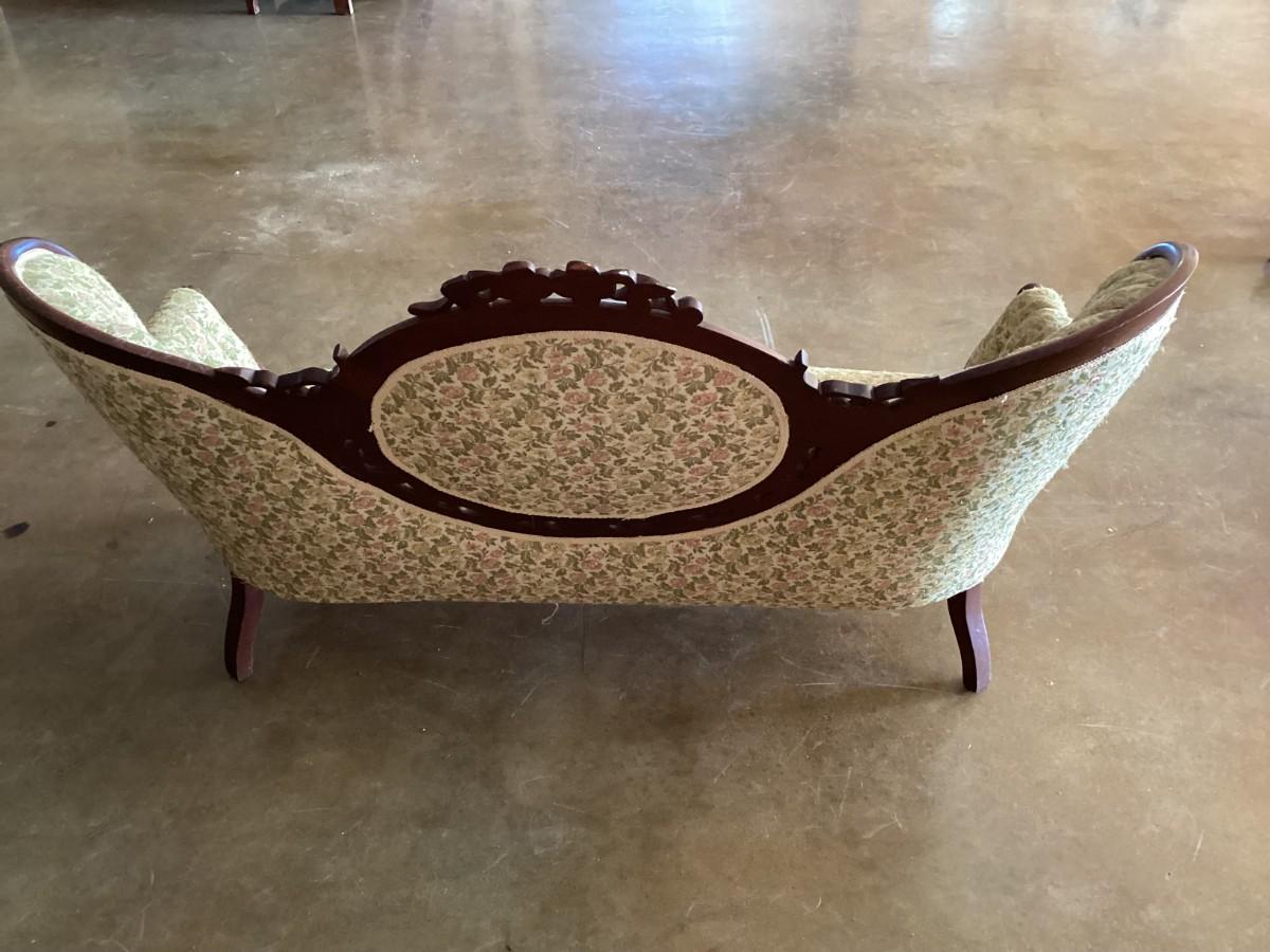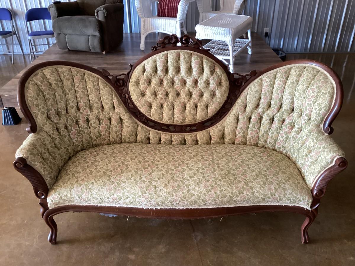 Antique Victorian sofa with carved wooden trim. Good shape!