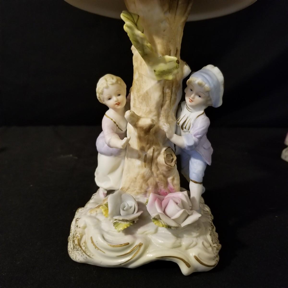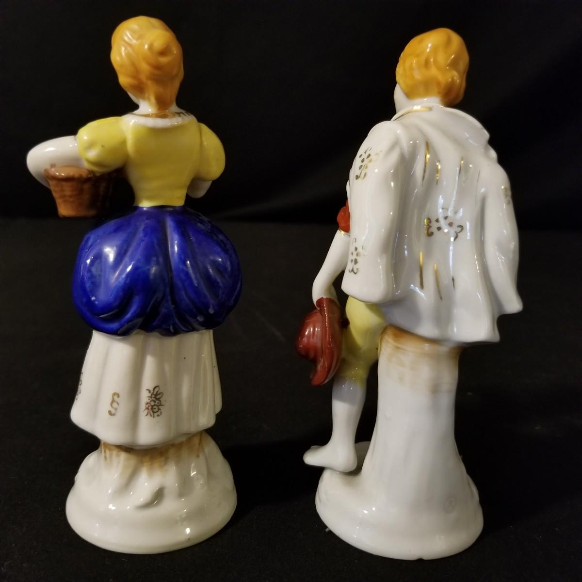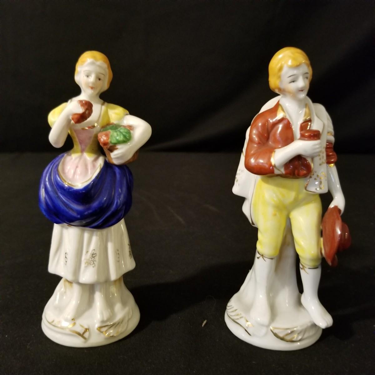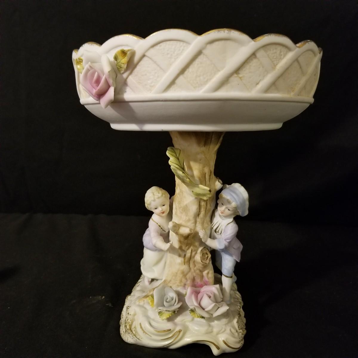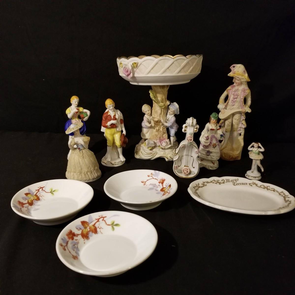 Quaint collection of small statues and dishes. Compote bowl with gold rim and flowers is 7"x9". Three 4.5" round dishes from Karlsbad, one 5"x7" oval dish, and seven statuettes of various poses. Tallest is 8" tall.