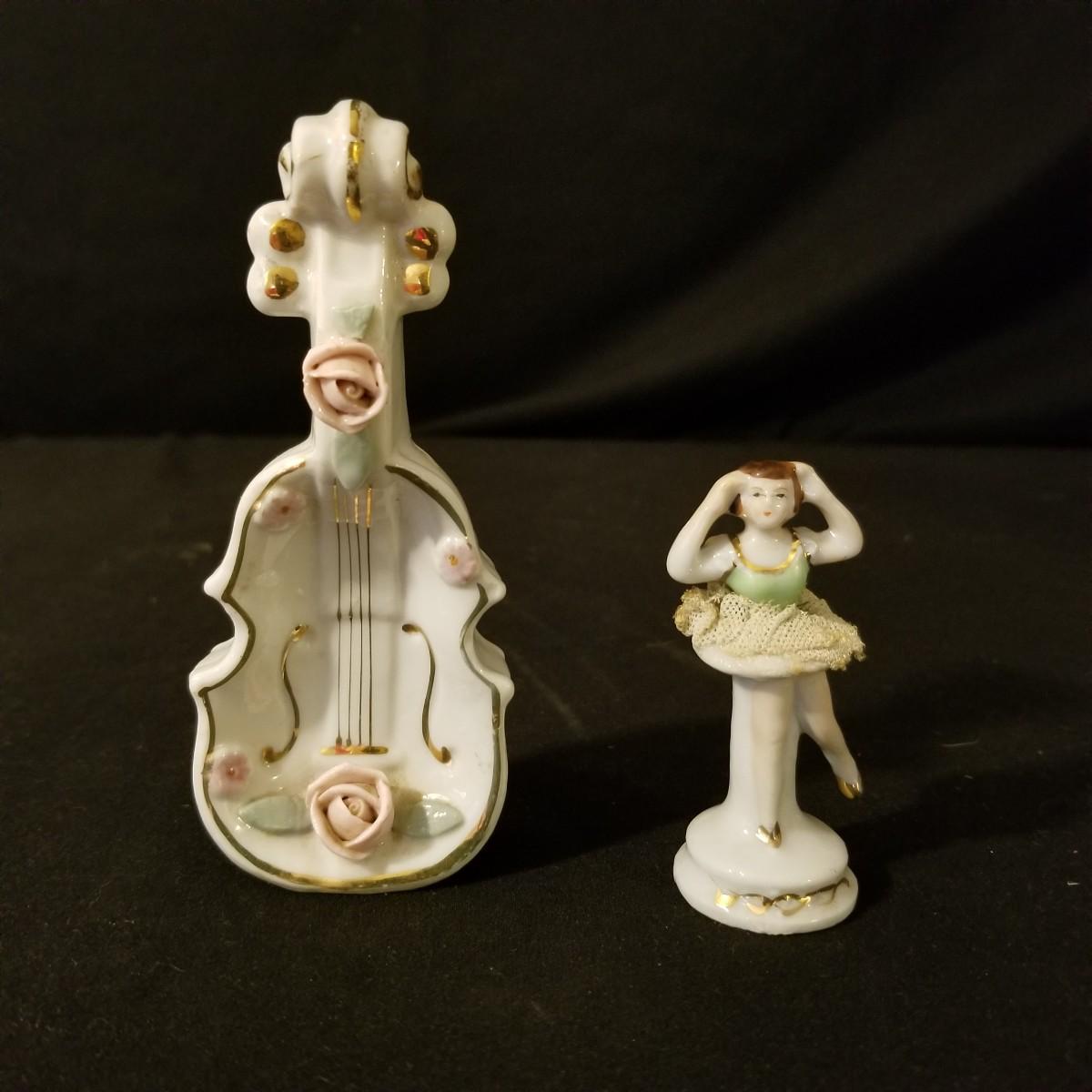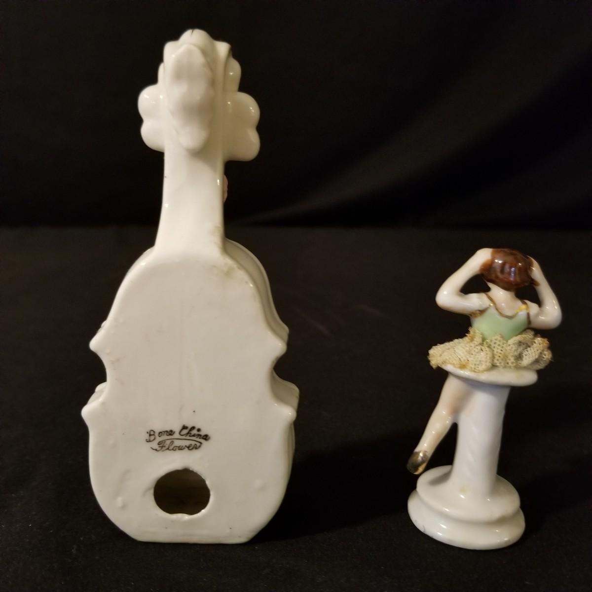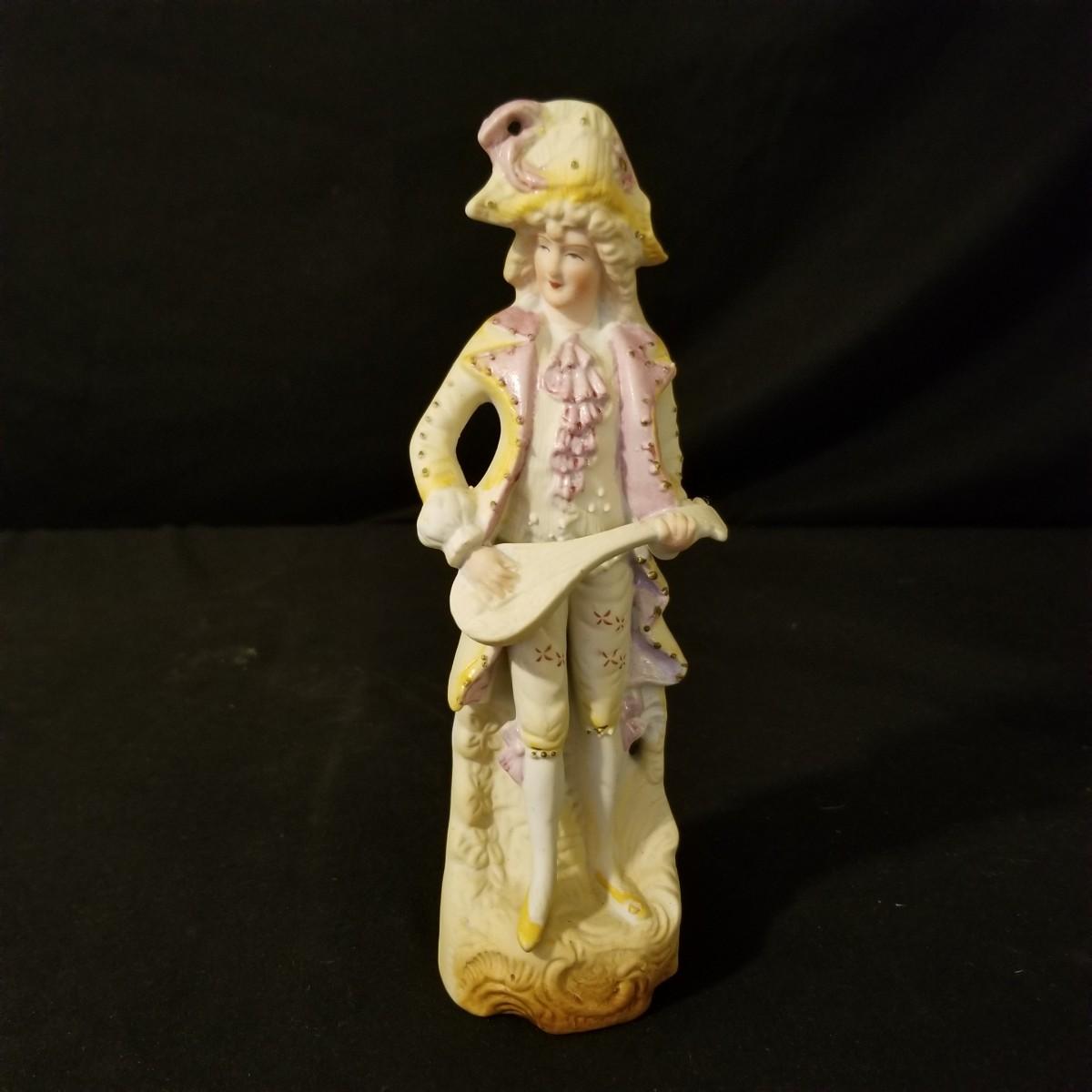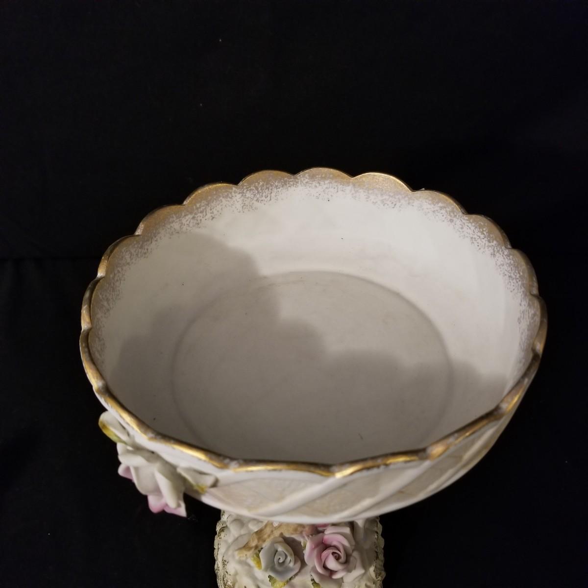 Quaint collection of small statues and dishes. Compote bowl with gold rim and flowers is 7"x9". Three 4.5" round dishes from Karlsbad, one 5"x7" oval dish, and seven statuettes of various poses. Tallest is 8" tall.