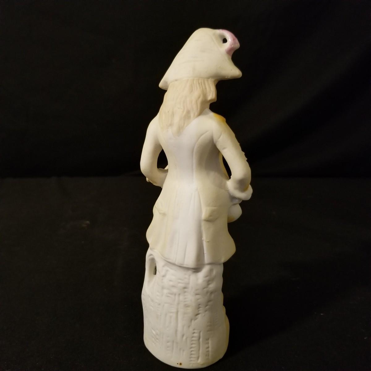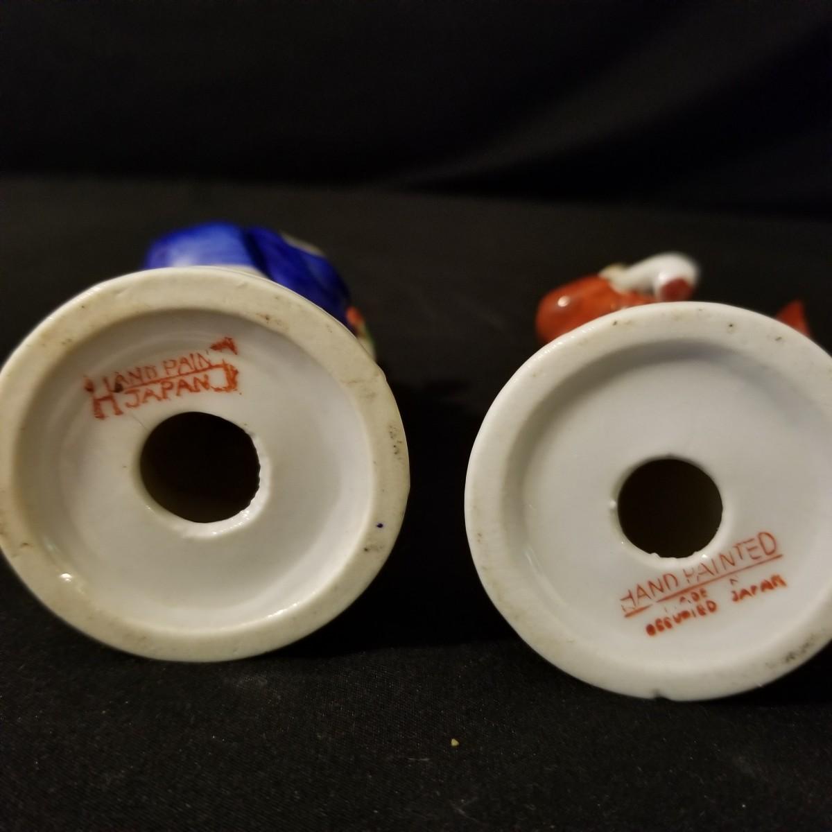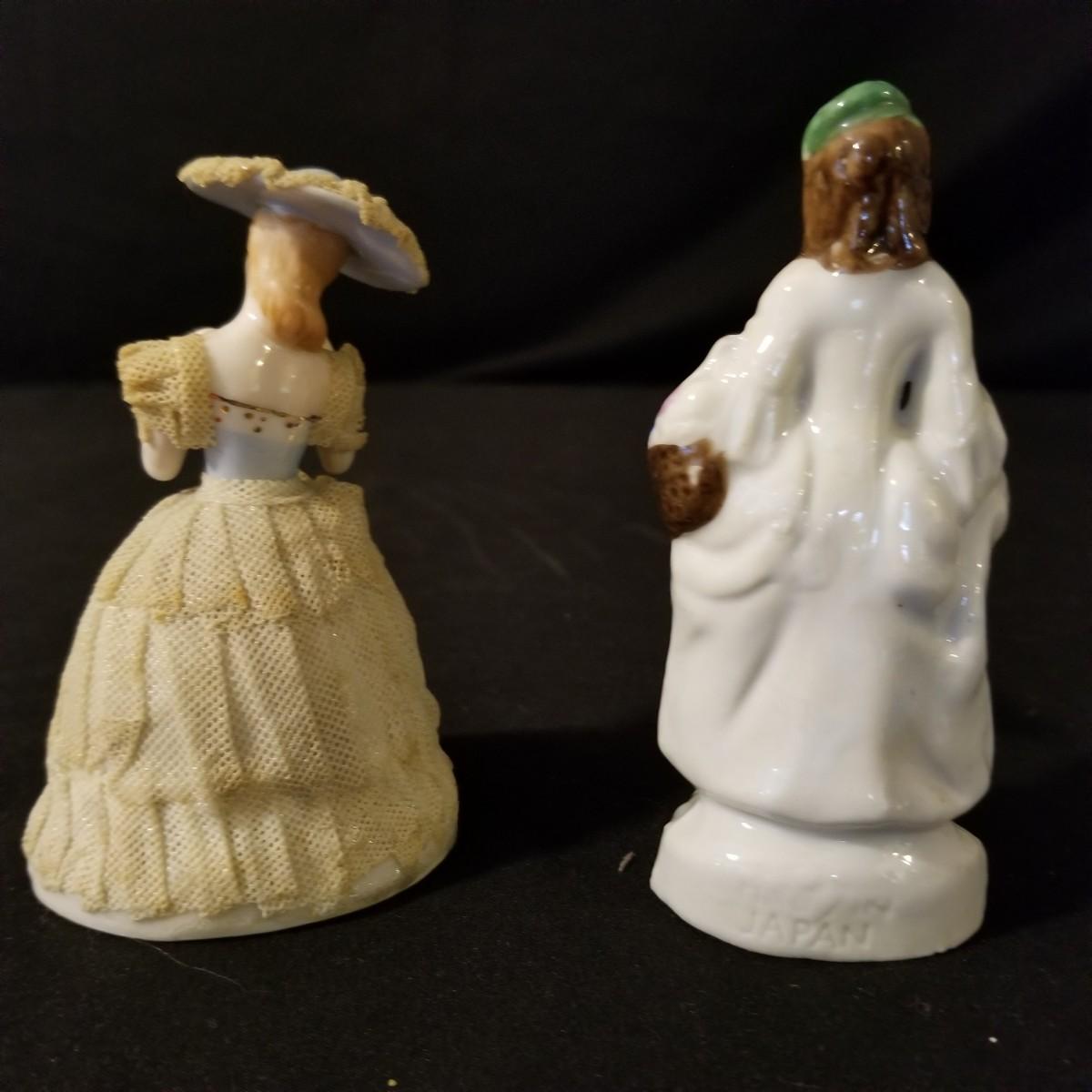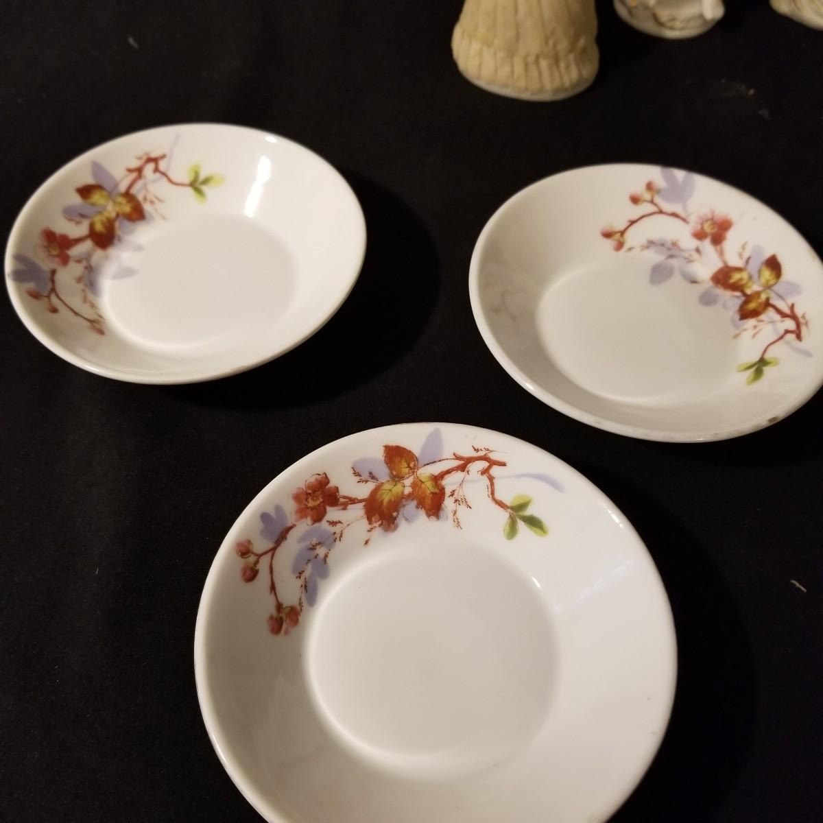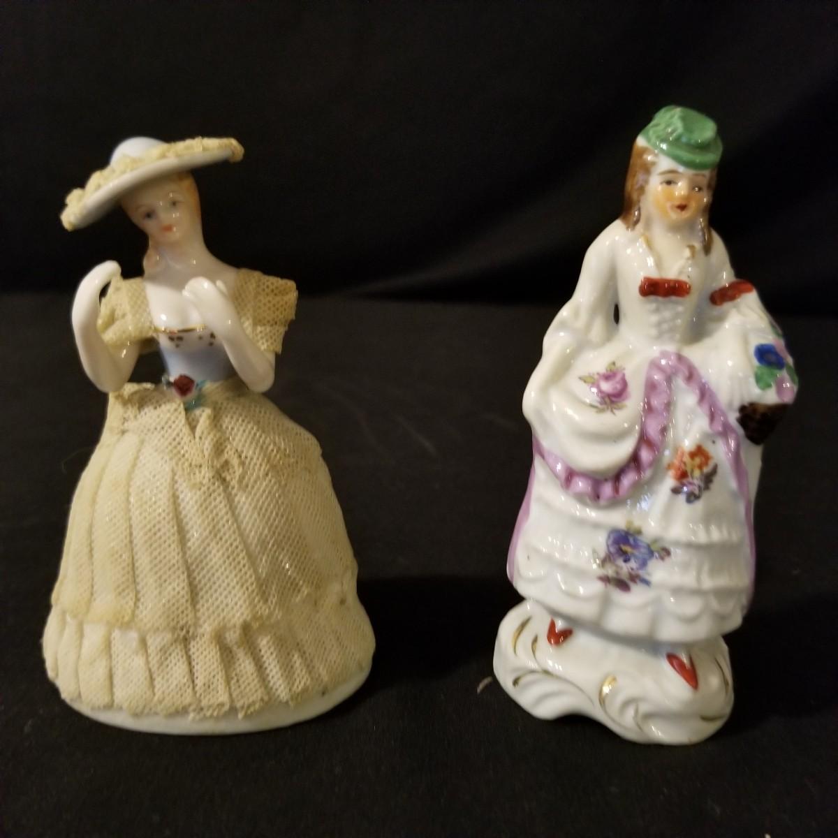 Quaint collection of small statues and dishes. Compote bowl with gold rim and flowers is 7"x9". Three 4.5" round dishes from Karlsbad, one 5"x7" oval dish, and seven statuettes of various poses. Tallest is 8" tall.