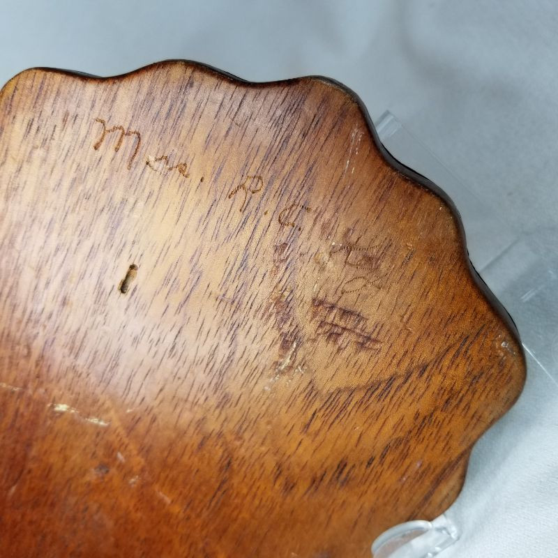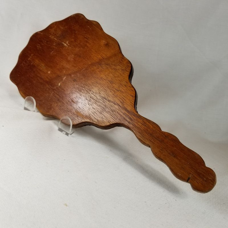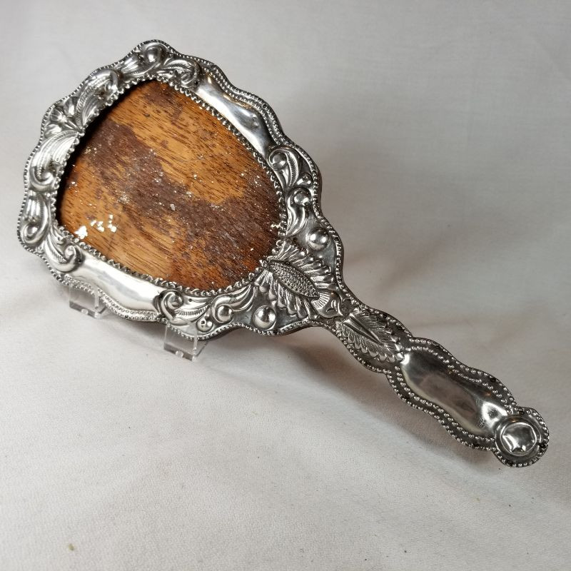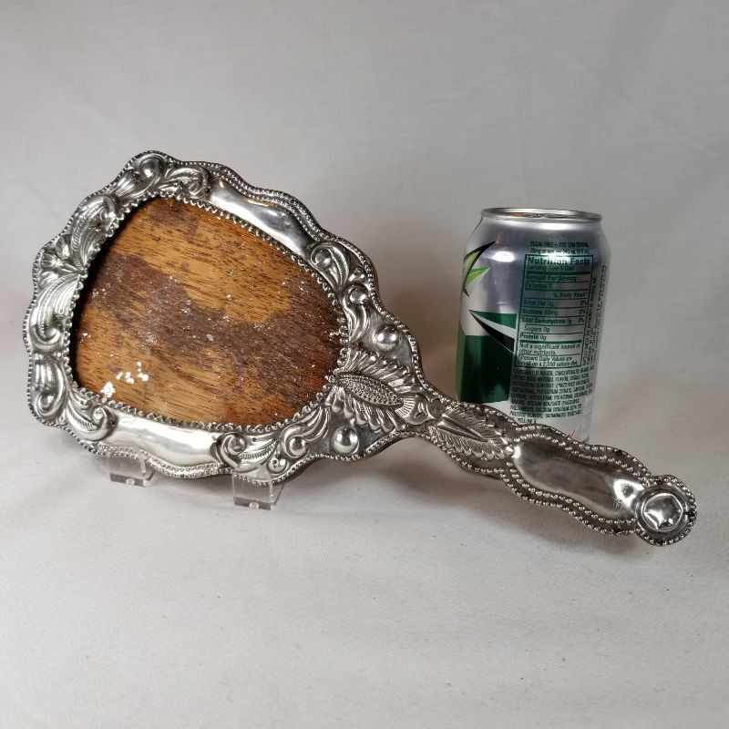 For reasons unknown the mirror of this Victorian sterling silver hand mirror has disappeared. The mirror is gone but the beautiful frame remains waiting for a new one. Would be perfect as an unique frame for a very special photo or small painting. The frame has several dents consistent with sterling, its age and use. Marked 925 on handle. The wood back is etched with the name Mrs. R. C. Key. - Would be easy to sand off and refinish. Mirror size is 12-1/2-inches long X 6-inches wide. Good size - Very pretty.