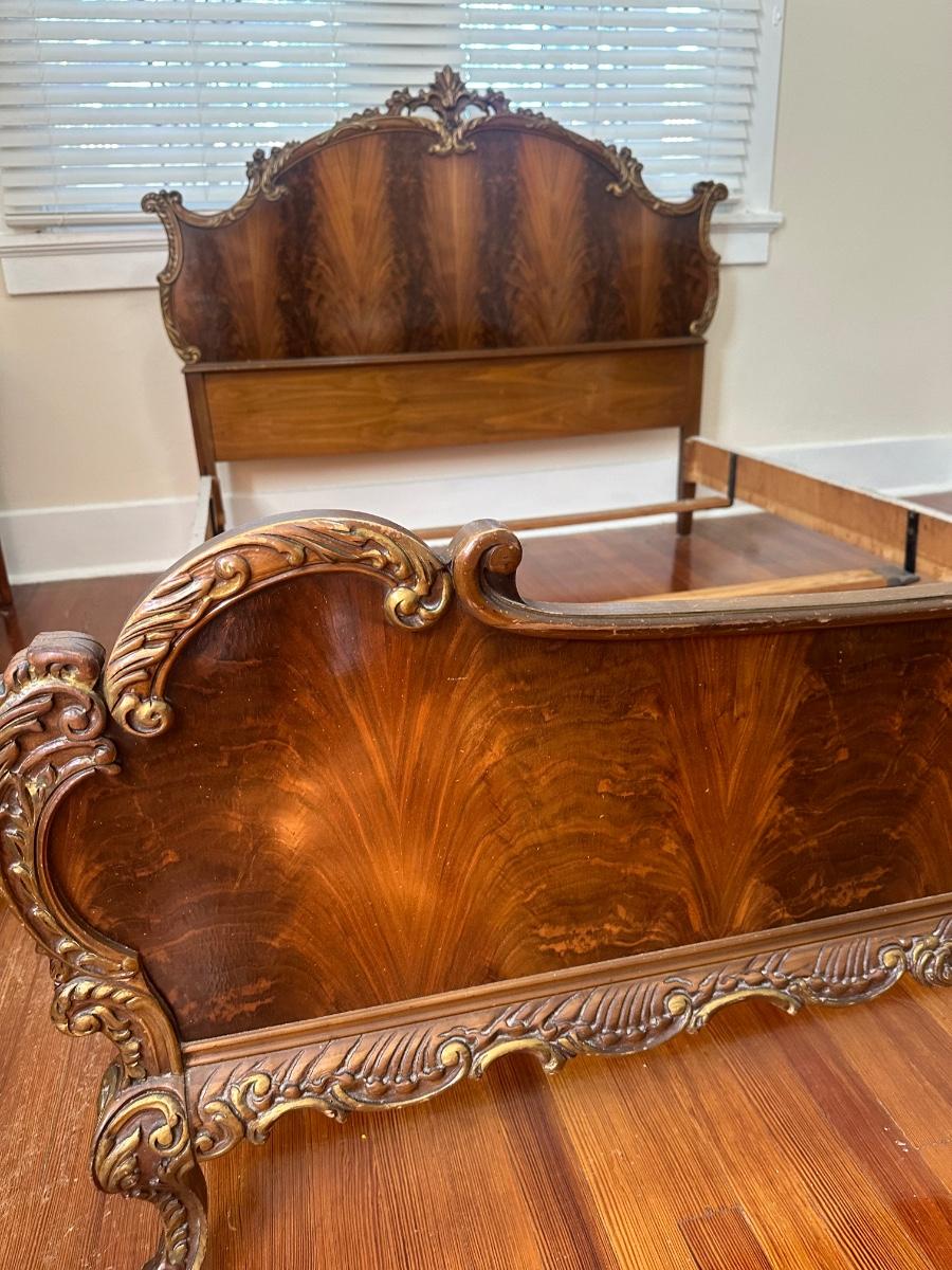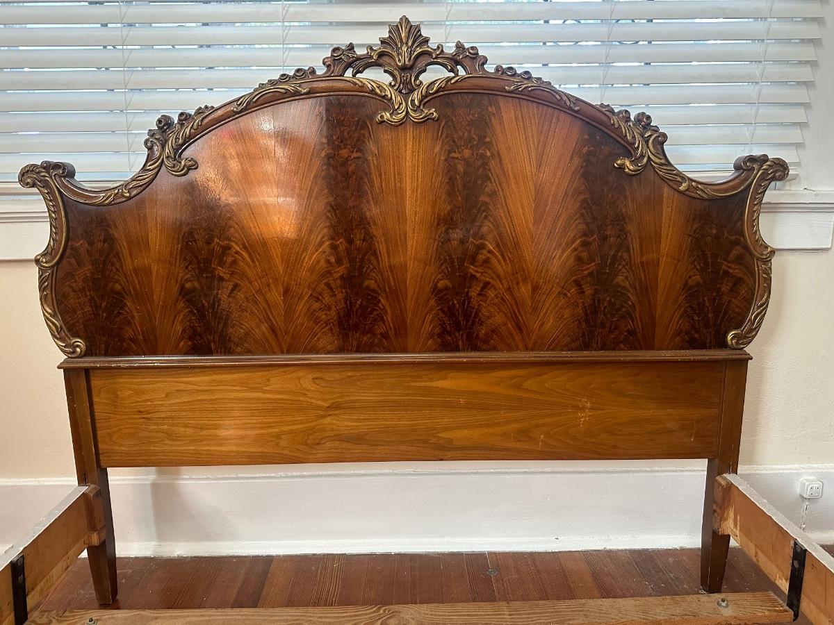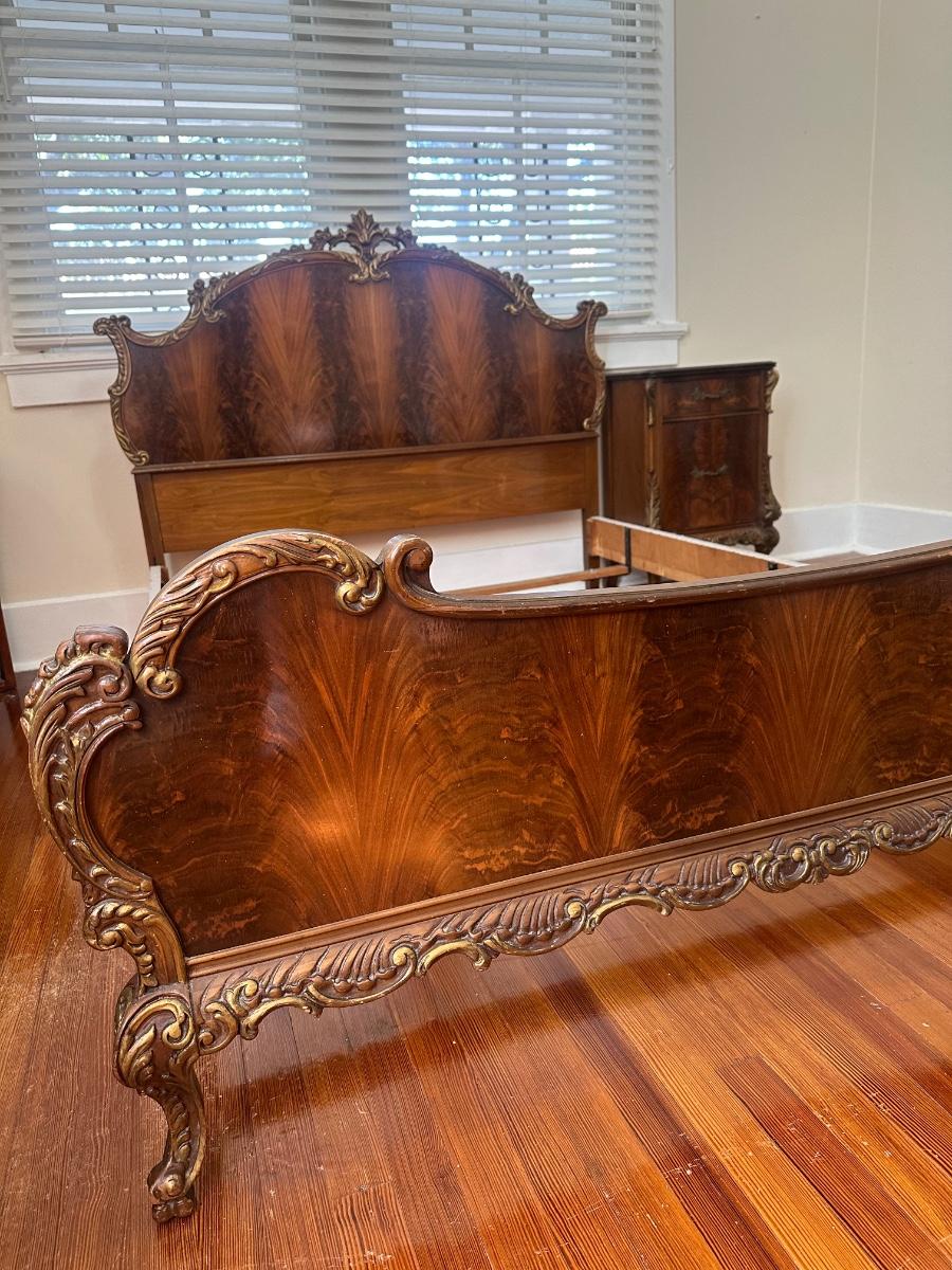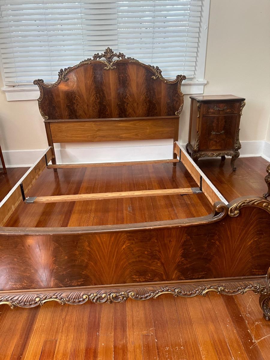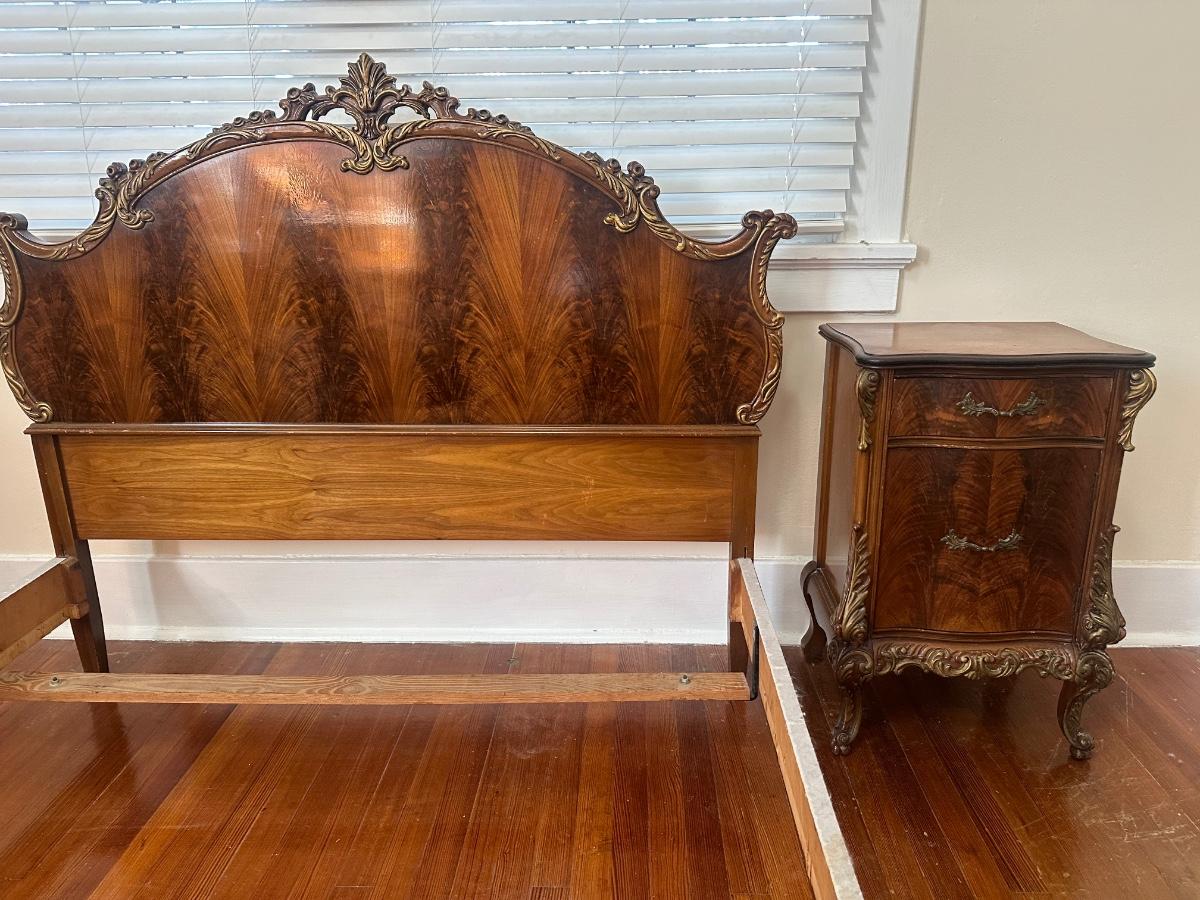Victorian style double bed frame with nightstand. The bed frame side boards have a few small pieces of veneer missing, pictured. The nightstand has some wear, also pictured. There is a velcro bottom on the top of the bed frame side boards.