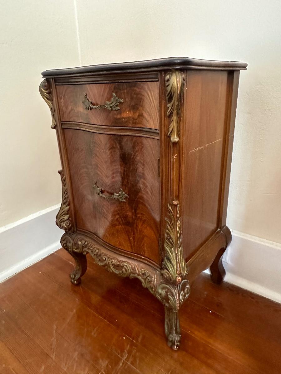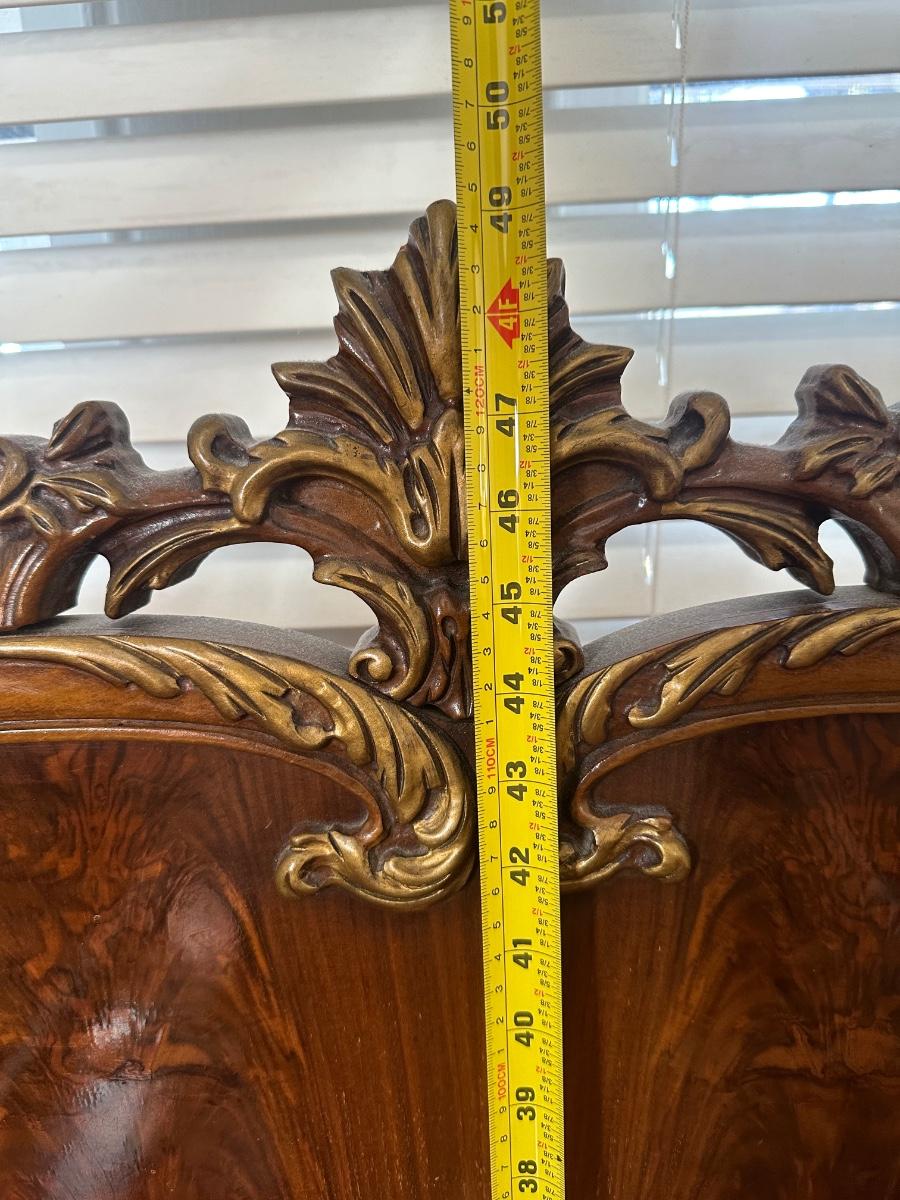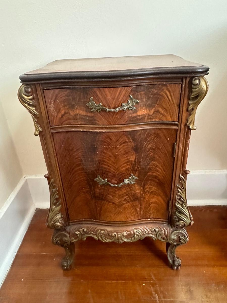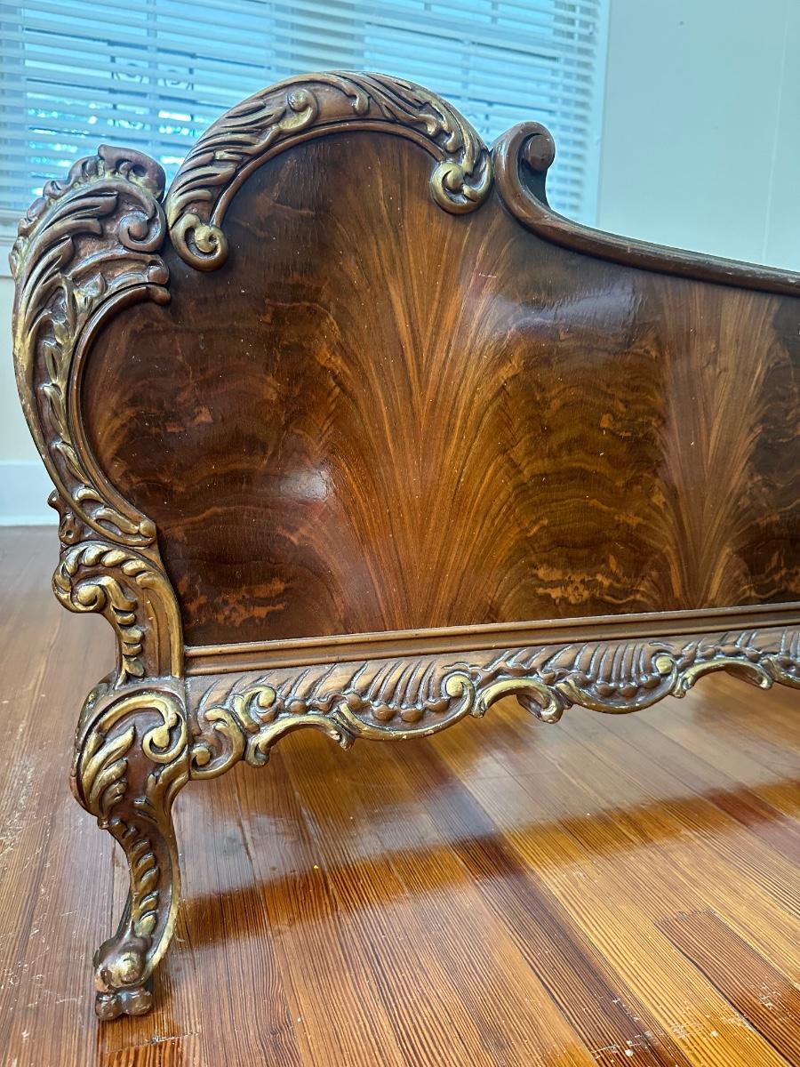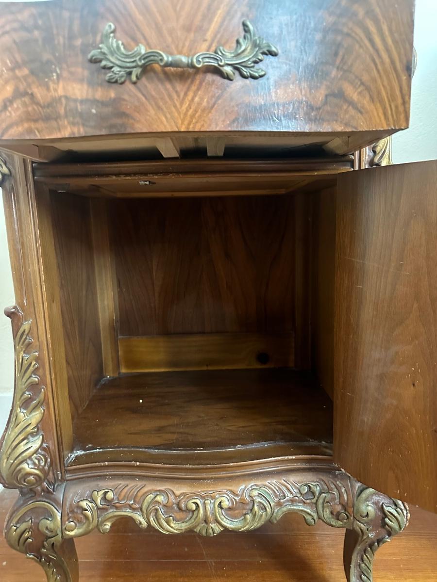 Victorian style double bed frame with nightstand. The bed frame side boards have a few small pieces of veneer missing, pictured. The nightstand has some wear, also pictured. There is a velcro bottom on the top of the bed frame side boards.
