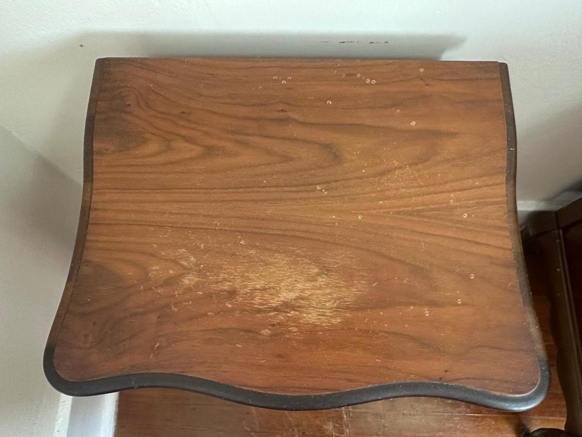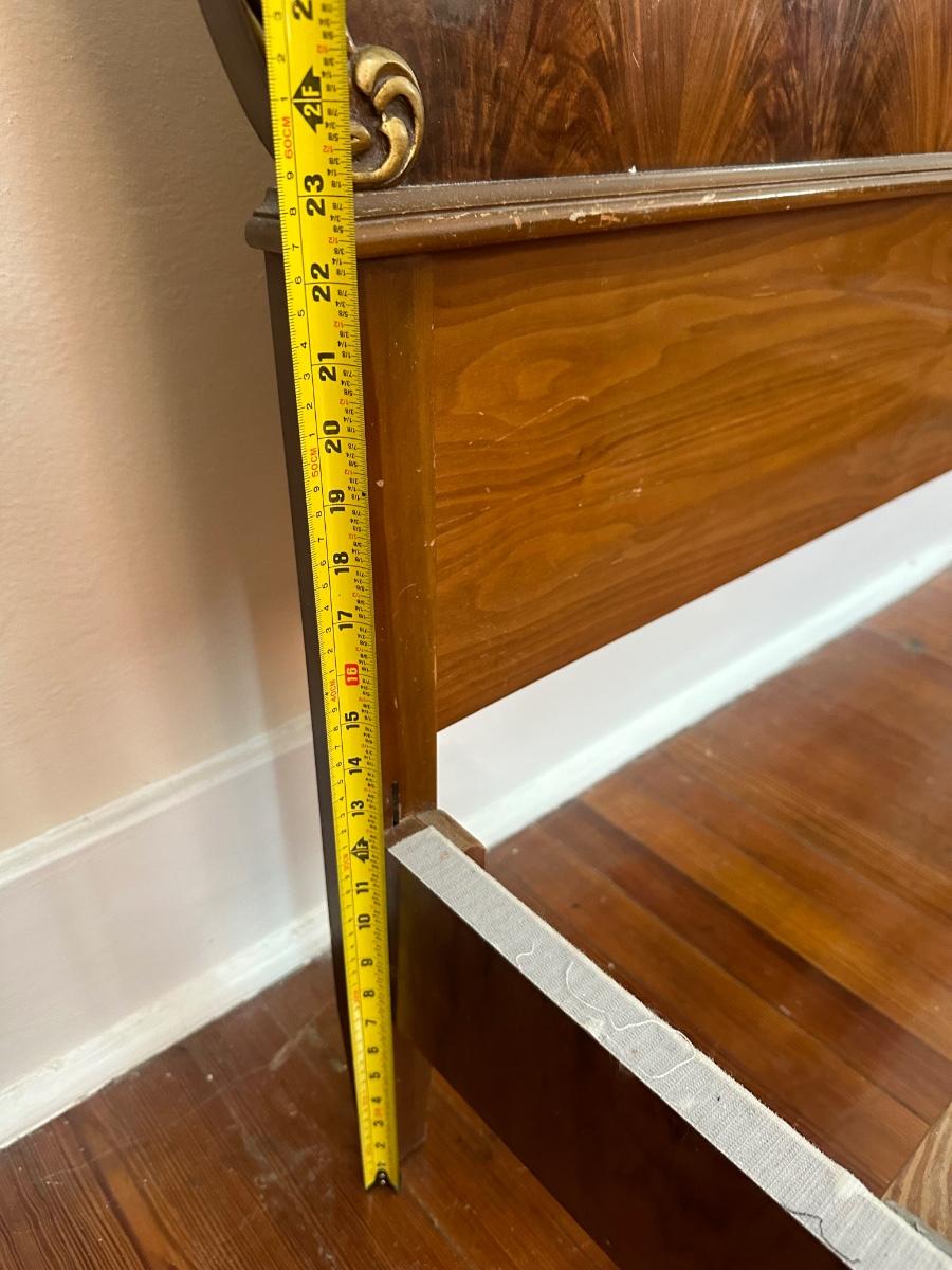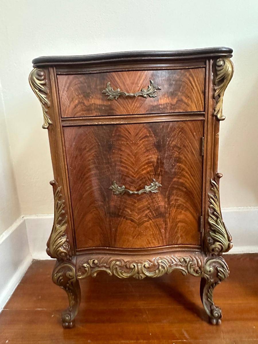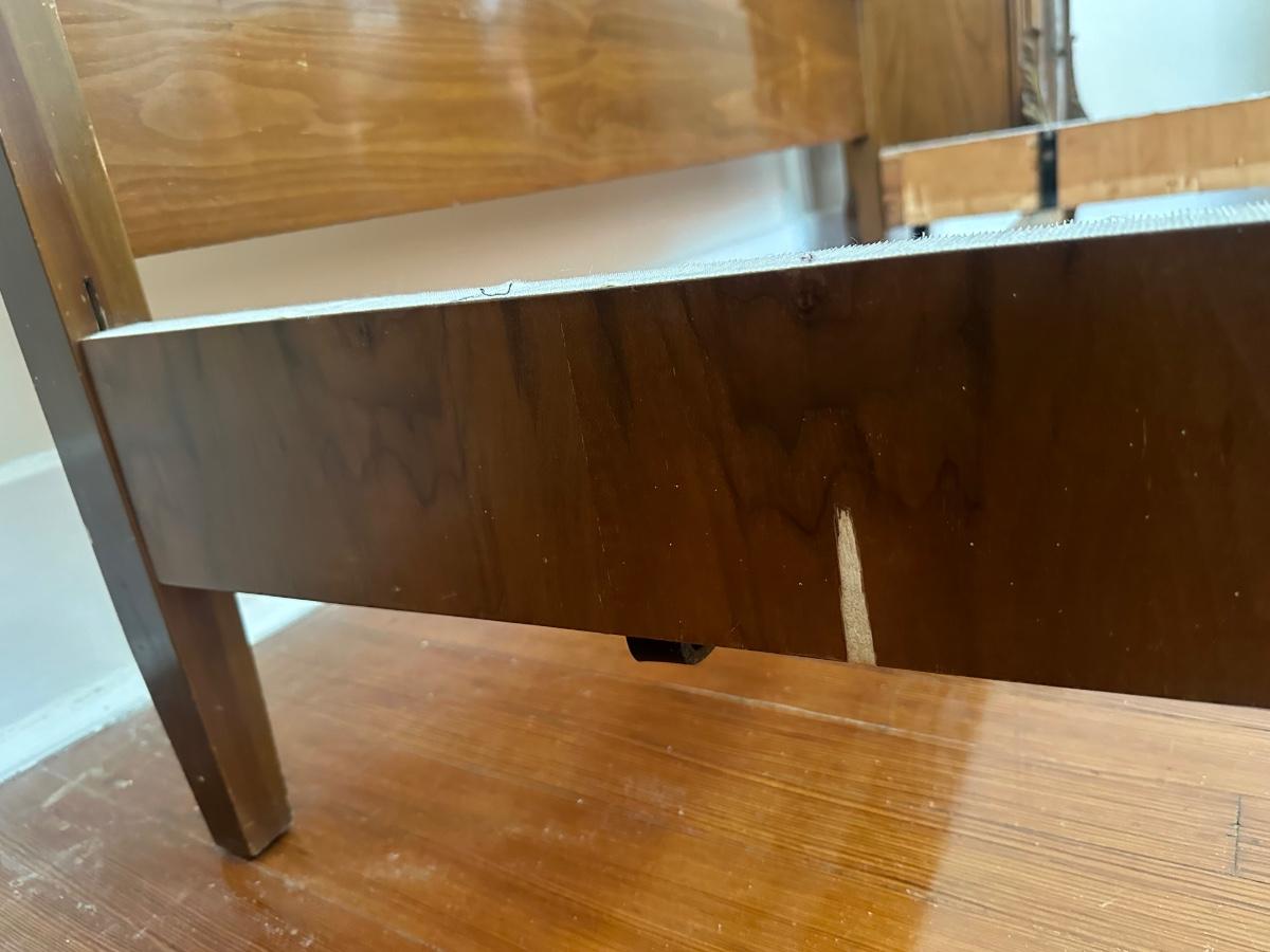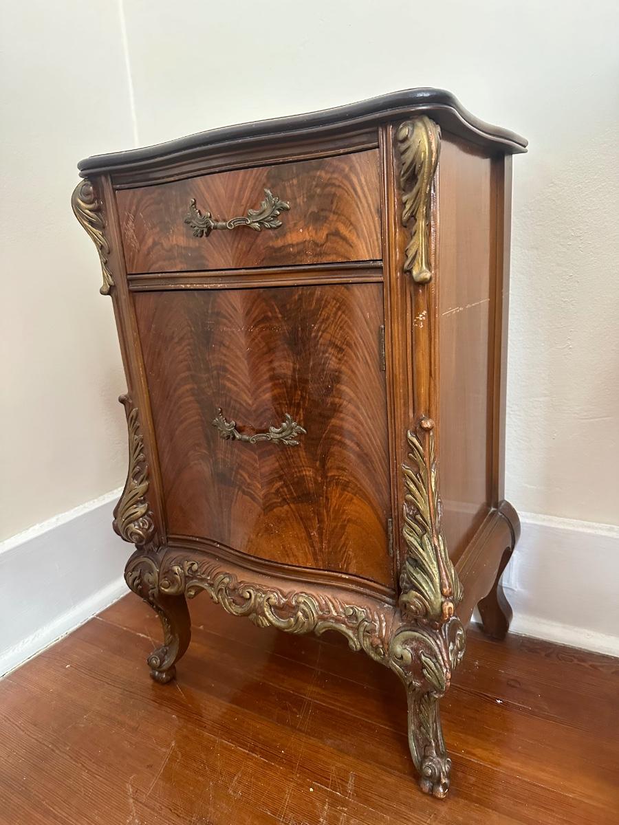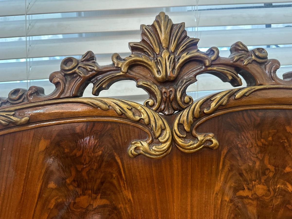Victorian style double bed frame with nightstand. The bed frame side boards have a few small pieces of veneer missing, pictured. The nightstand has some wear, also pictured. There is a velcro bottom on the top of the bed frame side boards.