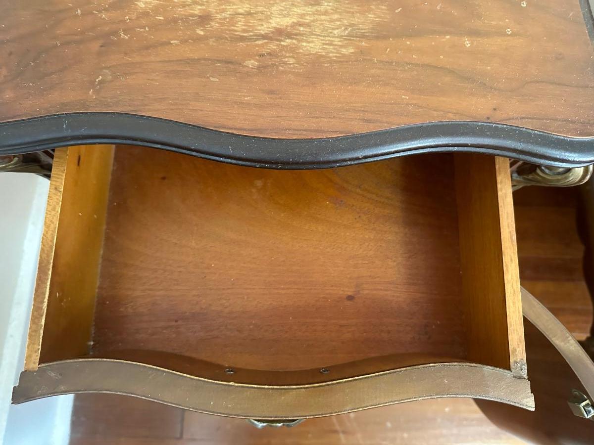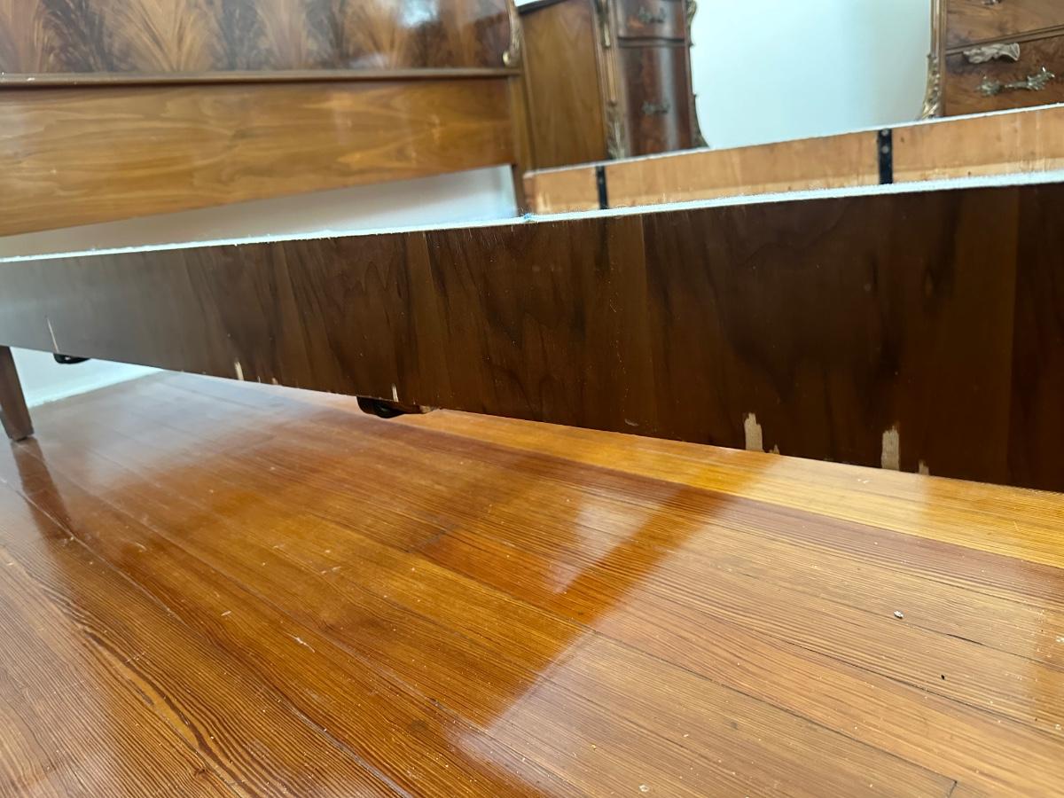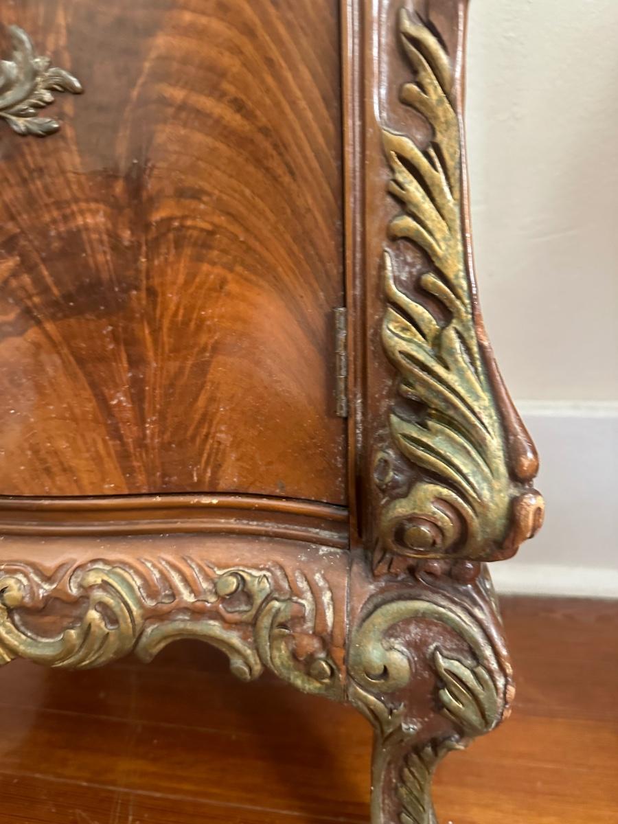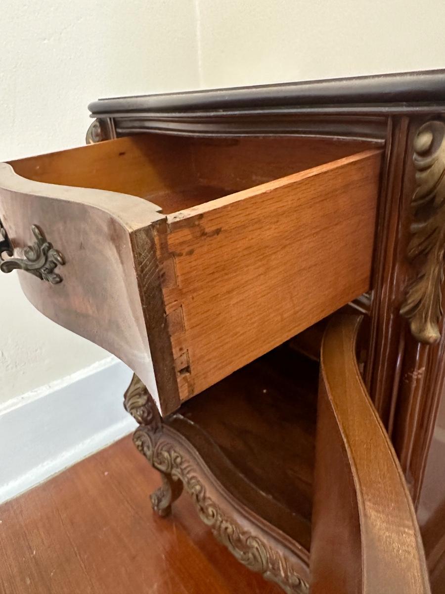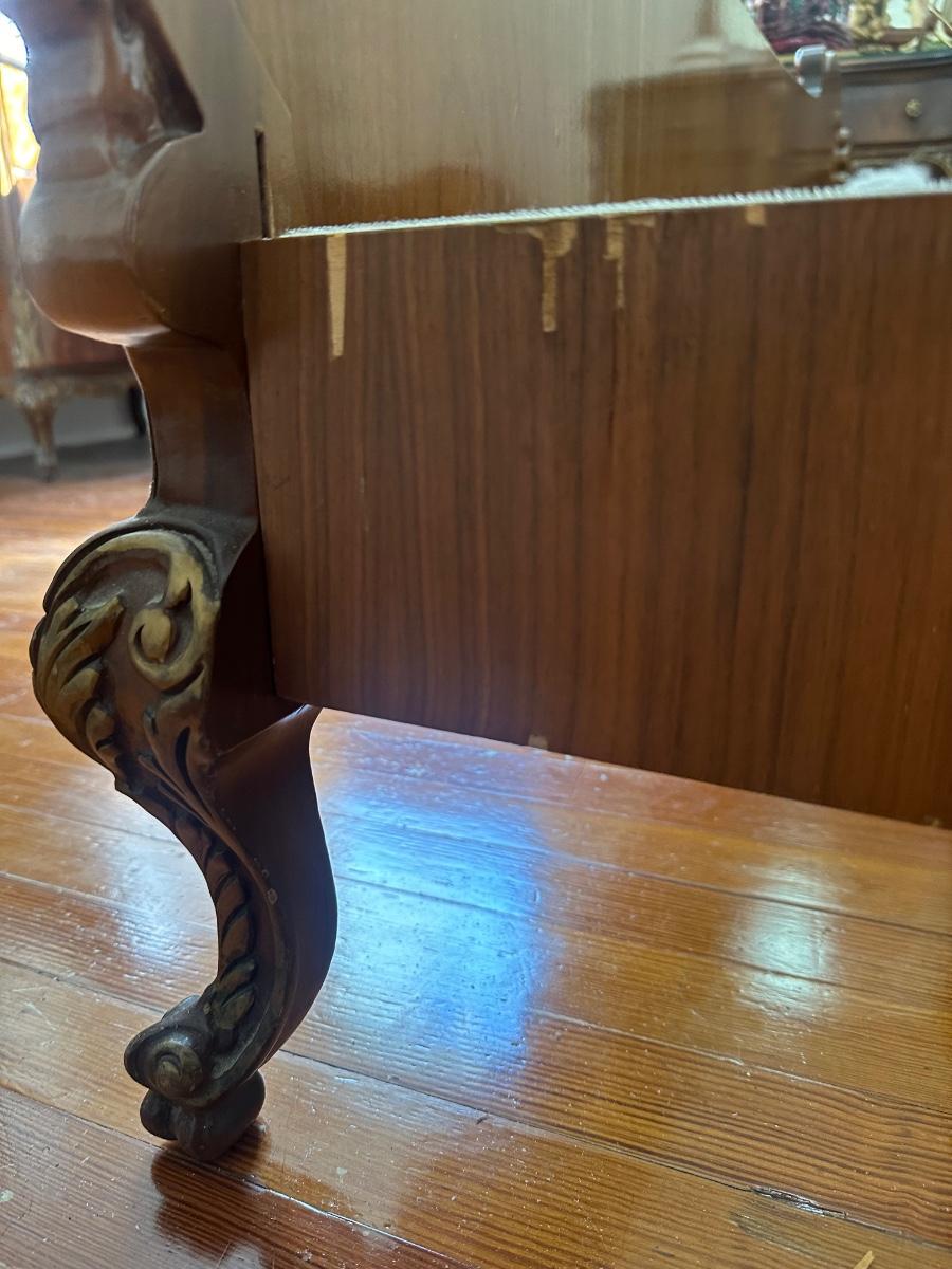 Victorian style double bed frame with nightstand. The bed frame side boards have a few small pieces of veneer missing, pictured. The nightstand has some wear, also pictured. There is a velcro bottom on the top of the bed frame side boards.