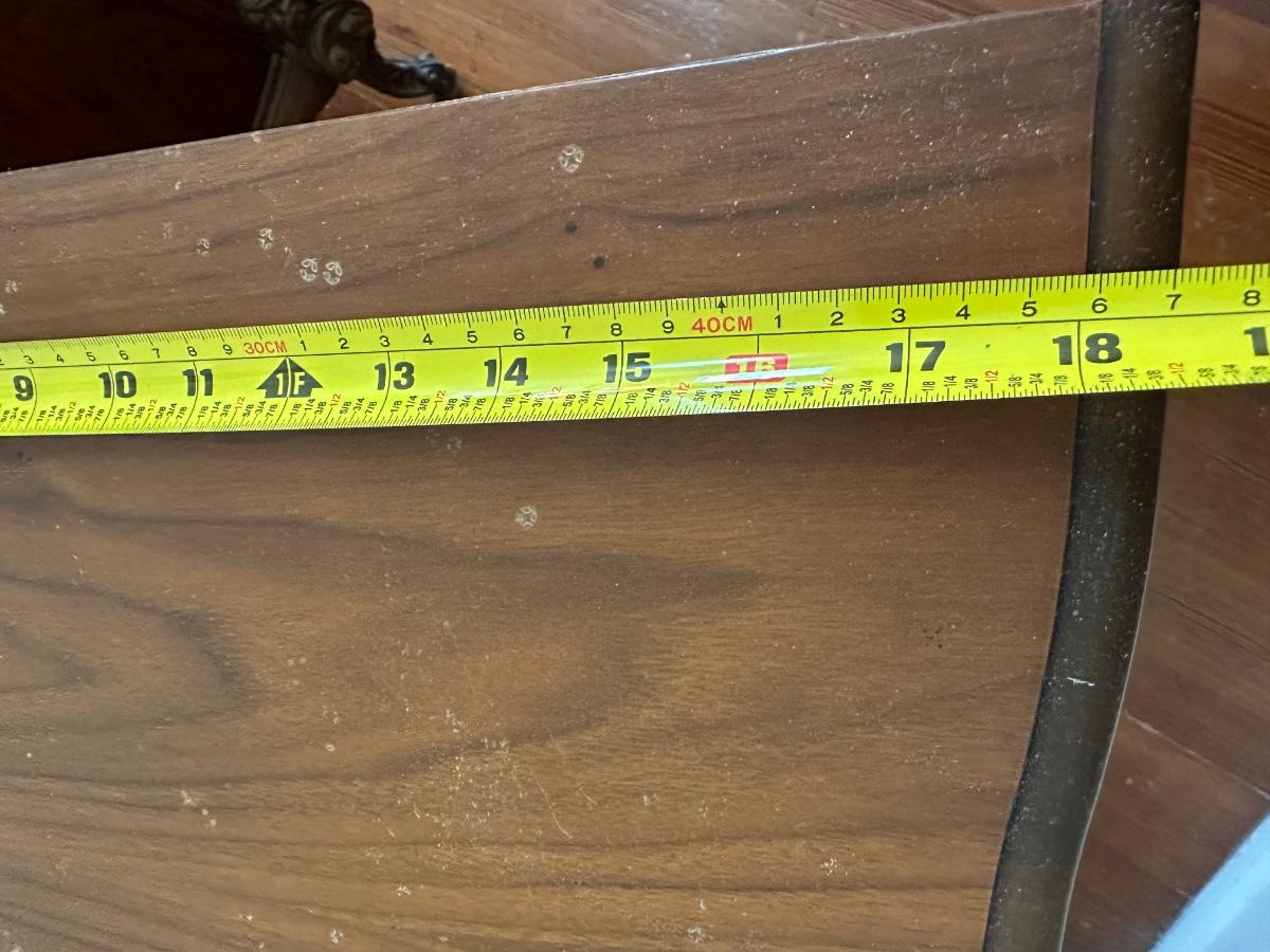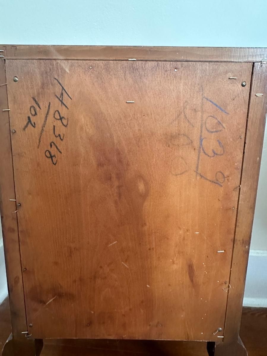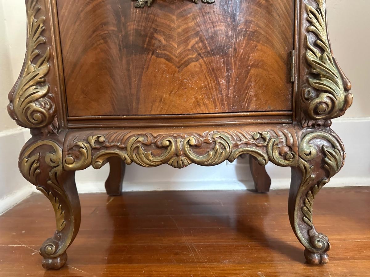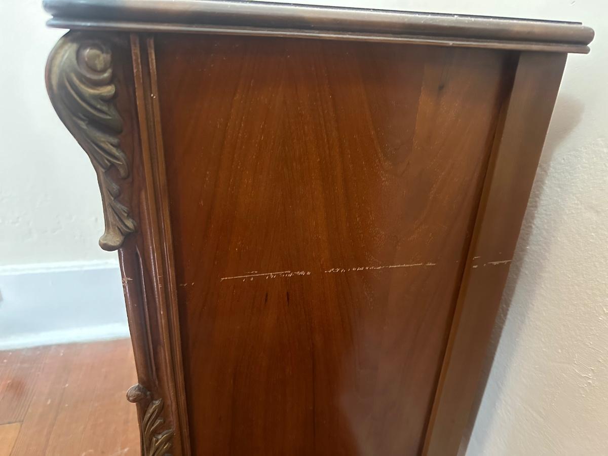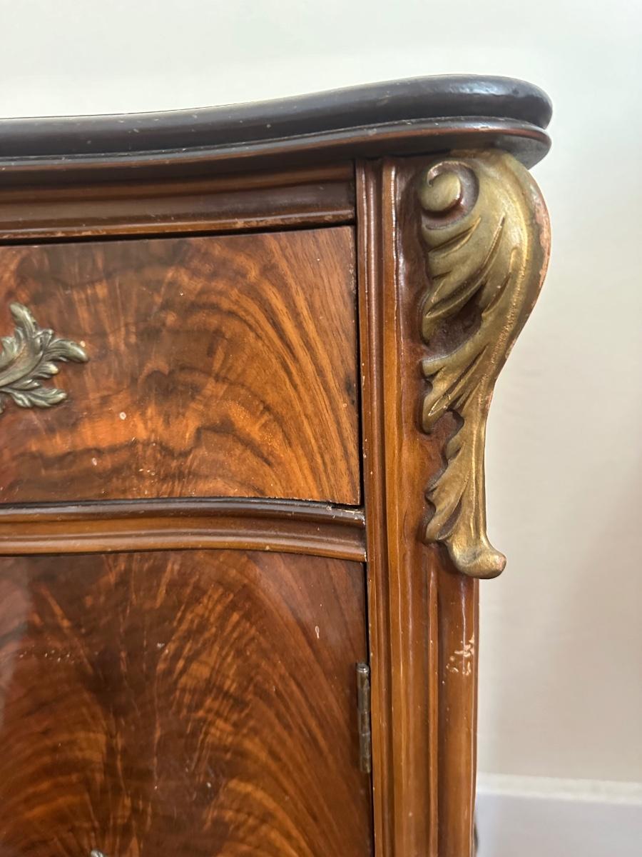 Victorian style double bed frame with nightstand. The bed frame side boards have a few small pieces of veneer missing, pictured. The nightstand has some wear, also pictured. There is a velcro bottom on the top of the bed frame side boards.