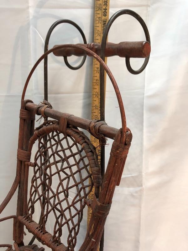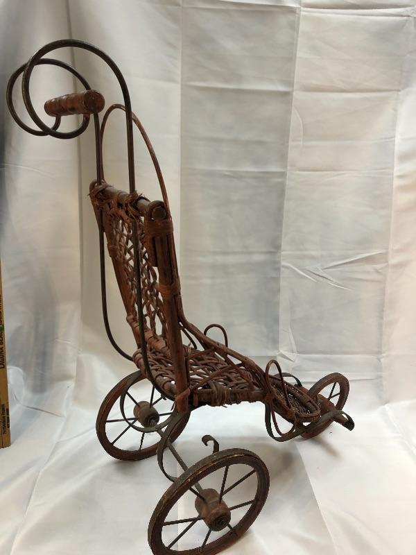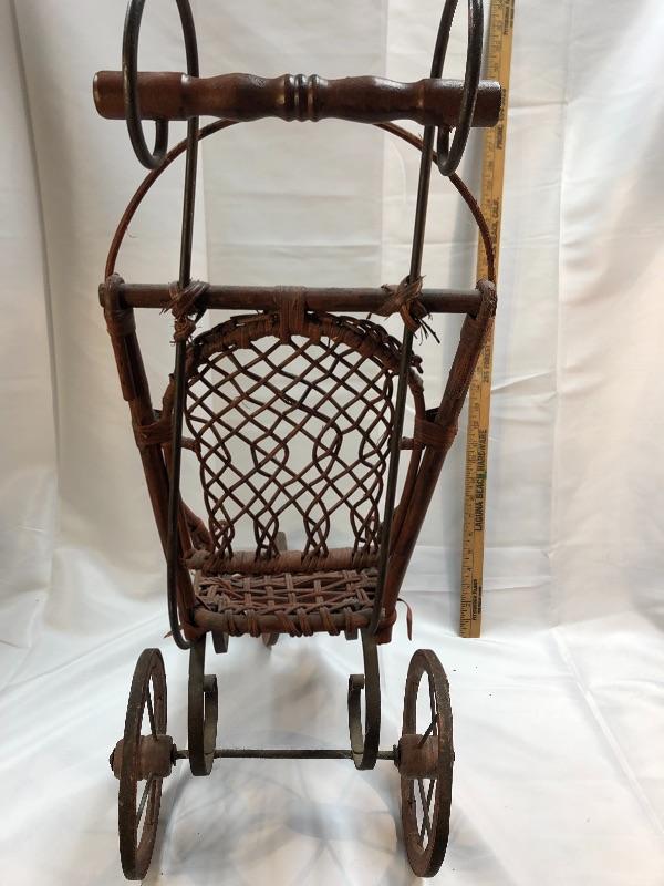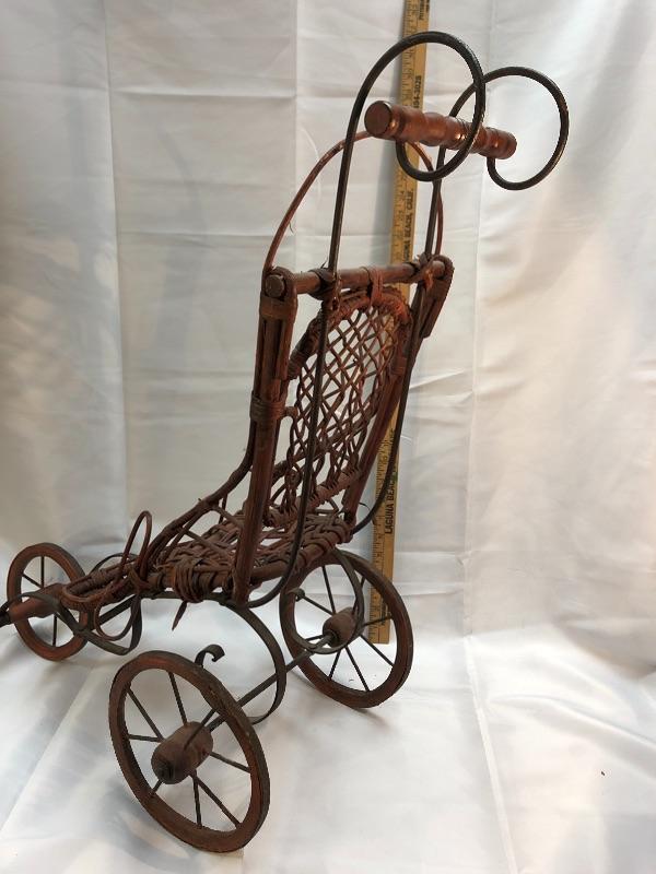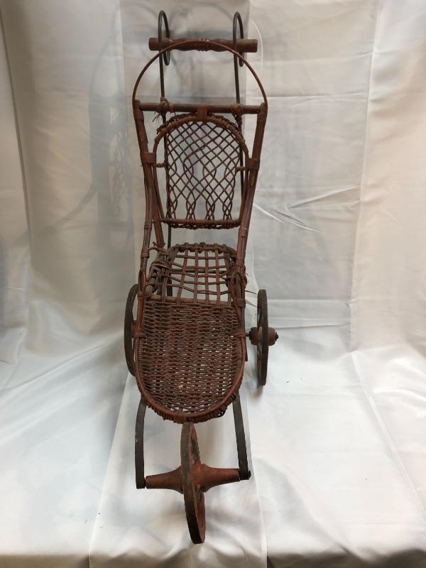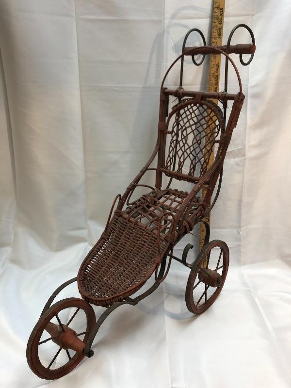 Victorian style brown wicker stroller. 3 wheel design. Measures approx. 28"hx21"x11"w. Believe it is a reproduction. Great for dolls.