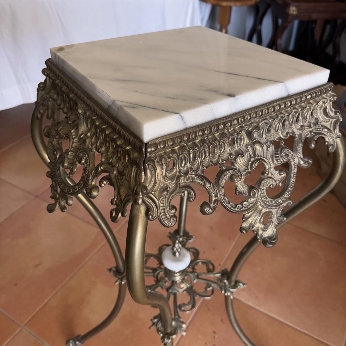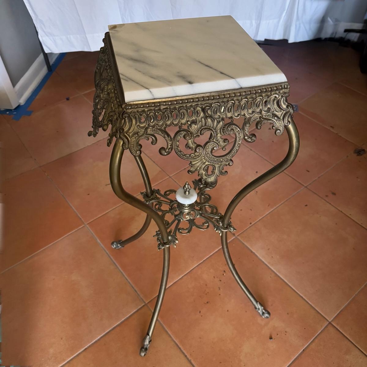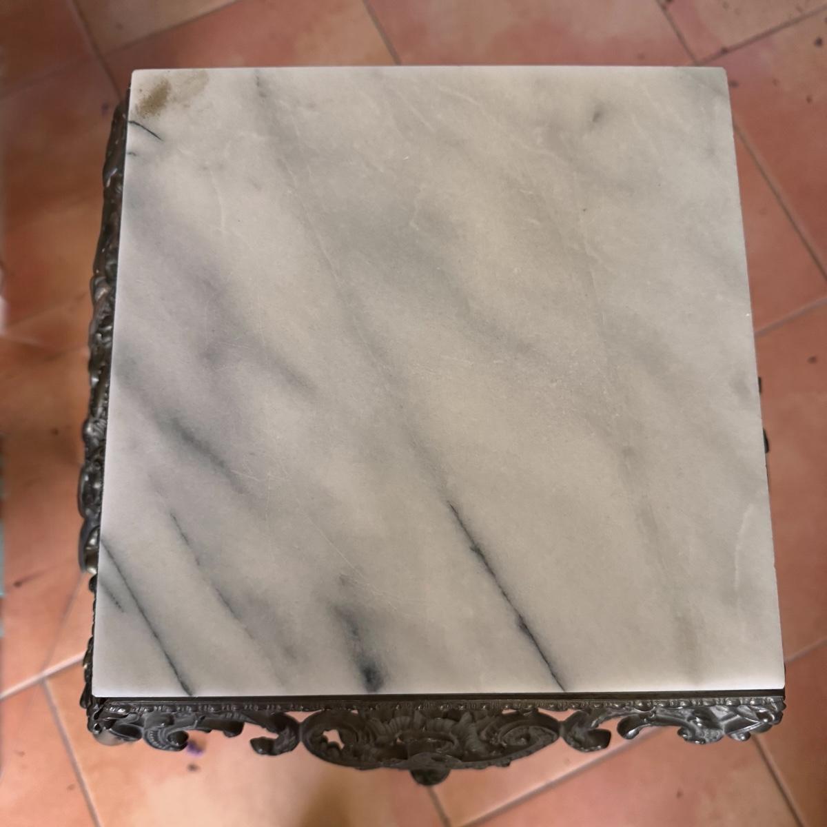 Lot includes one Victorian style metal pedestal table with a marble top. This table has a lovely design with intricate detail. The table measures 15” x 15” x 35”H. Local pickup only.