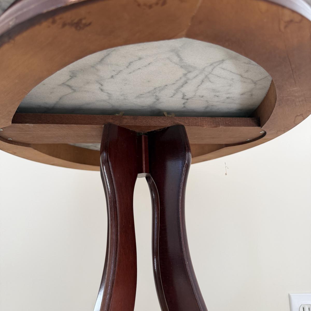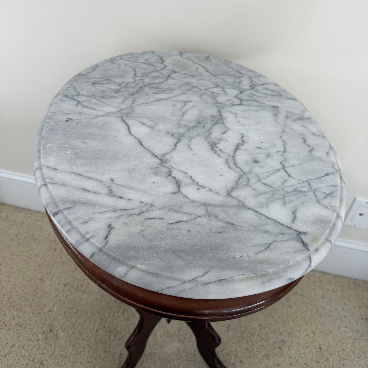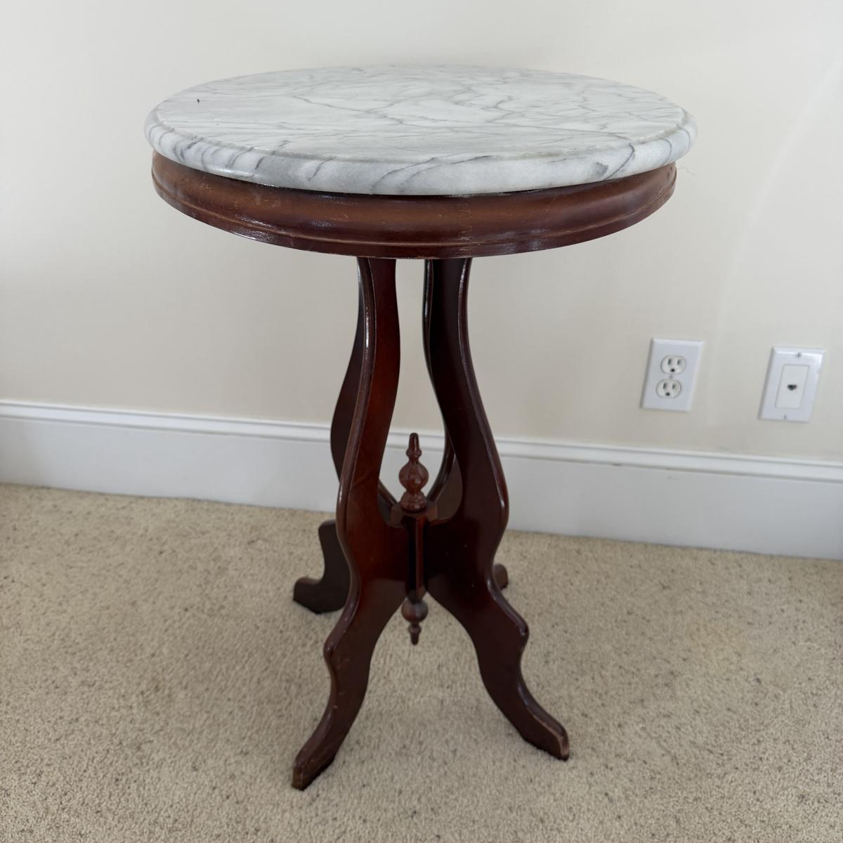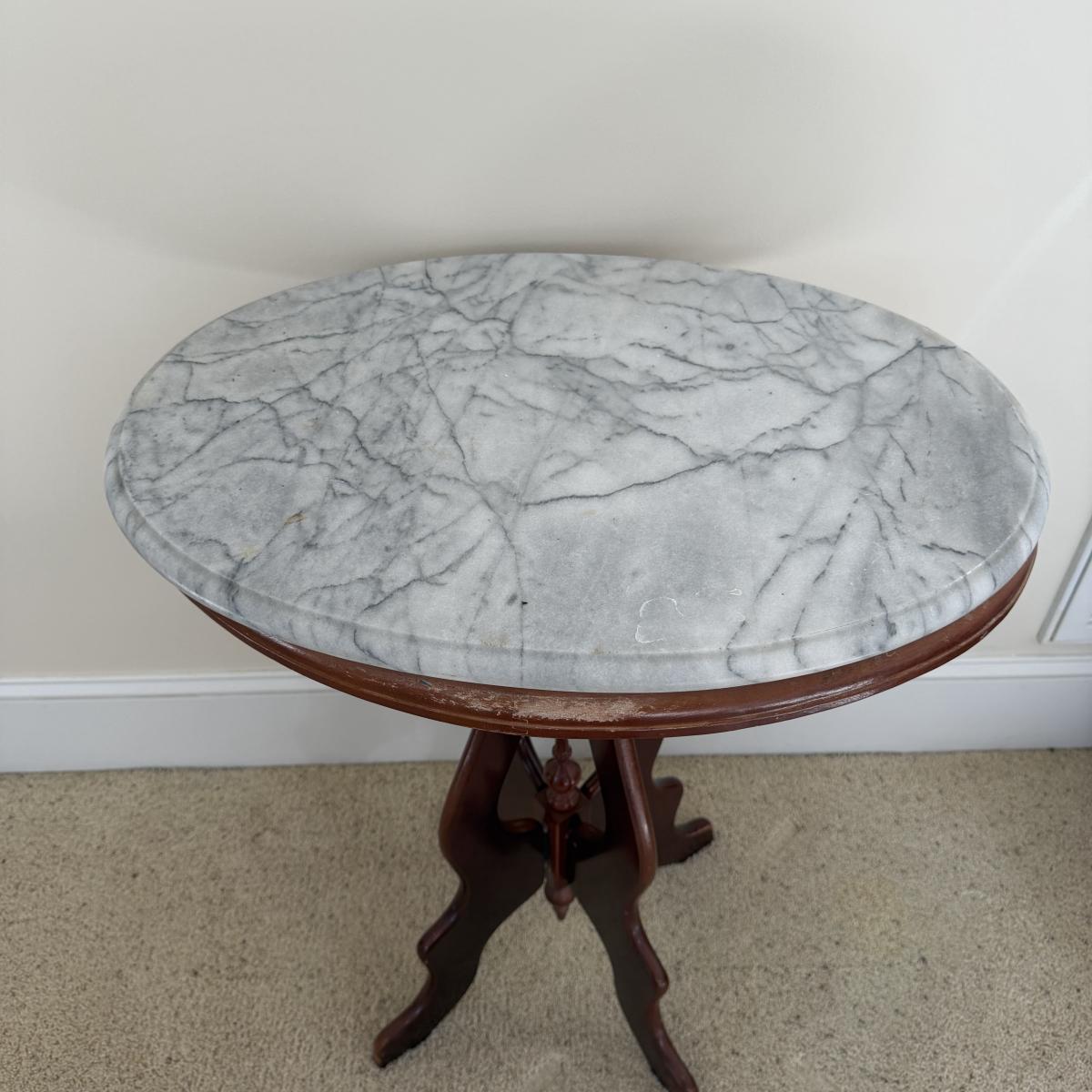 Lot includes a Victorian style marble top table. Tables appear measures 24” x 18” x 28”H. Wooden body has scratches and nicks, see pictures.