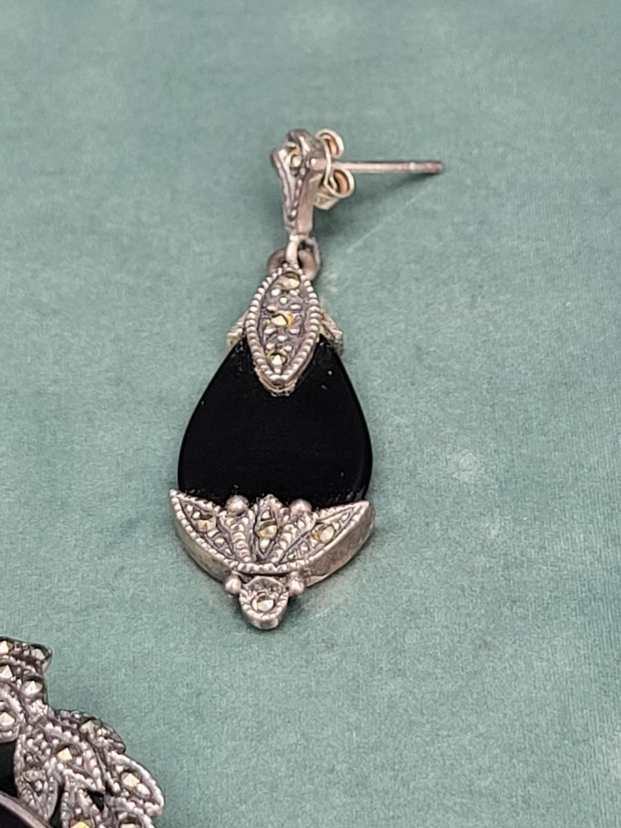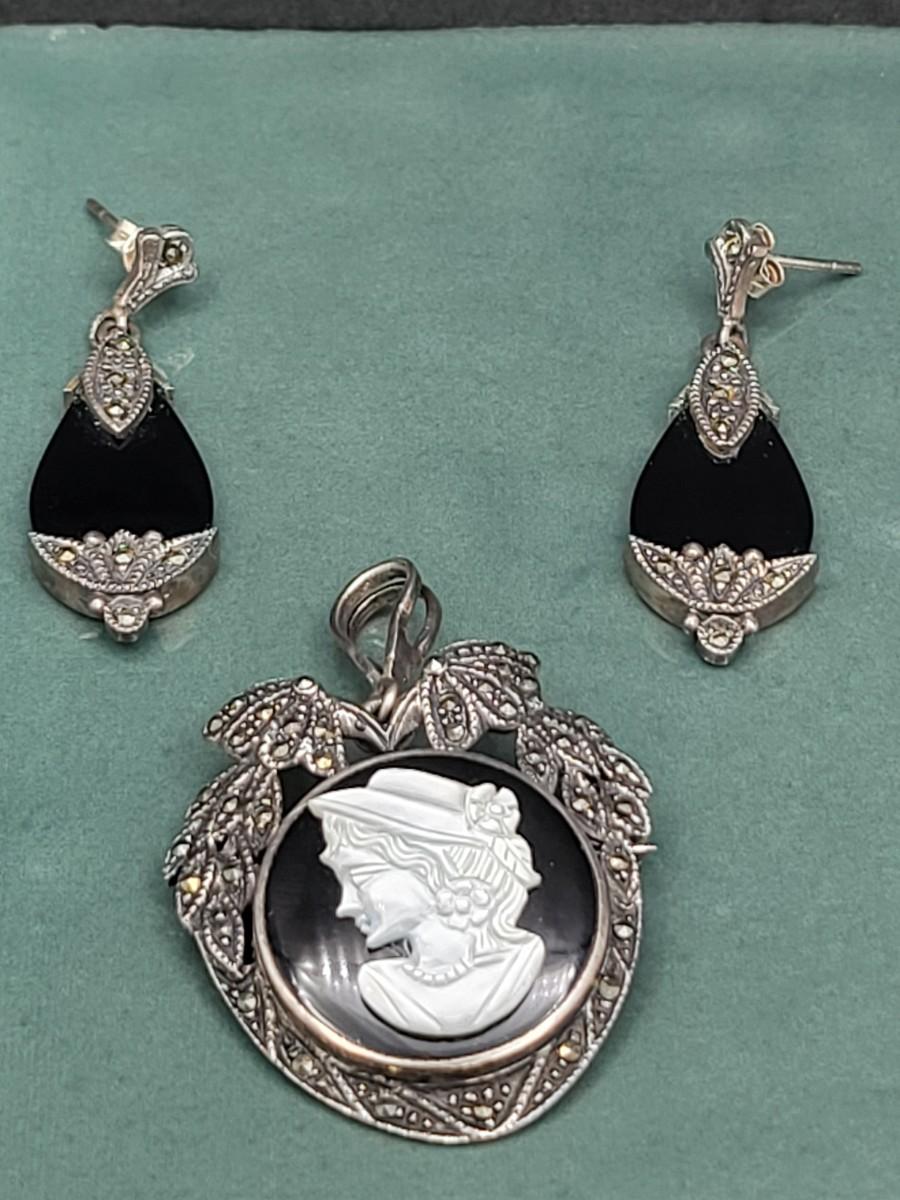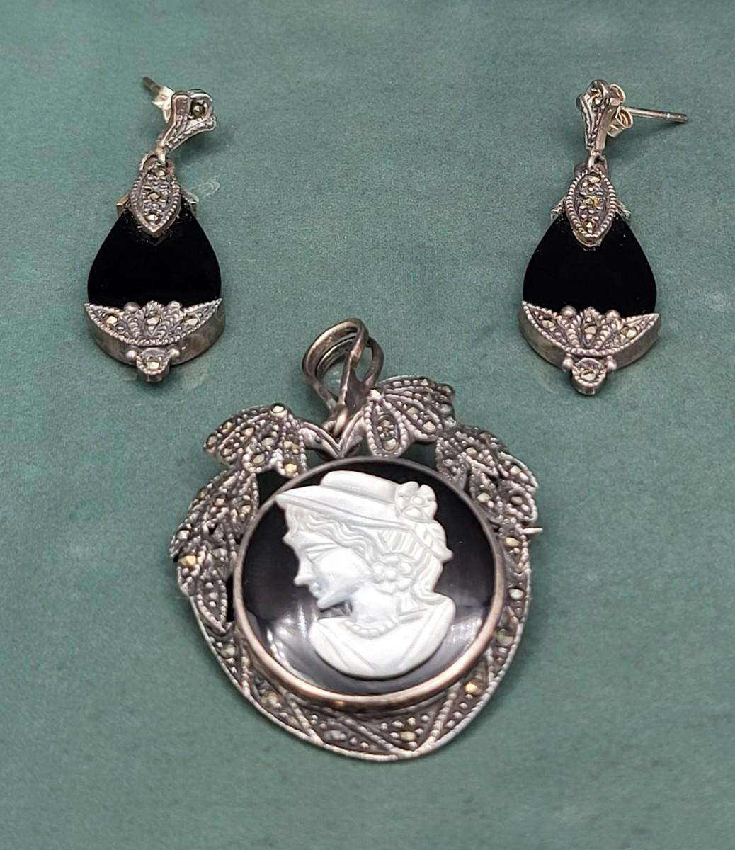 Victorian-Style Sterling Marcasite Onyx Earrings & Cameo Brooch 17.1gr