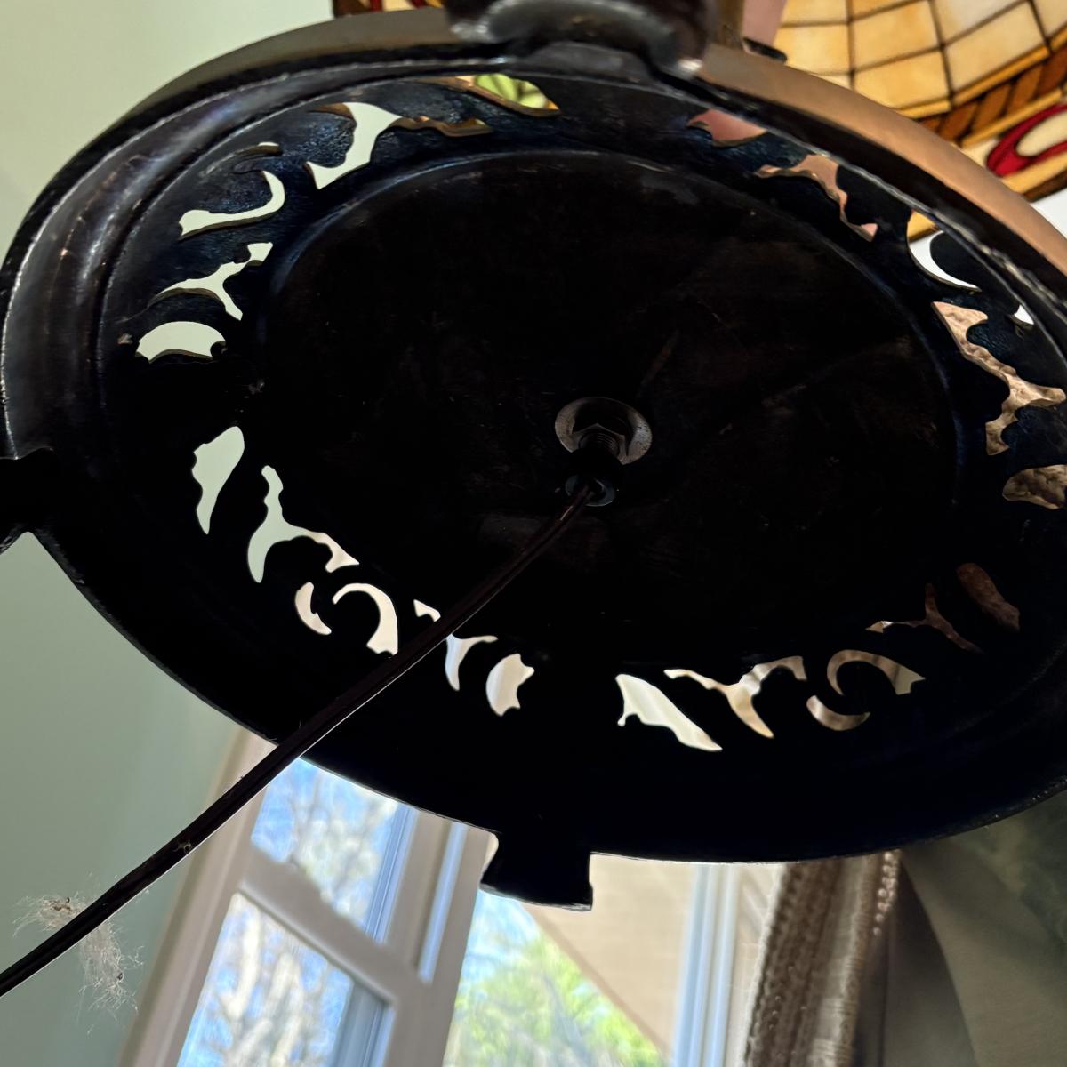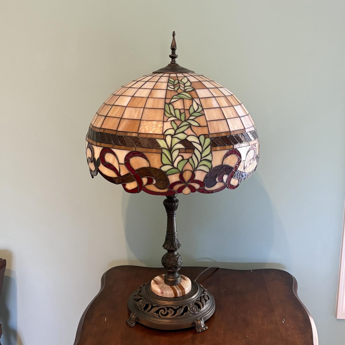 This Victorian Style Stained Glass Lamp features a large dome-shaped shade with leaf and vine design. The shade measures approximately 18"D. The base of the lamp is metal and stone and it measures approximately 12"D. The lamp stands at approximately 32"H.