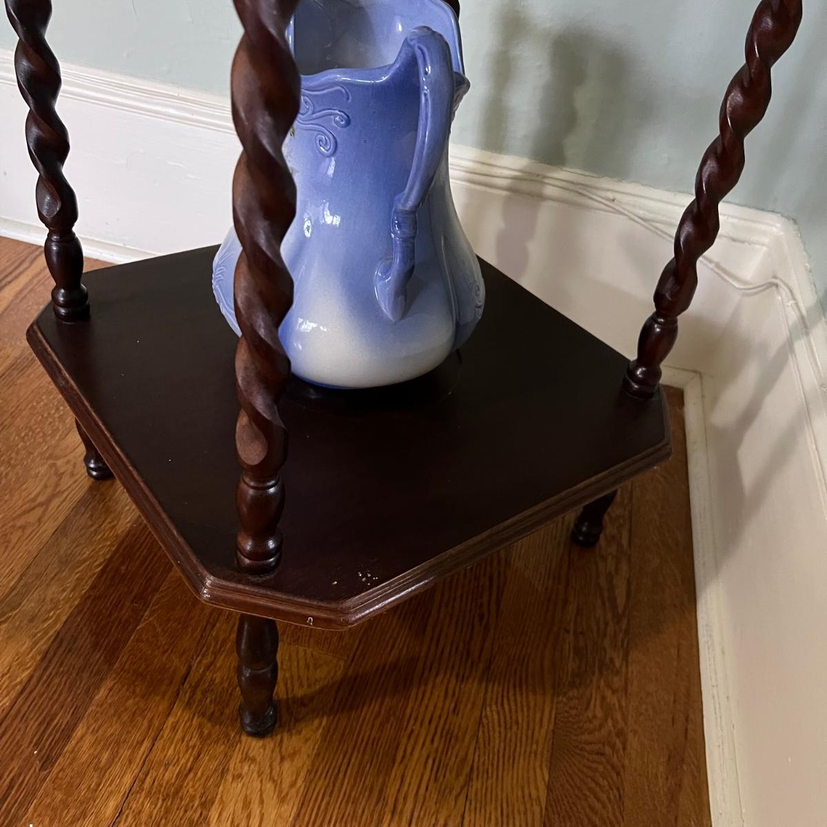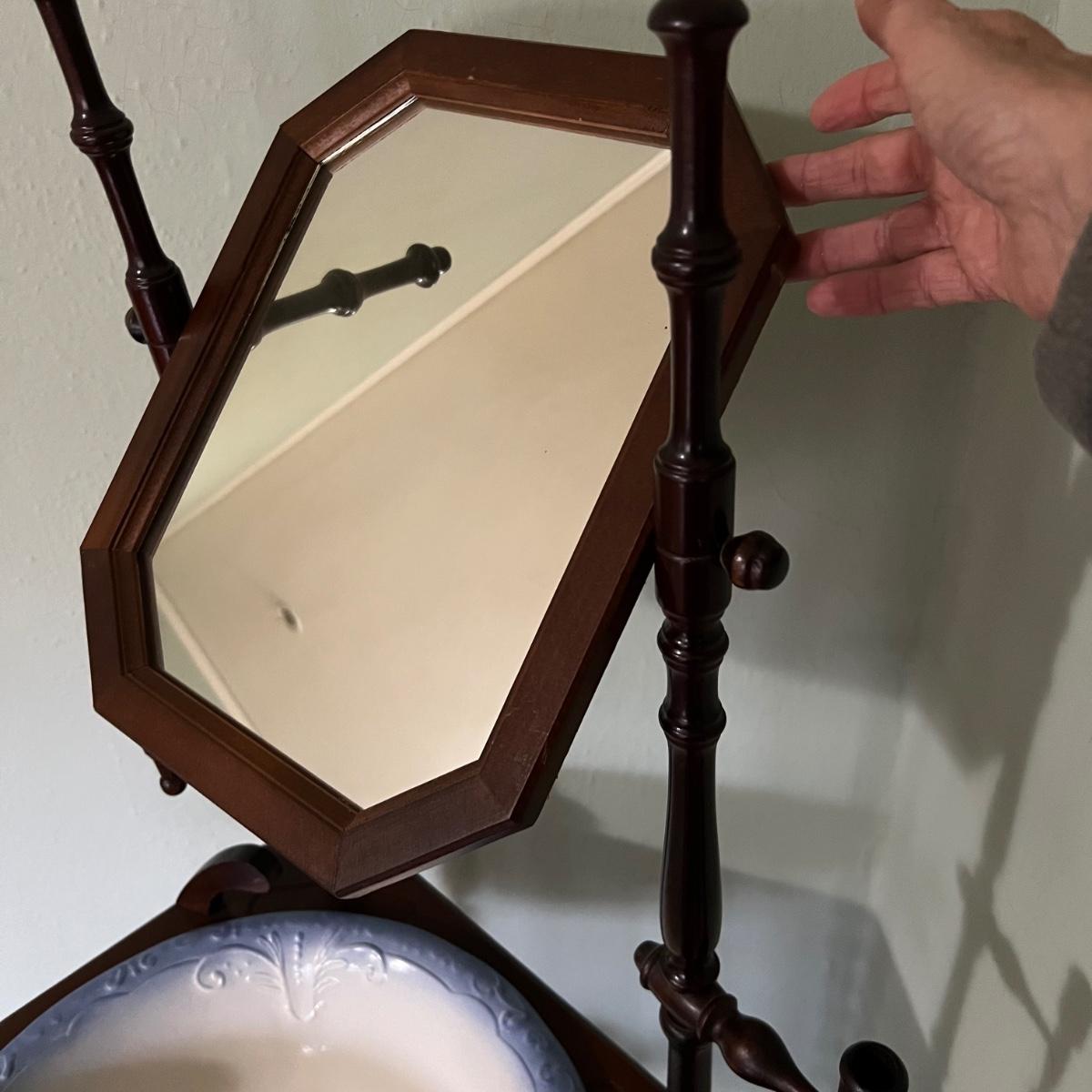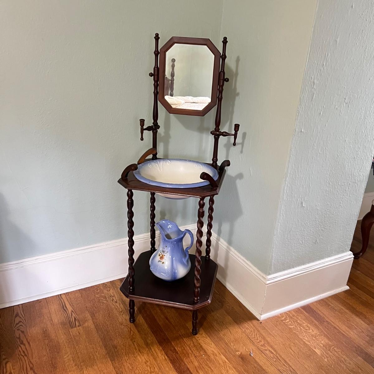 This solid wood wash stand has a tilting mirror and barley twist legs. The accompanying wash basin and pitcher are English Ironstone. Note that there are a couple of small spots in the basin which might be permanent.