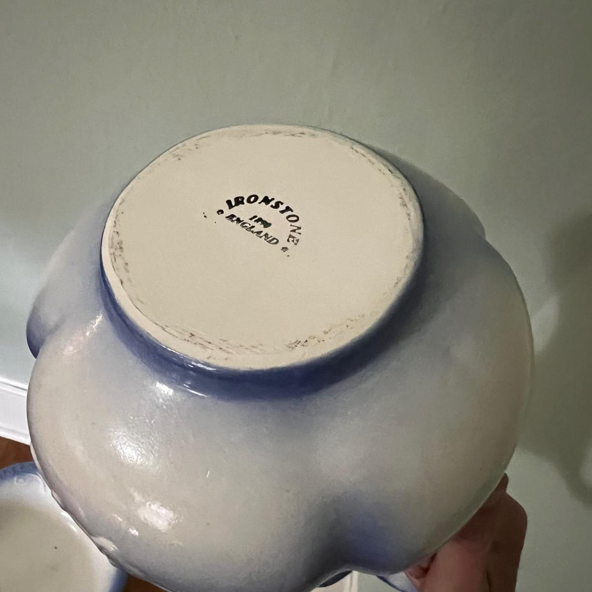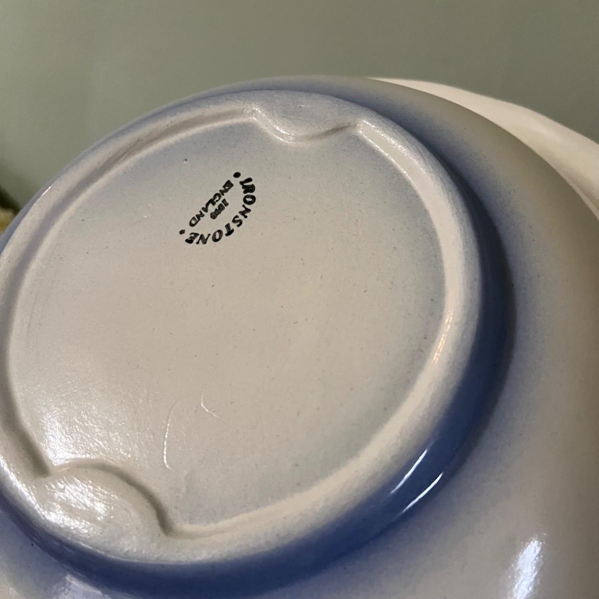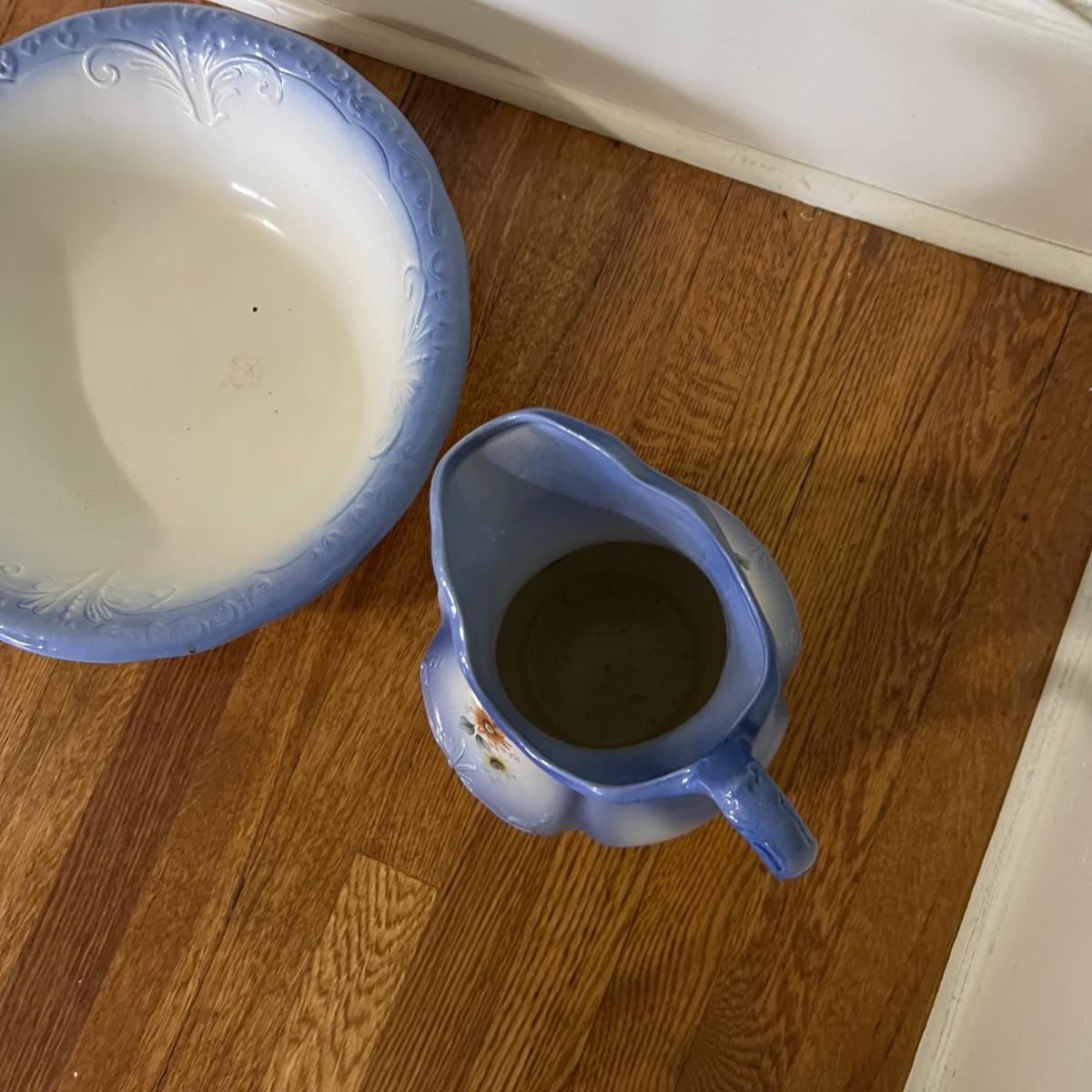 This solid wood wash stand has a tilting mirror and barley twist legs. The accompanying wash basin and pitcher are English Ironstone. Note that there are a couple of small spots in the basin which might be permanent.