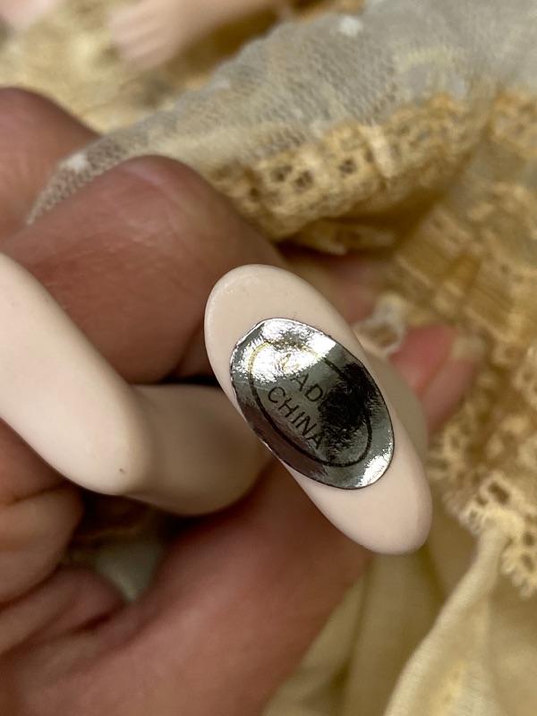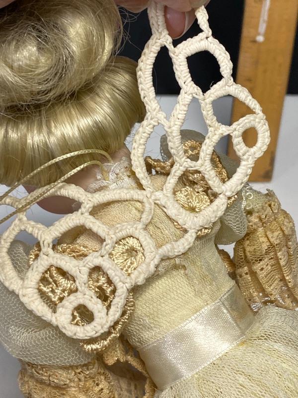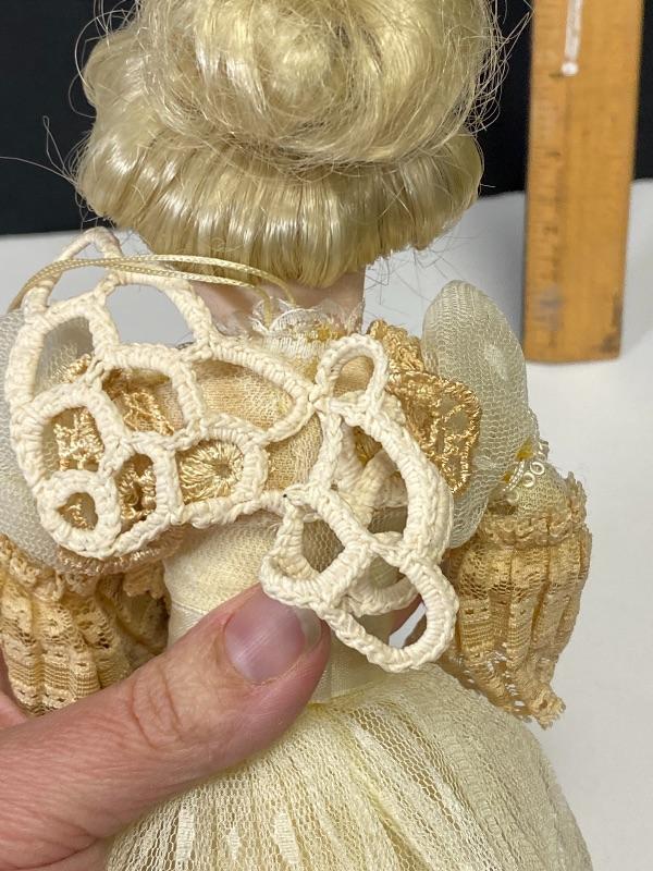 Victorian style hanging doll ornament. Lace dress, looks like someone added crochet wings to her back. Bendable limbs. Made in China.