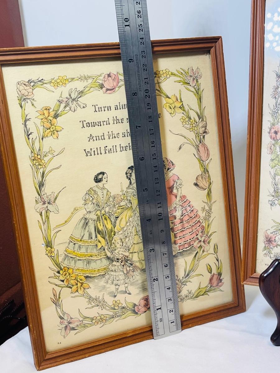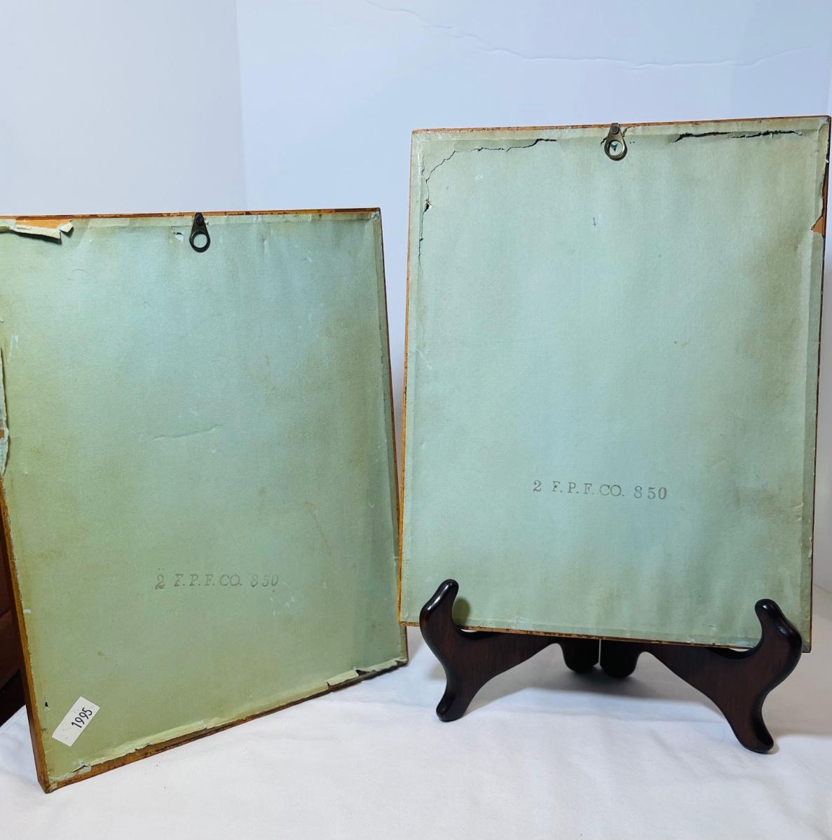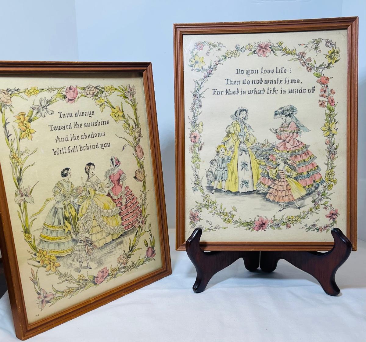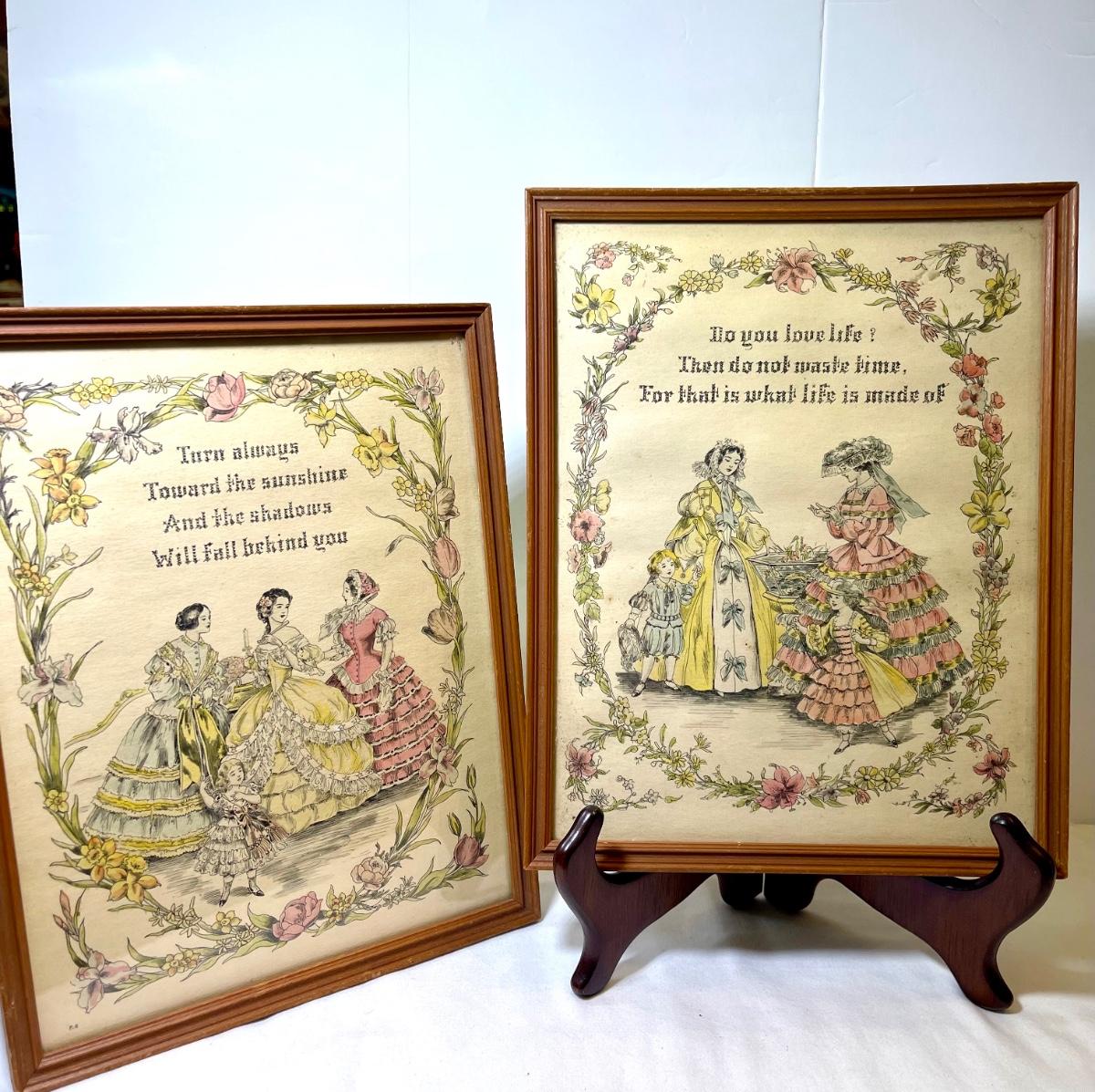 These look to be pages from a book as 1 is marked p3 and the other p4 as pictured. There is much going on in these pictures. Take a look at the detail. Definitely from another time. Frames are wood. Backing is coming apart on both frames so one may need to remedy. They would hang fine as is. They’re really pretty!! Would make a great addition to a powder room, vanity area or sunroom. Dirt and signs of age are apparent and present on all vintage items.