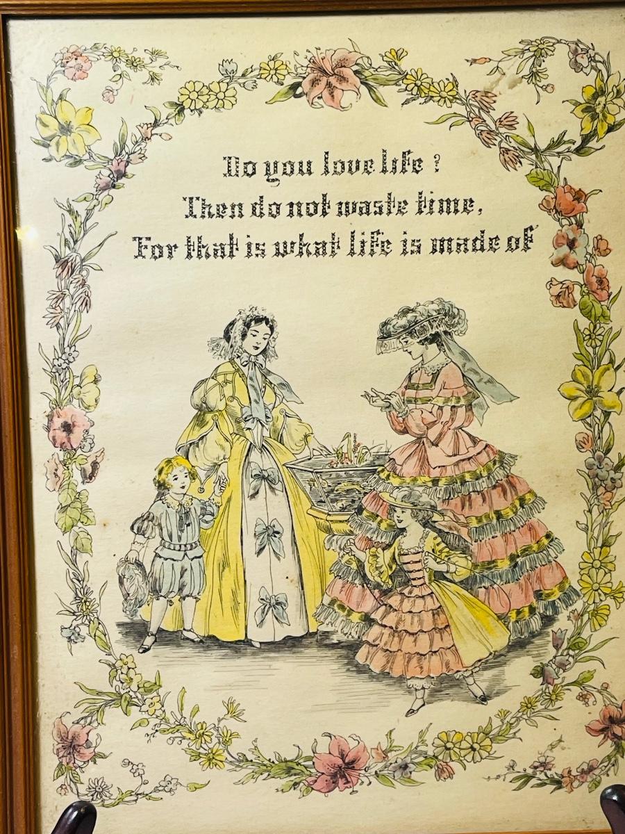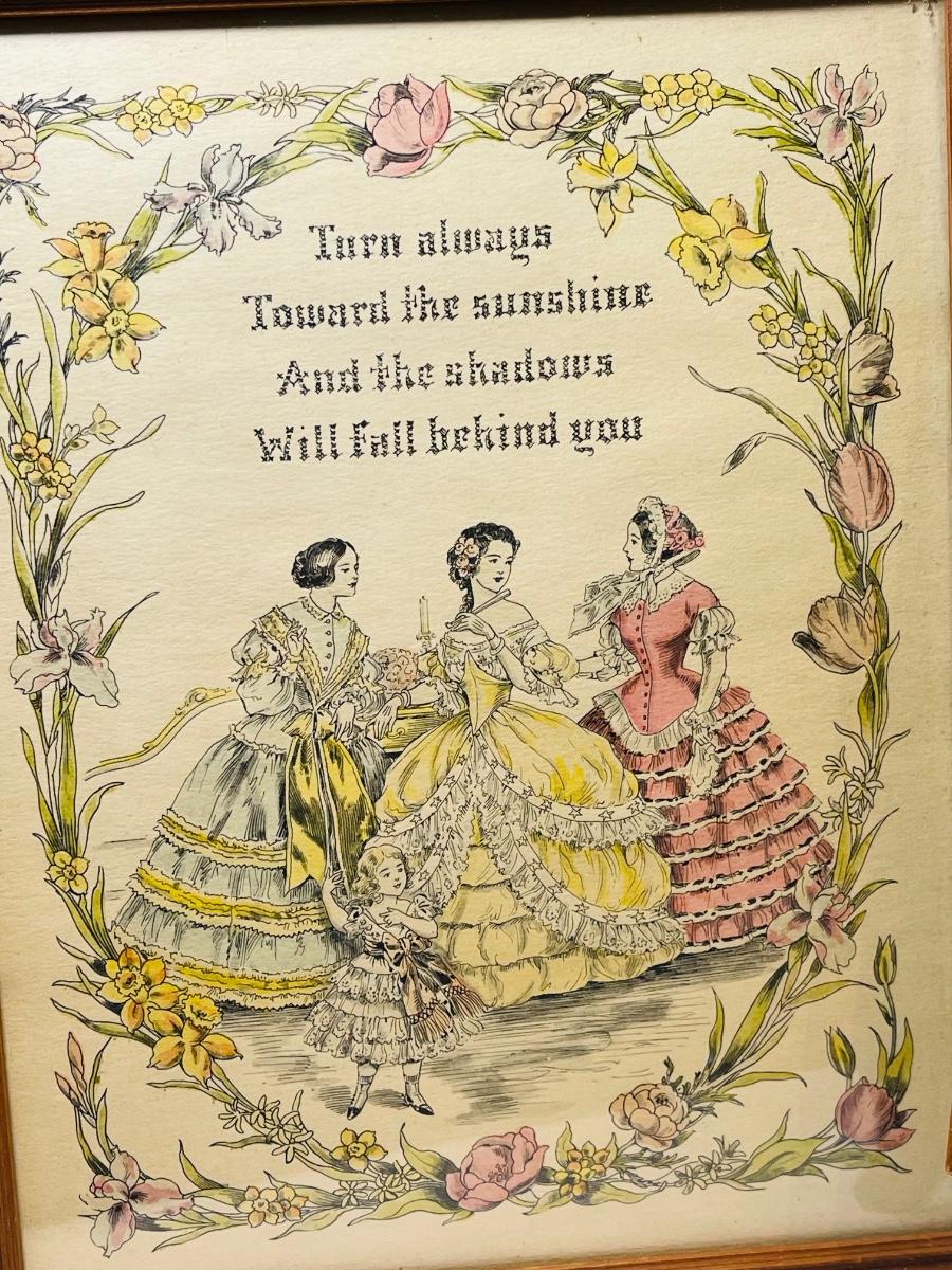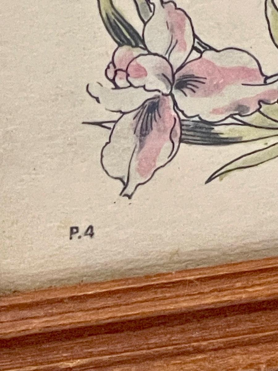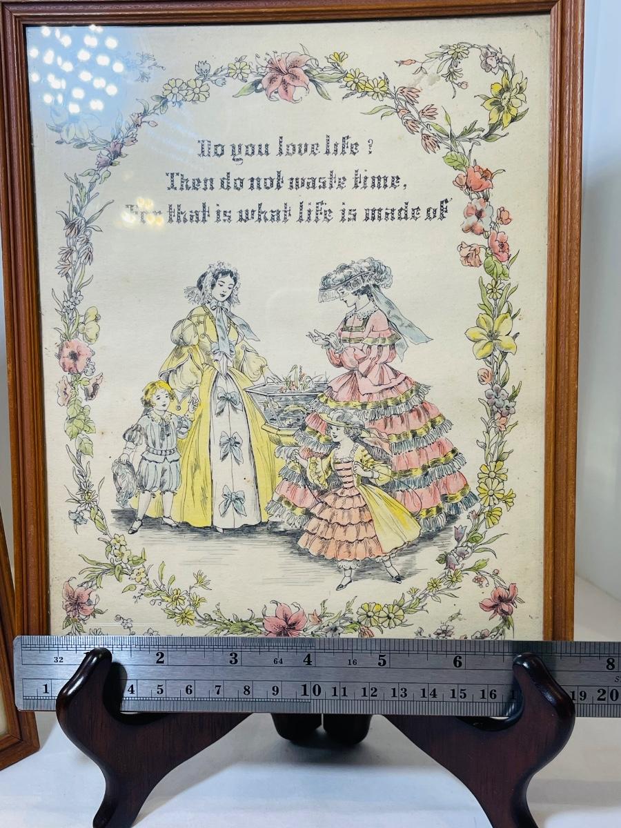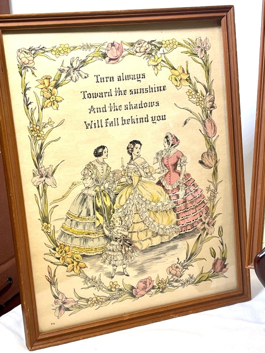 These look to be pages from a book as 1 is marked p3 and the other p4 as pictured. There is much going on in these pictures. Take a look at the detail. Definitely from another time. Frames are wood. Backing is coming apart on both frames so one may need to remedy. They would hang fine as is. They’re really pretty!! Would make a great addition to a powder room, vanity area or sunroom. Dirt and signs of age are apparent and present on all vintage items.
