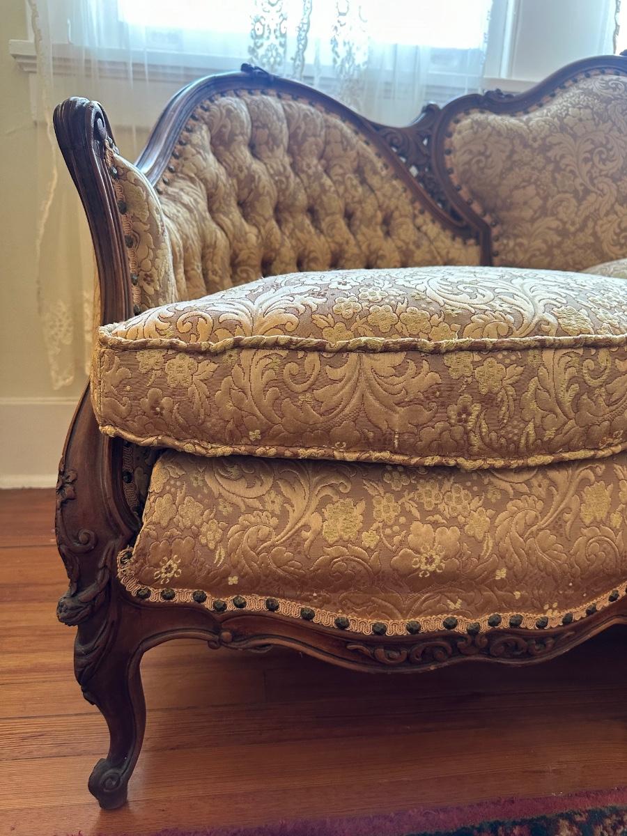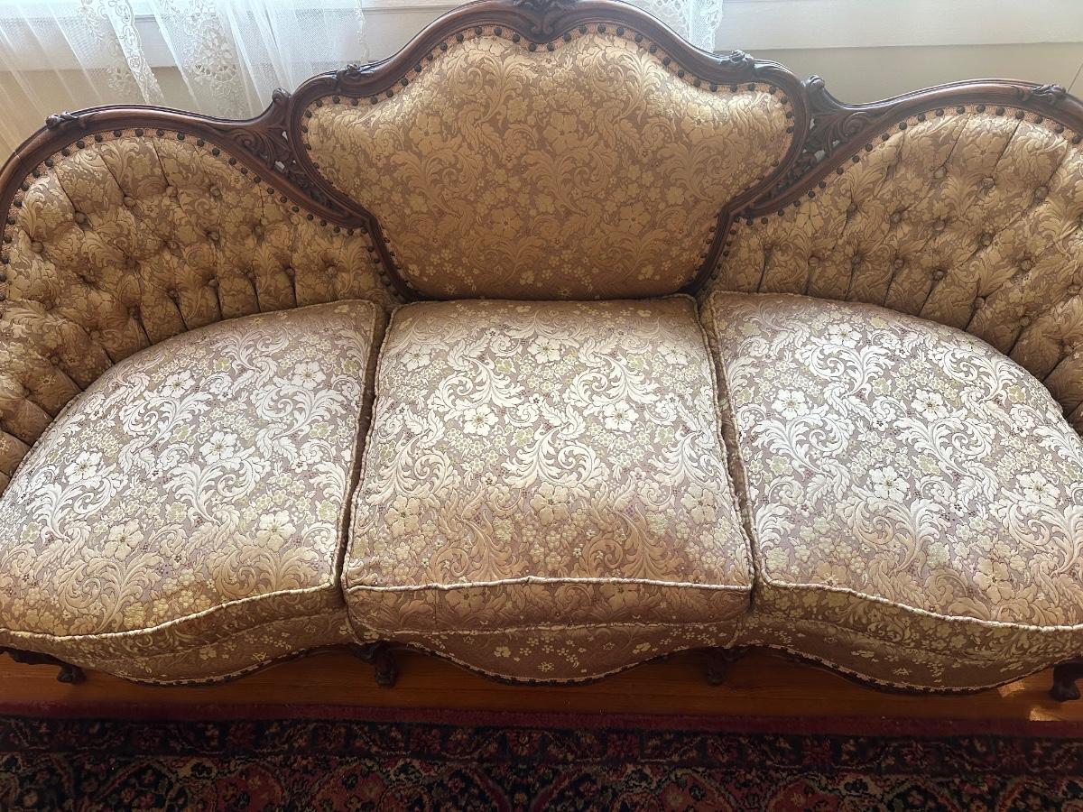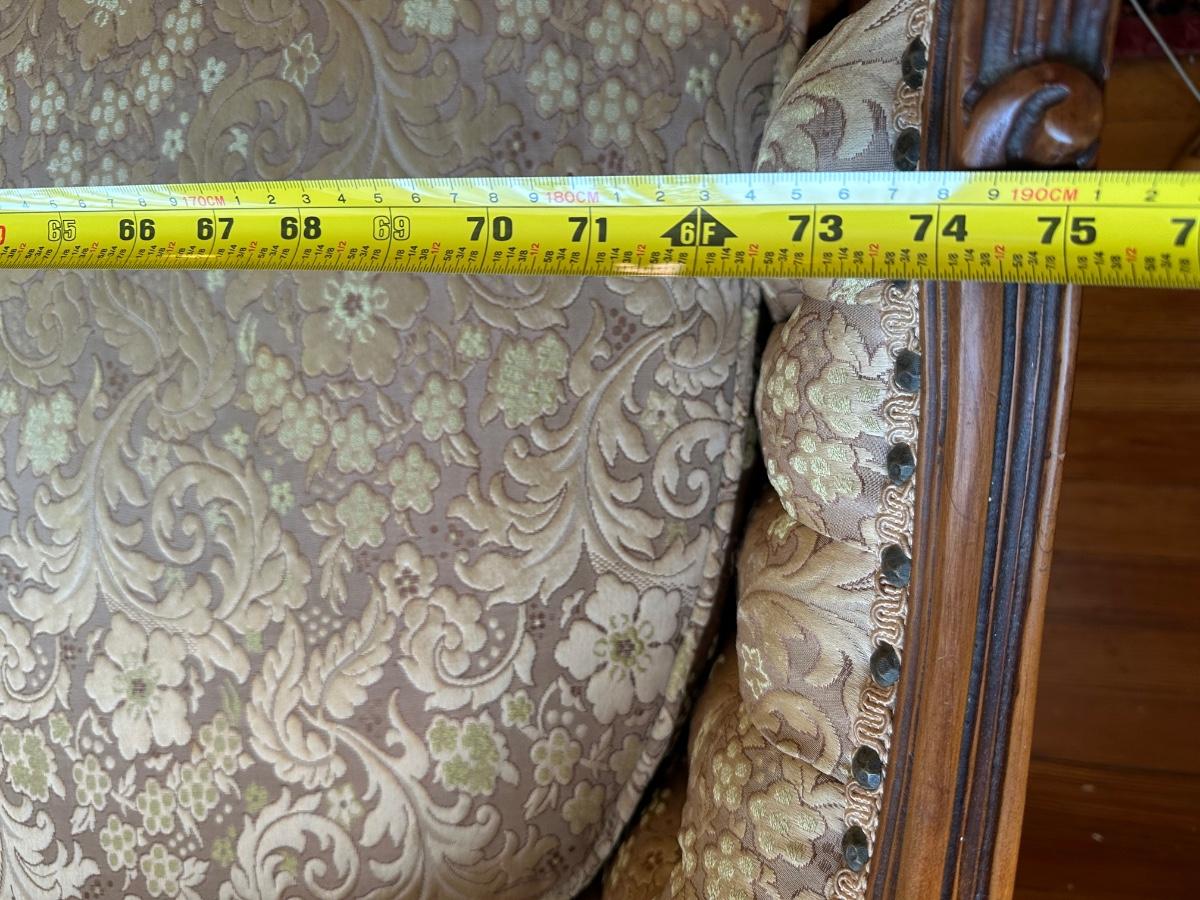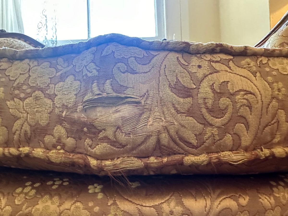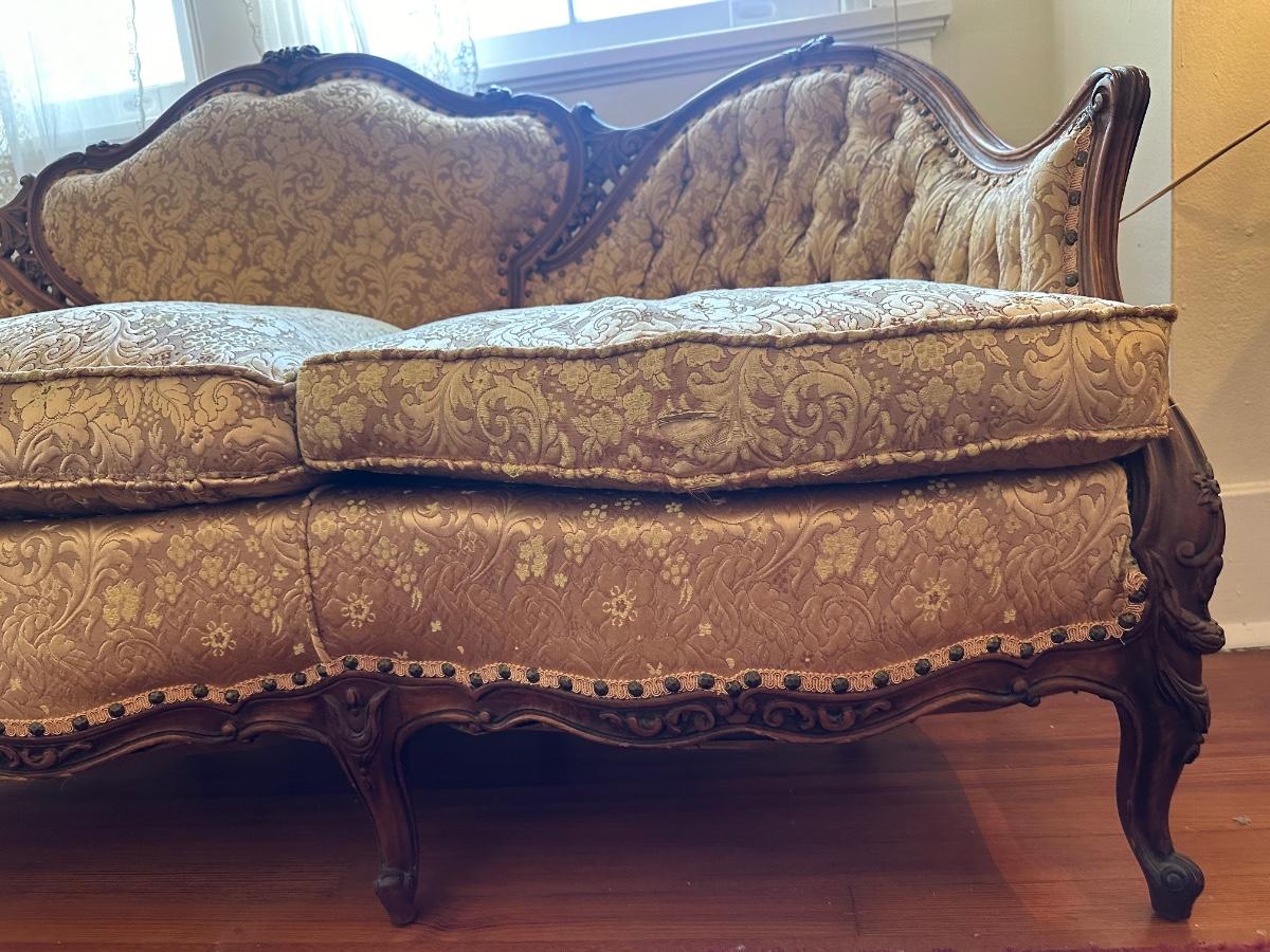 Beautiful woodwork on sofa. There is a tear in one front cushion seat, see picture. Also, there is a break in the wood arm rest - see last pictures.