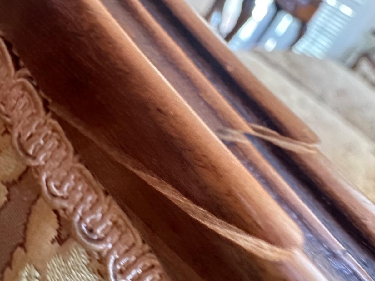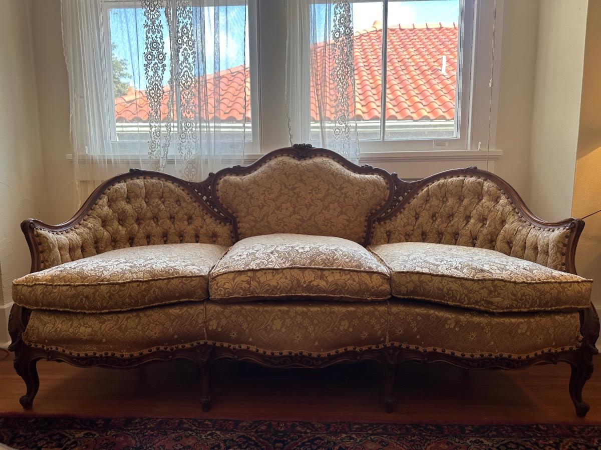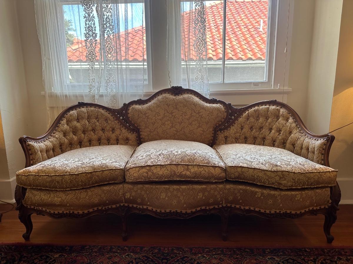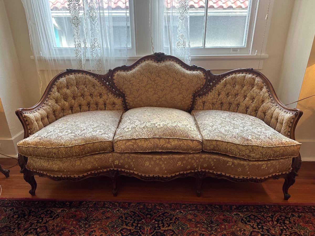 Beautiful woodwork on sofa. There is a tear in one front cushion seat, see picture. Also, there is a break in the wood arm rest - see last pictures.