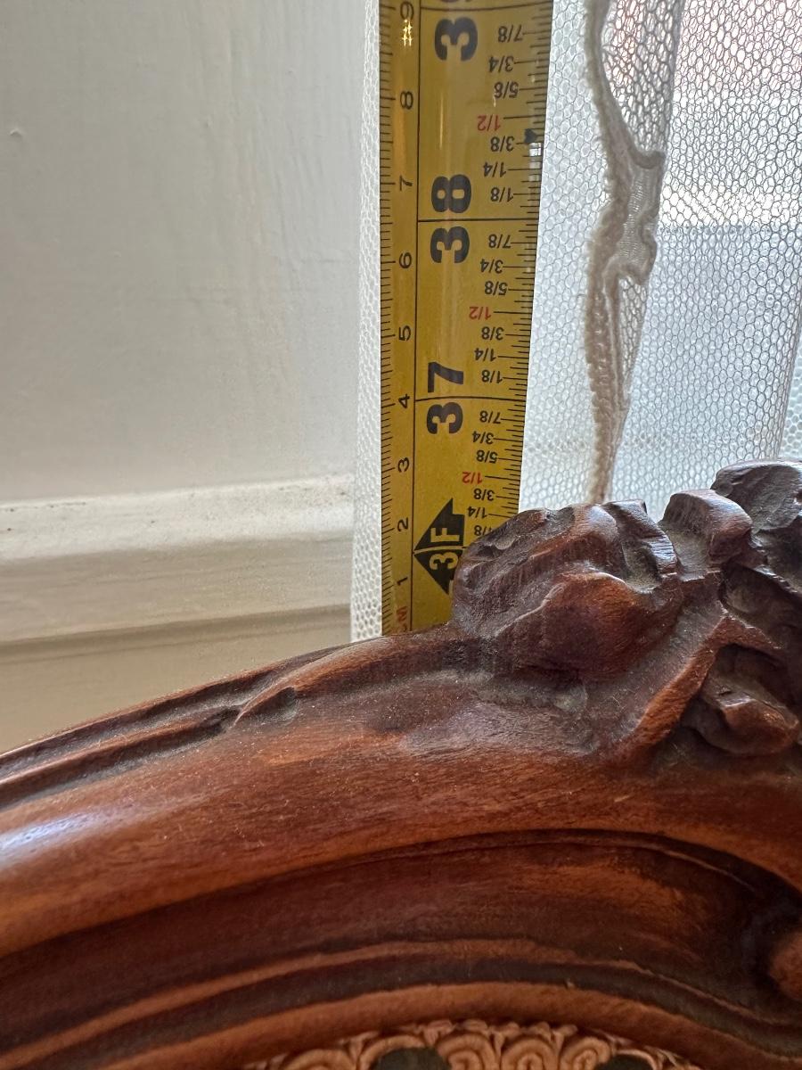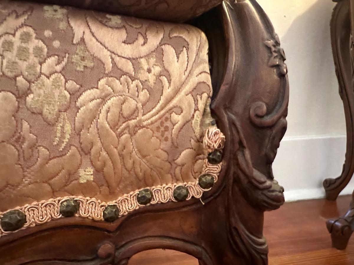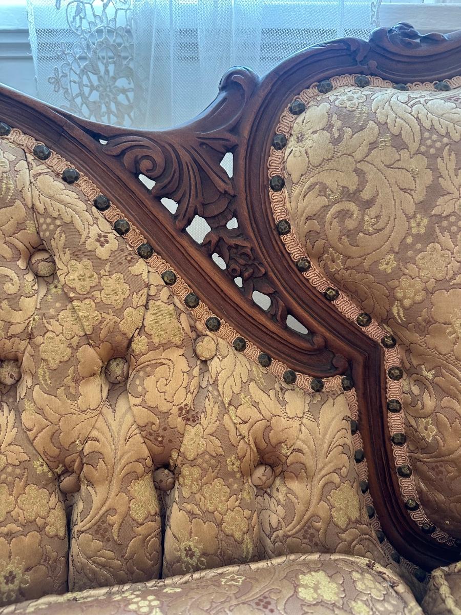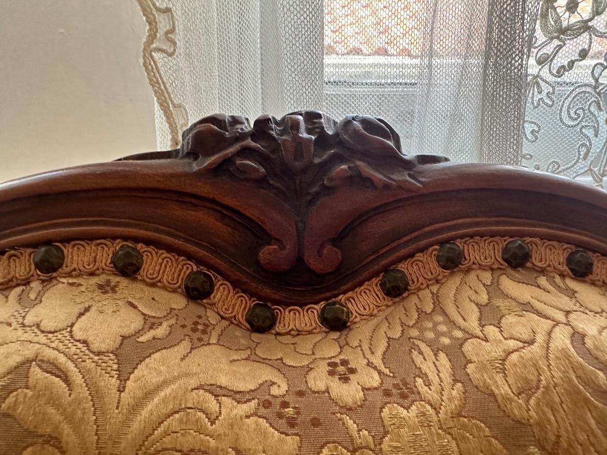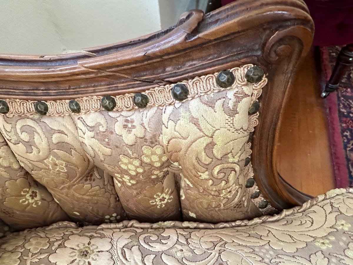 Beautiful woodwork on sofa. There is a tear in one front cushion seat, see picture. Also, there is a break in the wood arm rest - see last pictures.