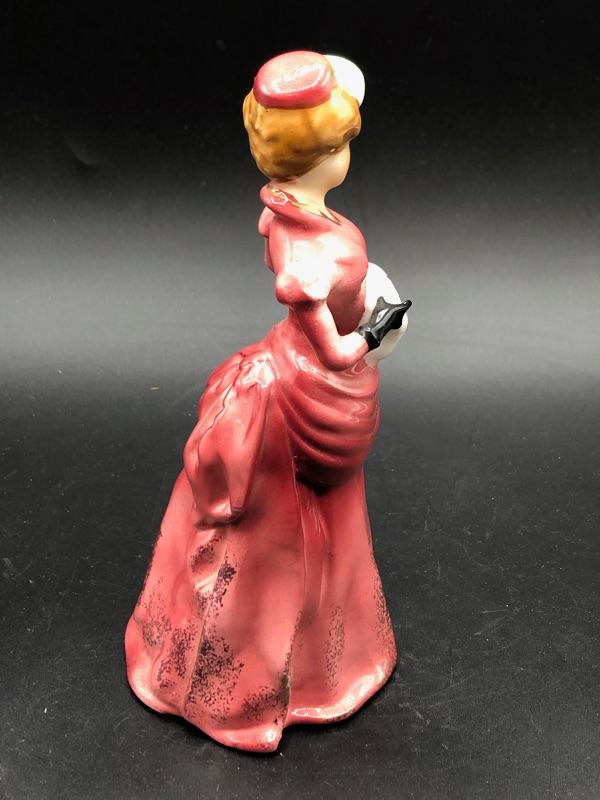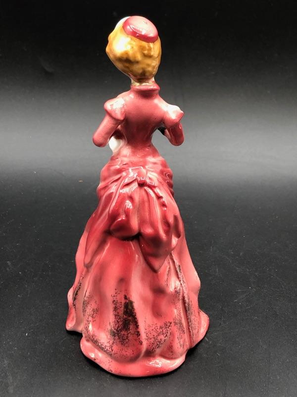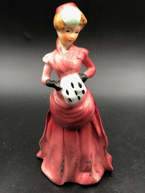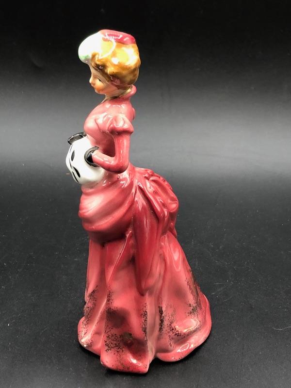 Vintage Victorian woman figurine. Wearing a pink colored dress. Unmarked. Good condition.