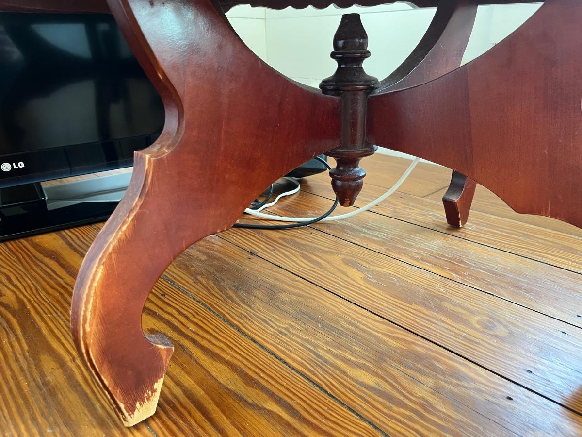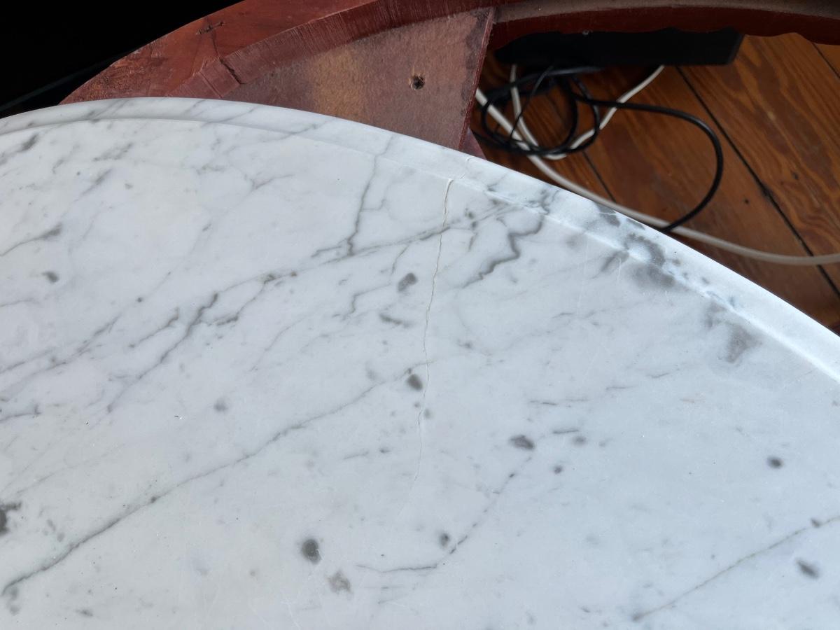 Vintage Victorian-style low marble top table; approx. 17.5" x 33.5" x 22"; wear to base, crack to part of marble