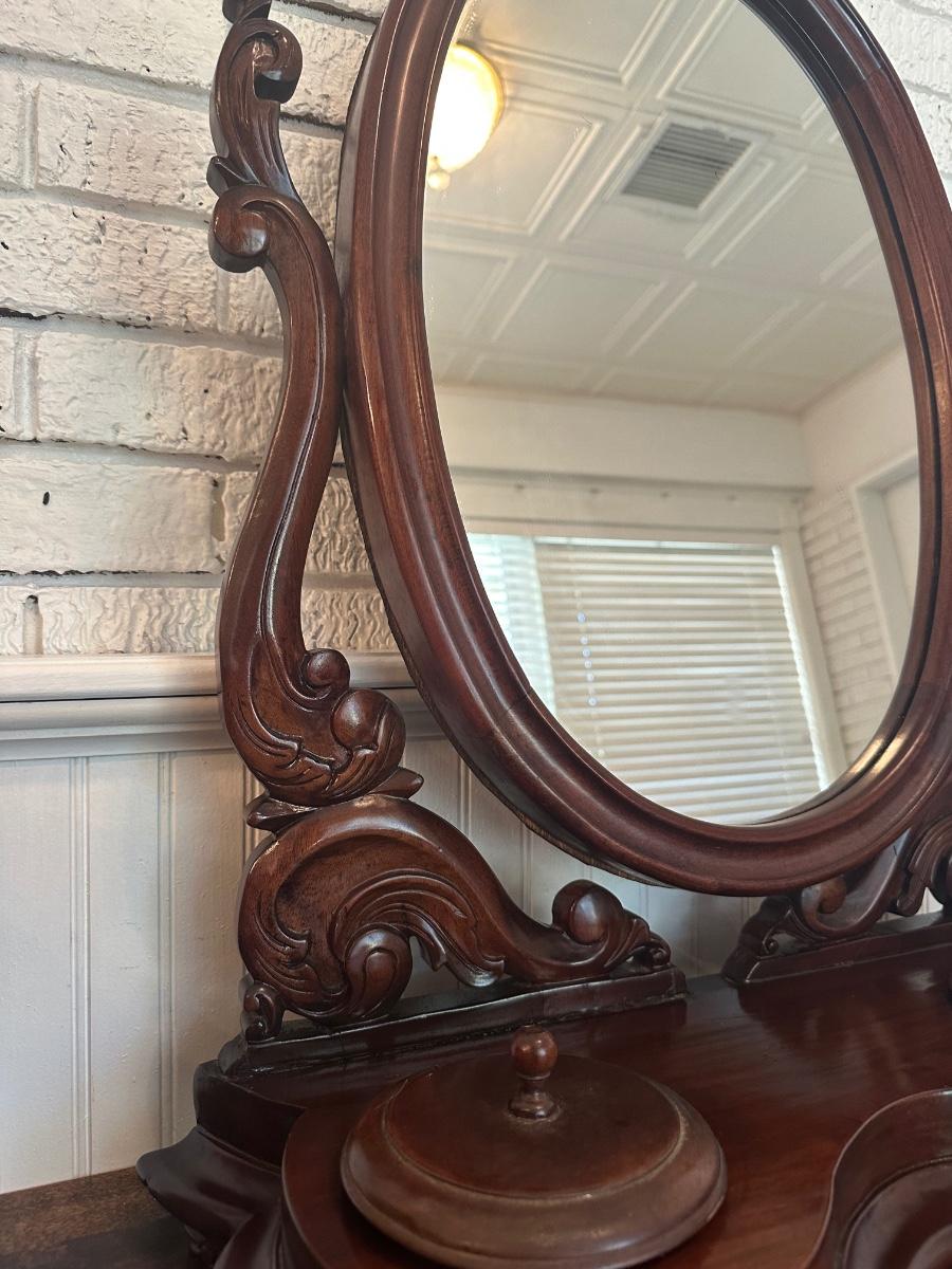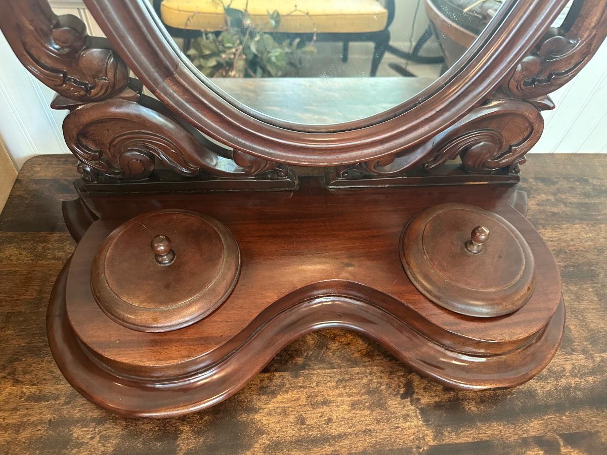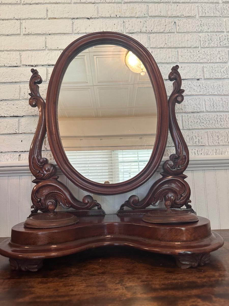 Victorian-style tabletop dresser mirror with carved wood frame and base, featuring two lidded trinket wells.