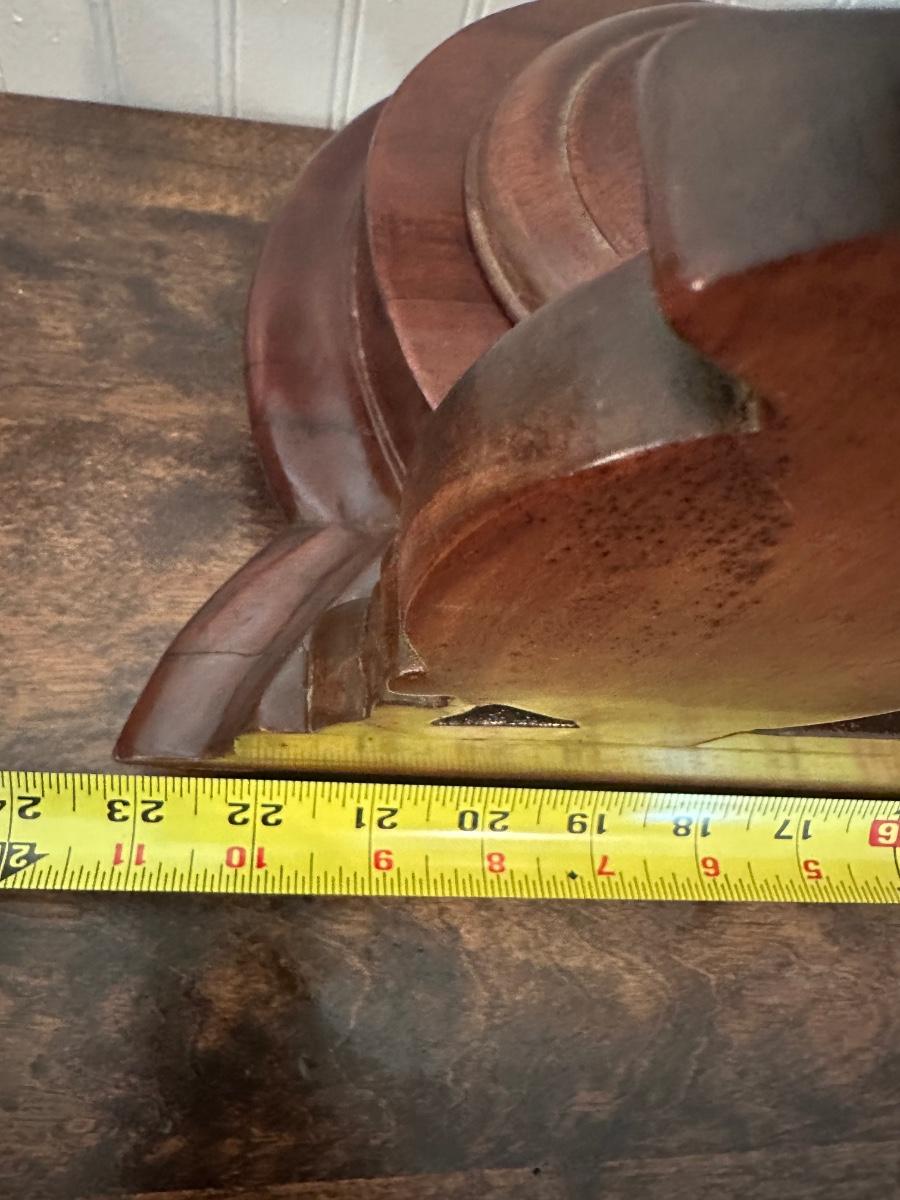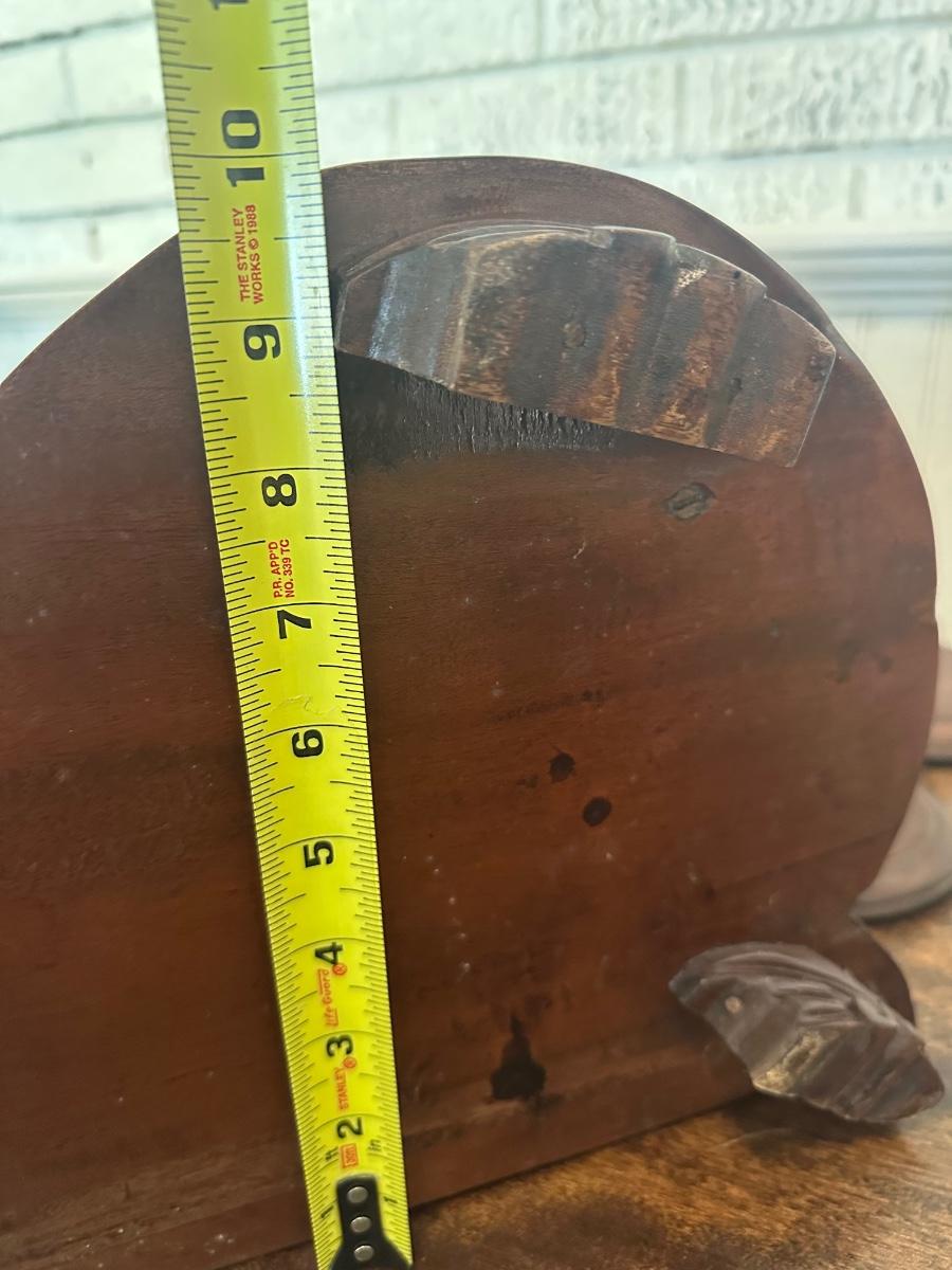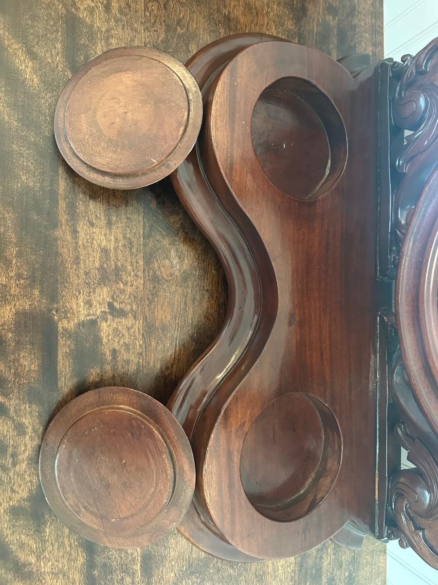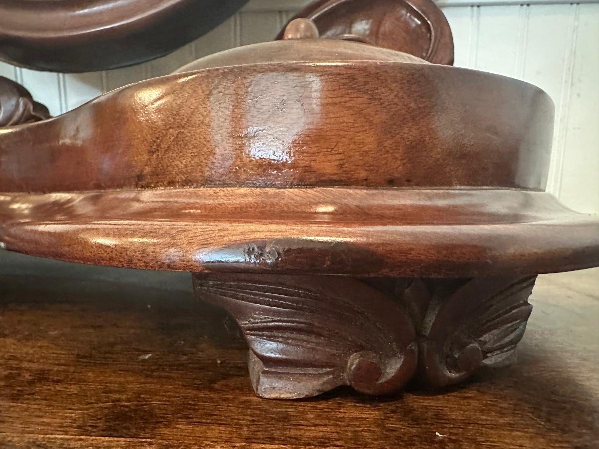 Victorian-style tabletop dresser mirror with carved wood frame and base, featuring two lidded trinket wells.