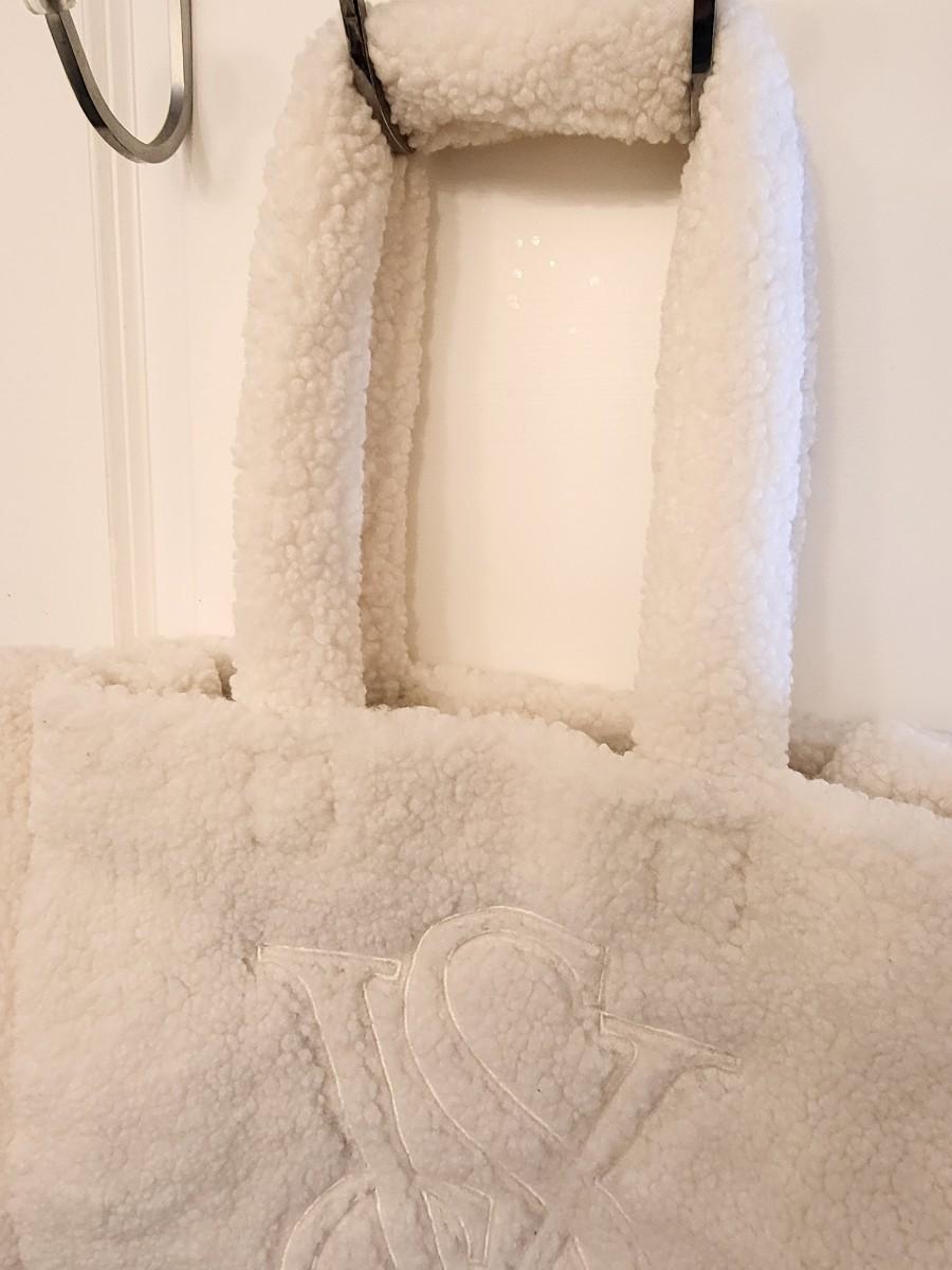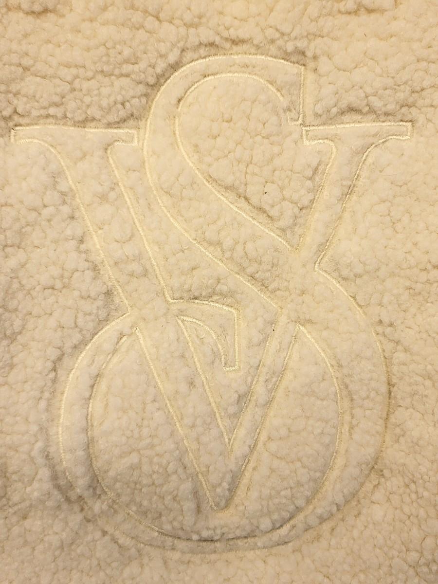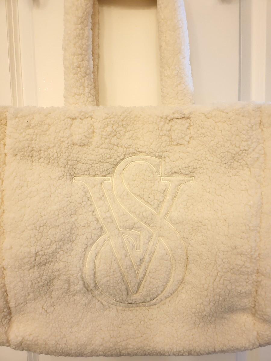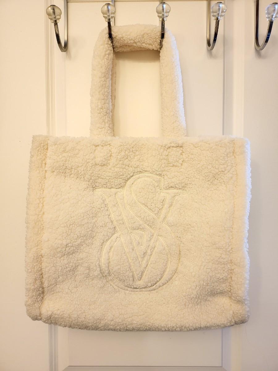 Victoria's Secret sherpa tote with nylon lined interior. Measures 17" wide x 13" tall x 4" deep. Double straps 7.5" length. Single interior compartment & pocket. Like-new condition.