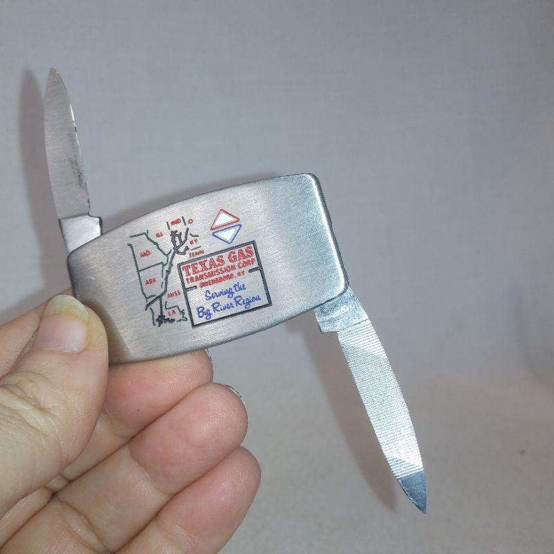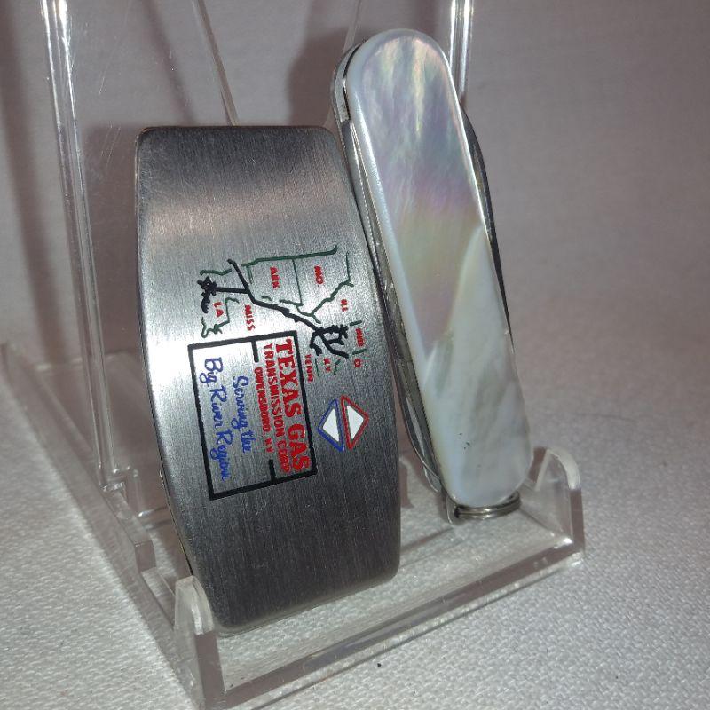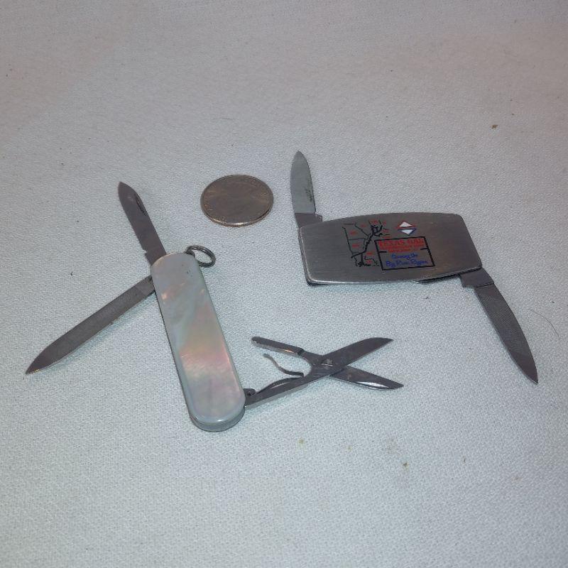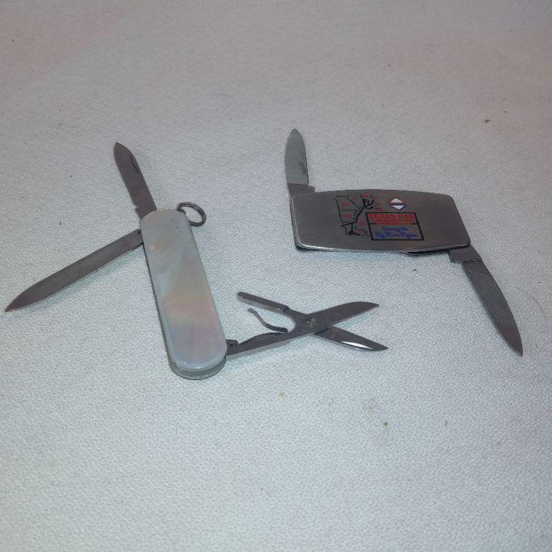 The Mother of Pearl Pocket Knife is made by Victoninox in Switzerland - Same company that makes Swiss Army Knives. This one is considered a Ladie's Knife with scissors and nail file. Closed it measures 2 1/4-inches long. The Zippo Pocket Knife is very slim and is also an advertising piece for Texas Gas. When closed it measures 2-inches long. Both are in very good condition.