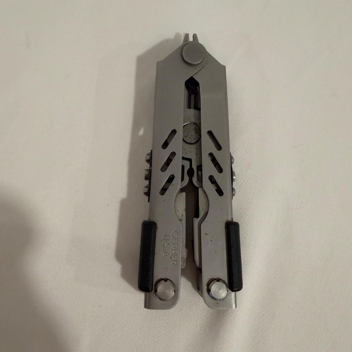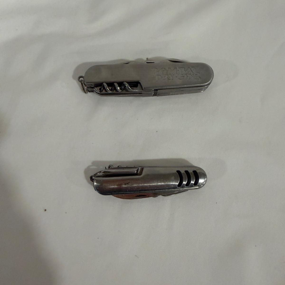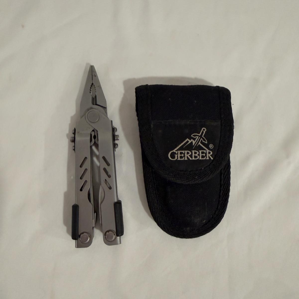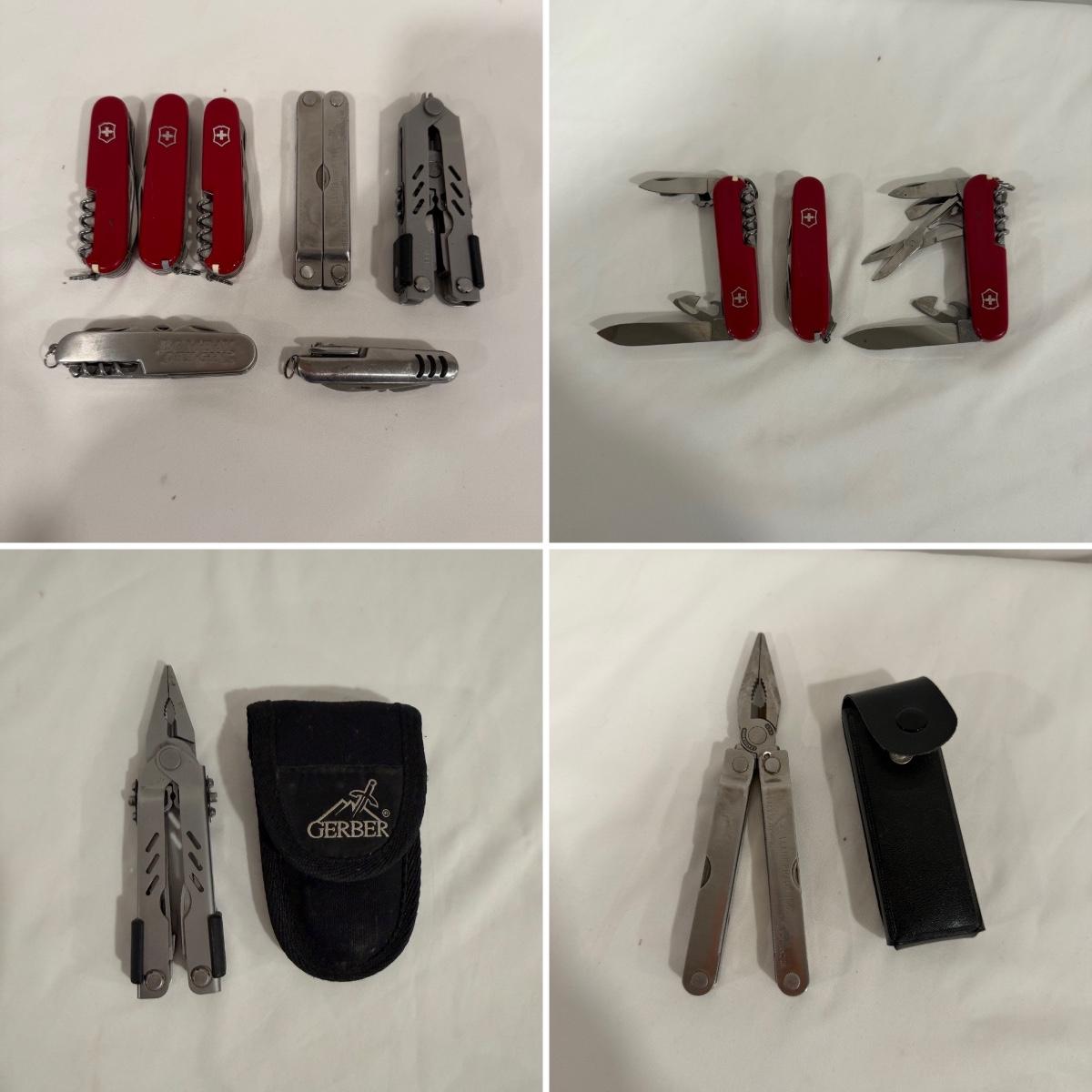 Lot includes three Victornox Swiss Army Knives, Gerber multipurpose tool, Leatherman and two knives. The Gerber knife folded measures approximately 4".