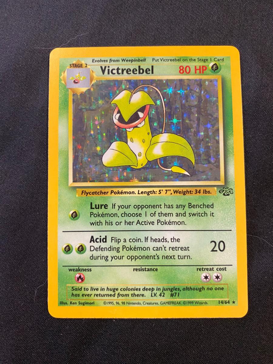 This is a holo Victreebel card from the Jungle set in the Pokemon Trading Card Game. The card displays the set number 14/64 at the bottom. It features a holographic foil background and has an 80 HP rating. The card condition is rated as light play, indicating minor signs of wear while maintaining overall integrity.
