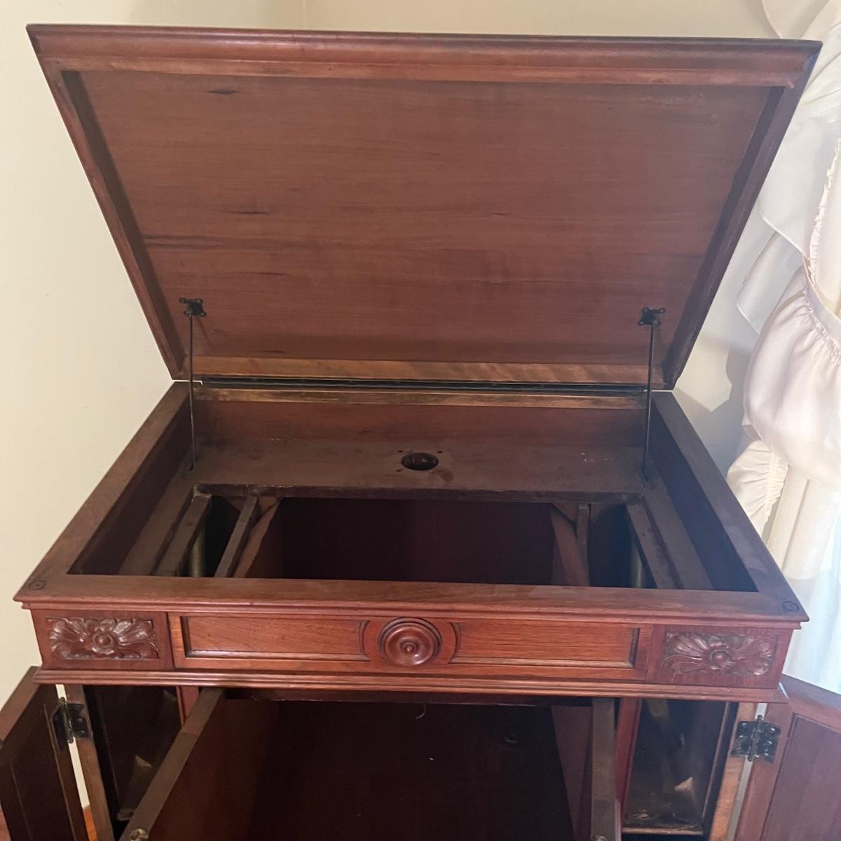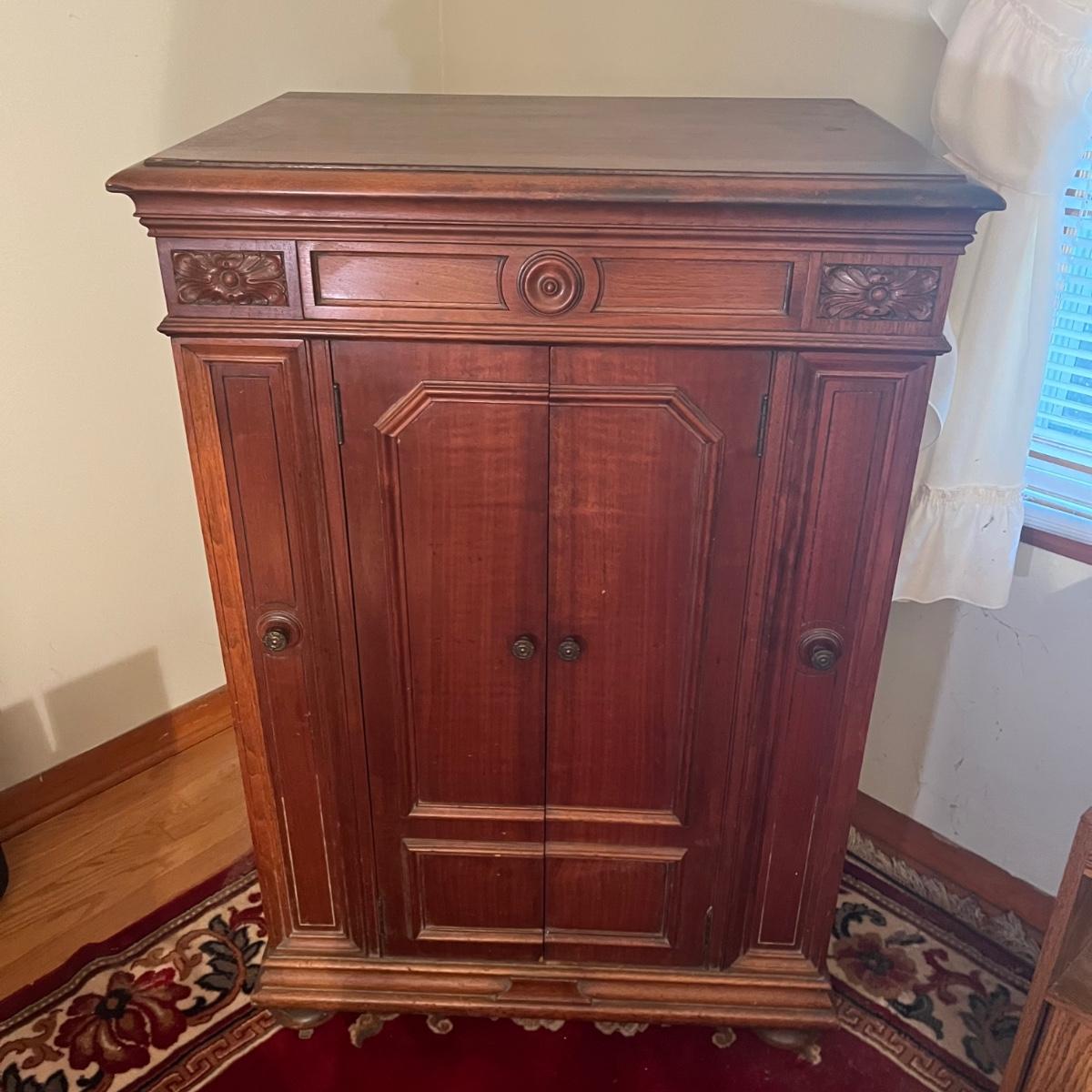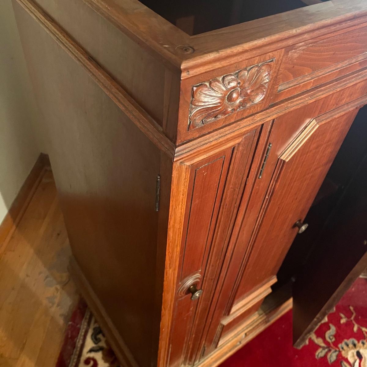 Lot includes a Victrola Credenza that is missing all the Victrola parts. Piece is solid. It has some scratches and nicks, see pictures. Credenza measures 22” x 32” x 46”. Bring help item is substantial.