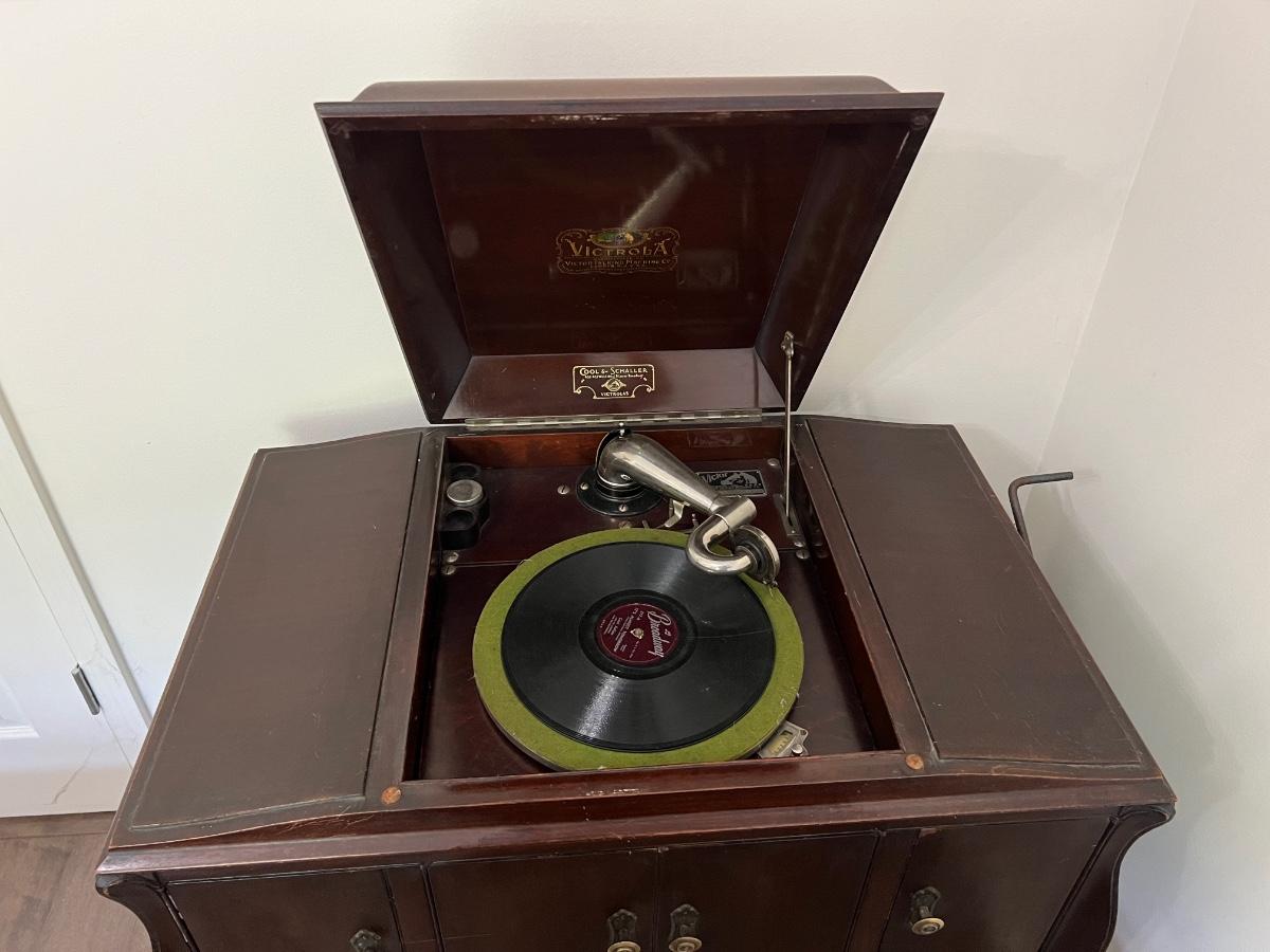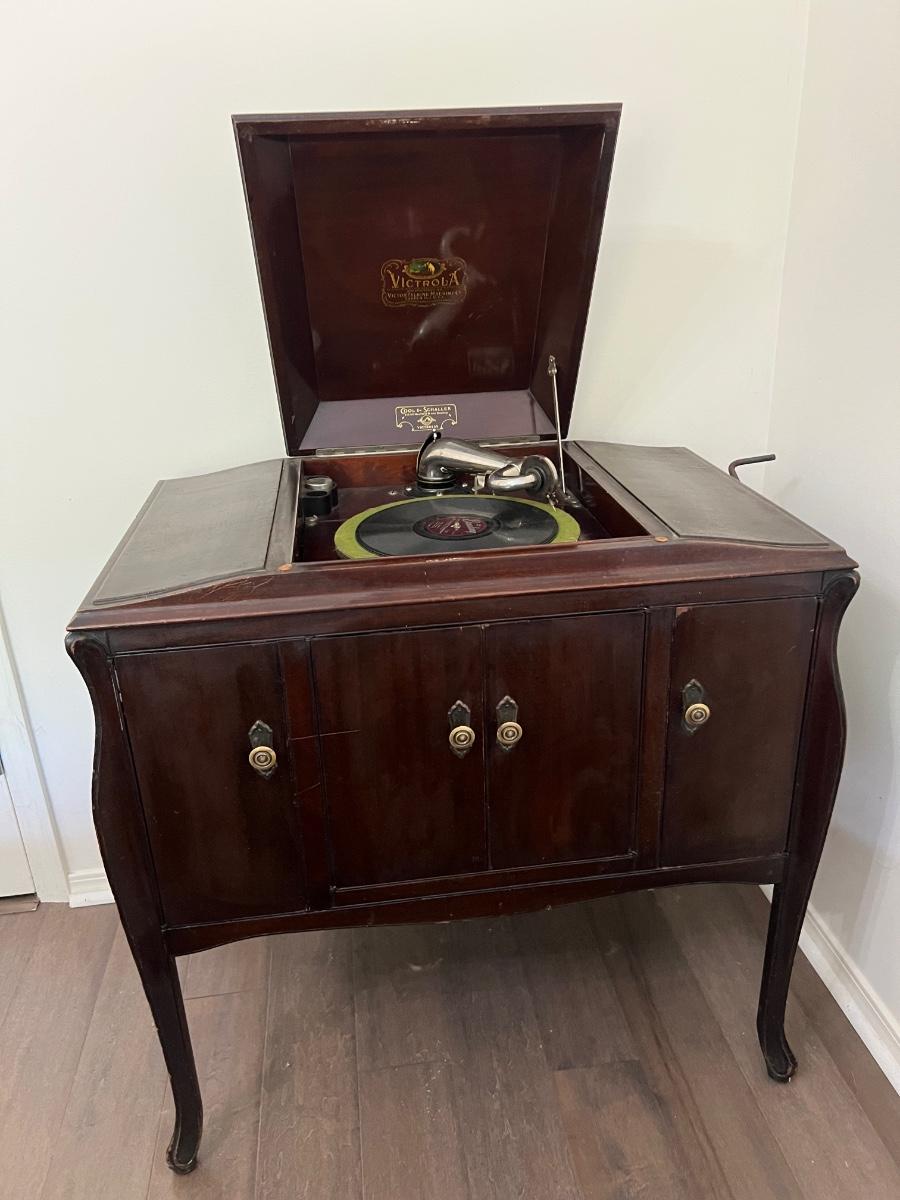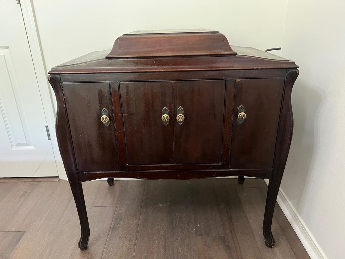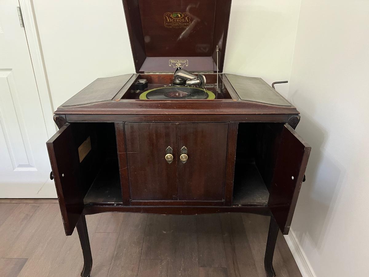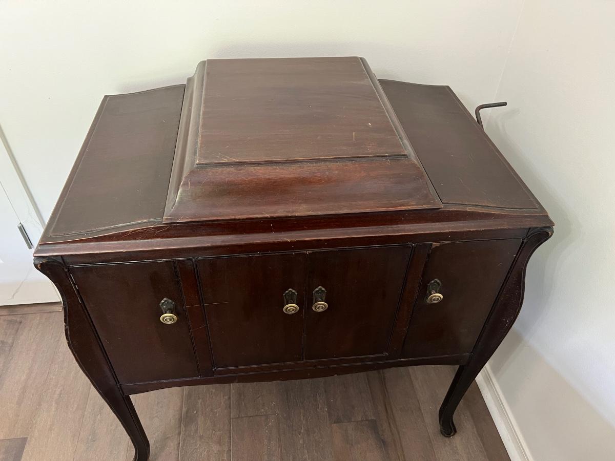 Classic victrola talking machine vv 260 8294 does hand crank and does spin the record however the record does not produce music. Measures fully open at 51 inches tall. When closed measures 36 inches tall, 33 inches wide and 20 inches deep. Bottom, right cabinet will need some repair on the bottom hinge when it is open.