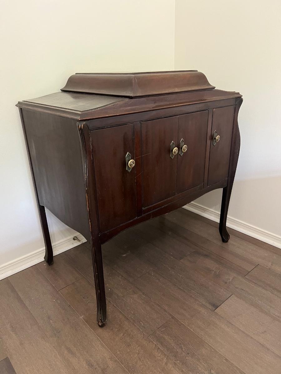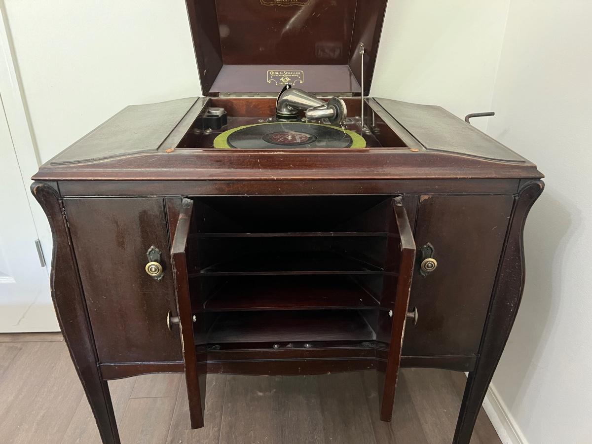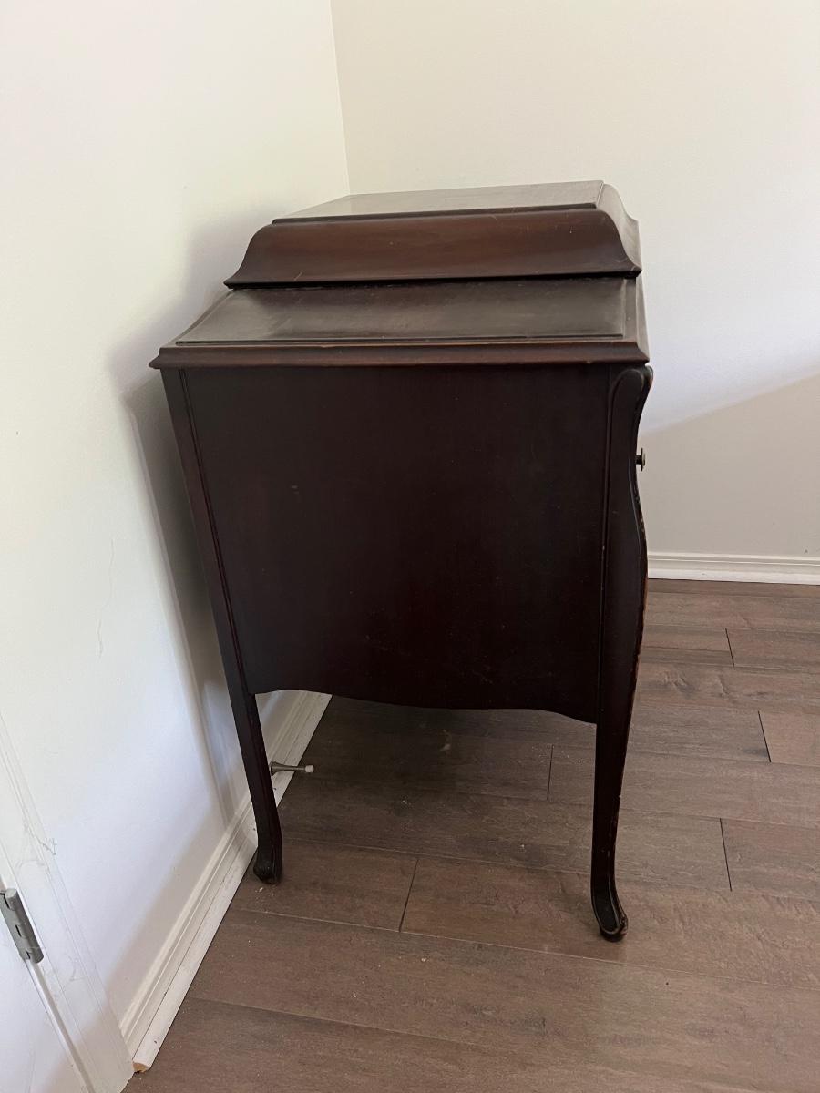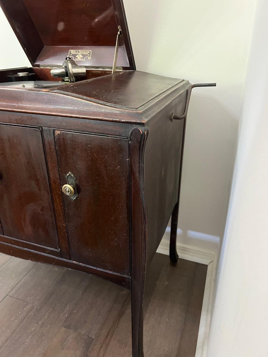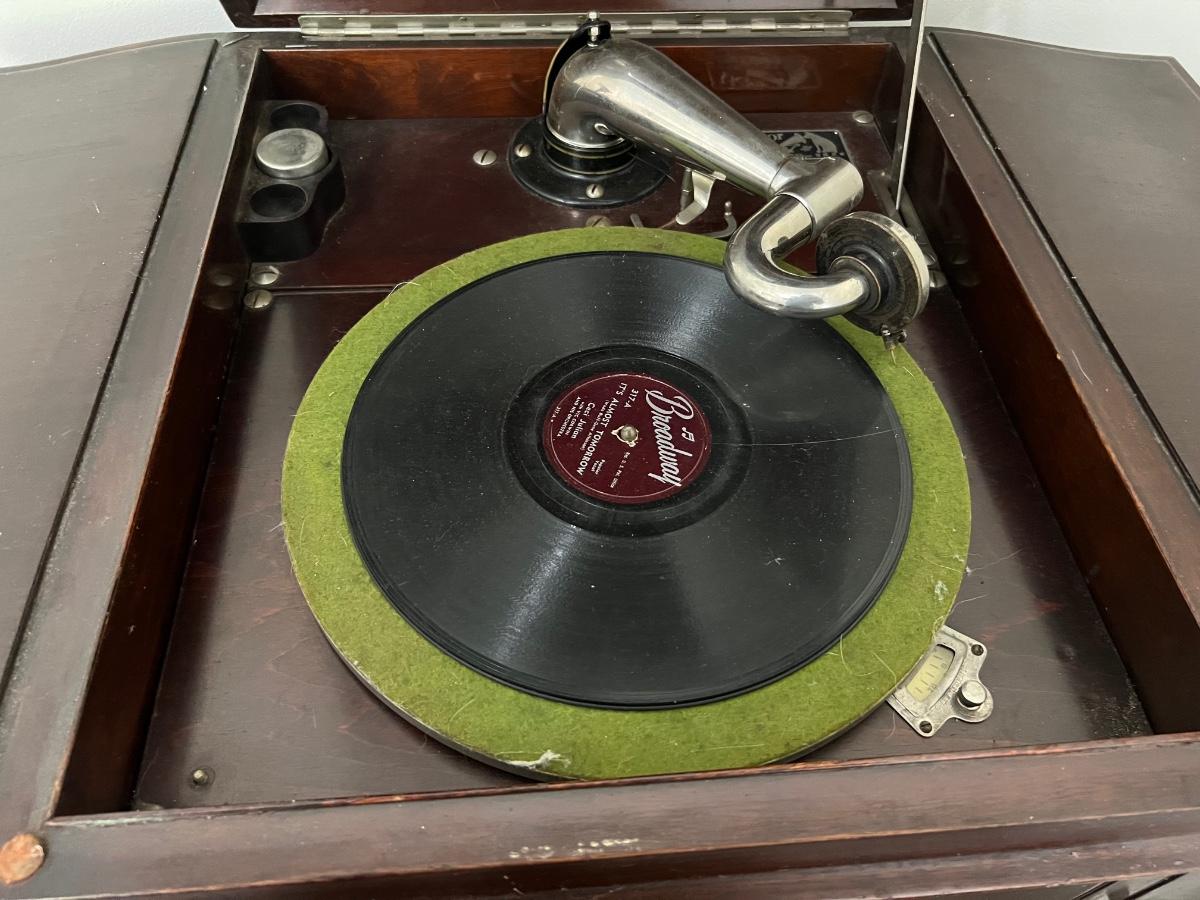 Classic victrola talking machine vv 260 8294 does hand crank and does spin the record however the record does not produce music. Measures fully open at 51 inches tall. When closed measures 36 inches tall, 33 inches wide and 20 inches deep. Bottom, right cabinet will need some repair on the bottom hinge when it is open.